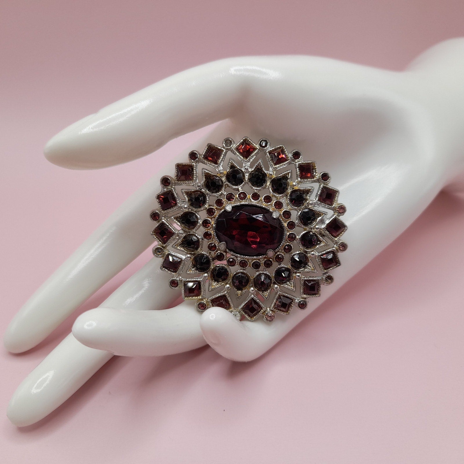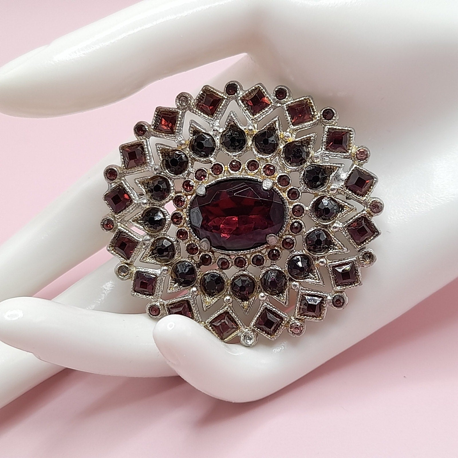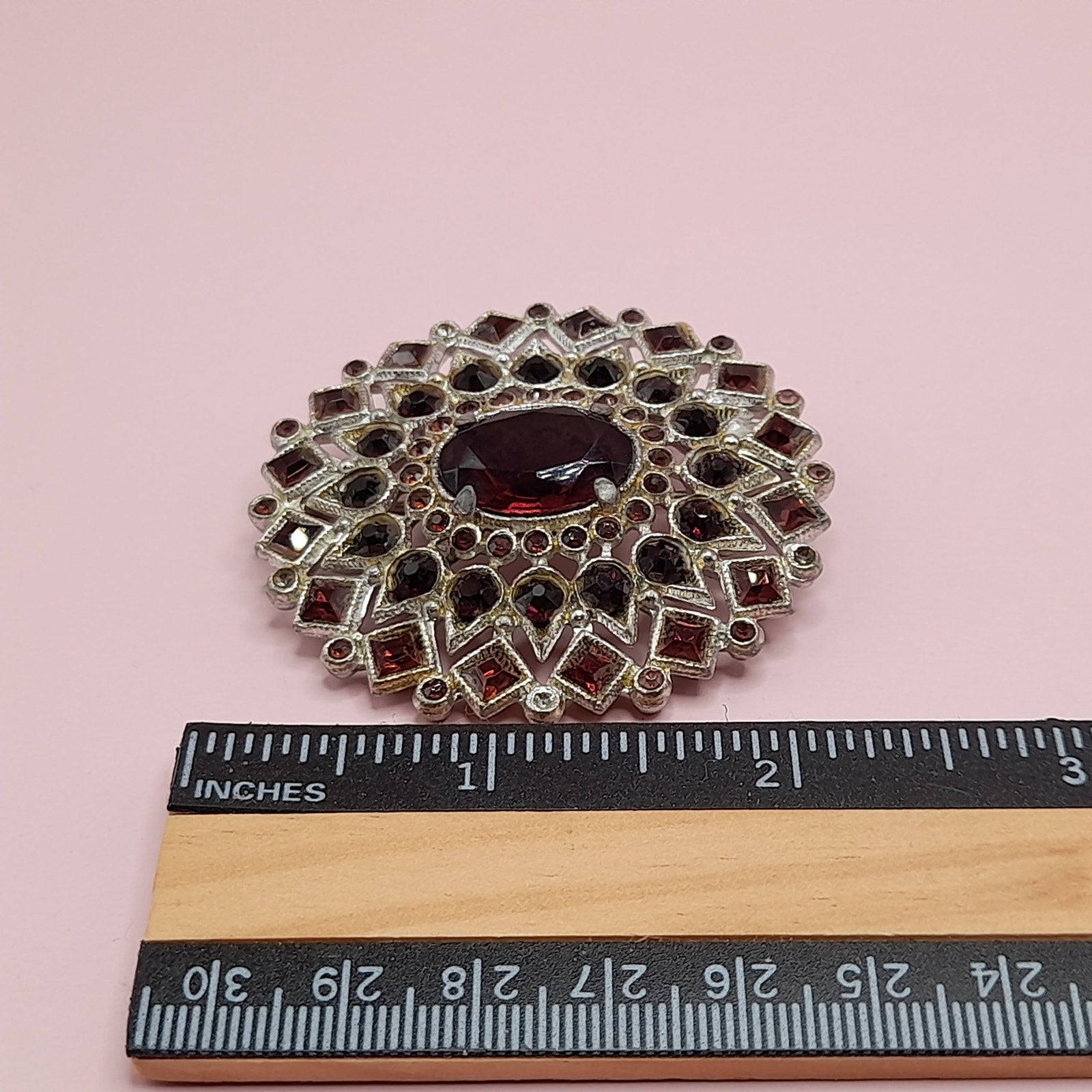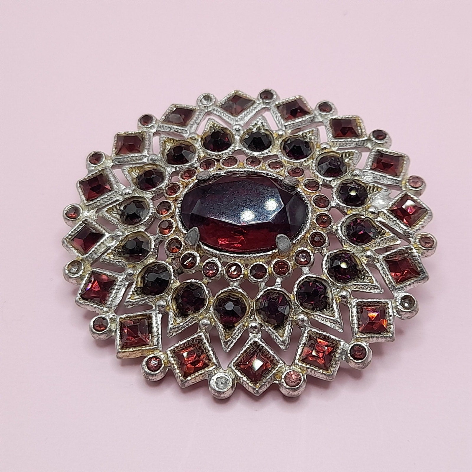 Description: This is a beautiful 1930s purple rhinestone pot metal brooch with a center purple large faceted glass stone and surrounded by hand cut purple glass rhinestones in square and round shapes. There are four tiny rhinestones missing along the edges but for almost 100 years old, it is in very good condition. The clasp is a C clasp. See photos for more clarification of details.