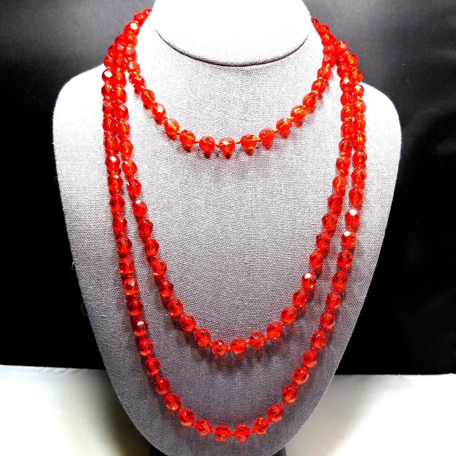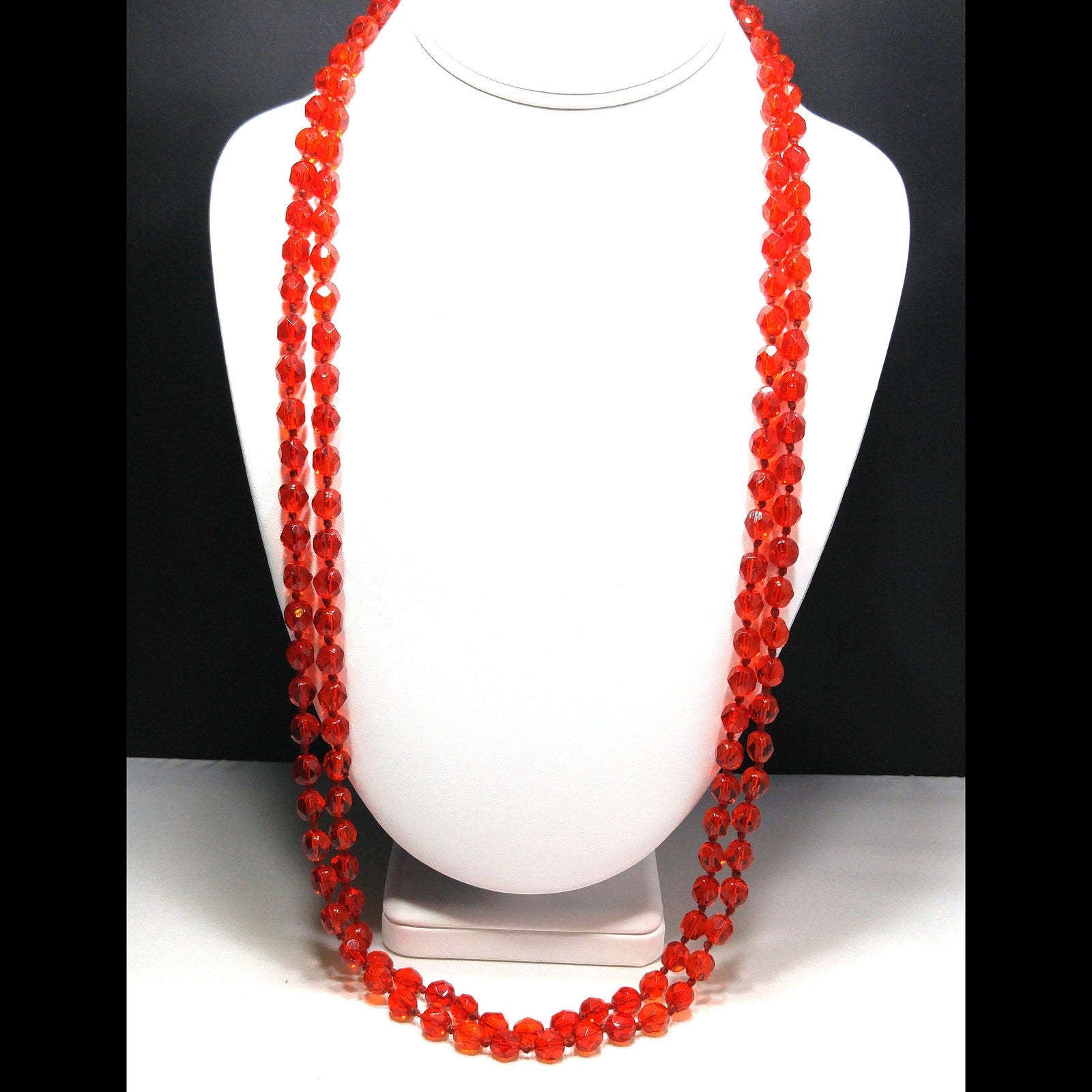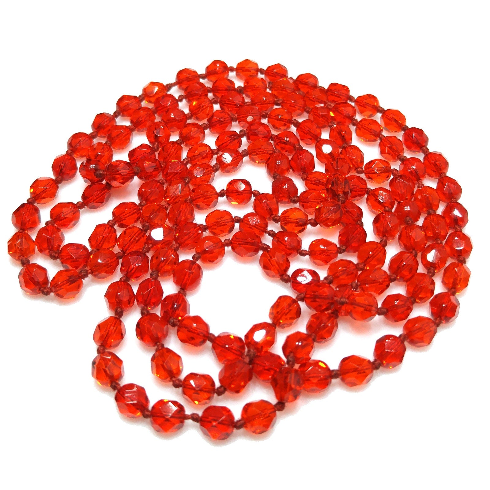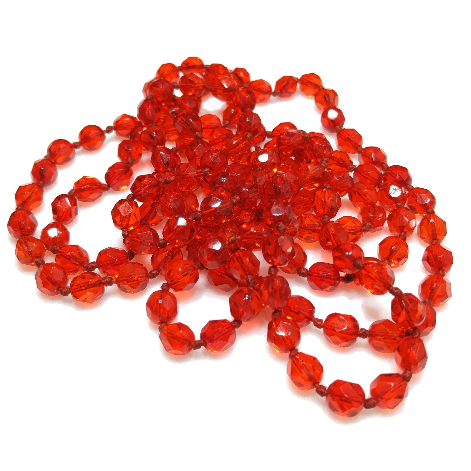 Vintage Red Crystal Hand Knotted Long Necklace, 62 Inches, No Clasp, 1960s Vintage Jewelry