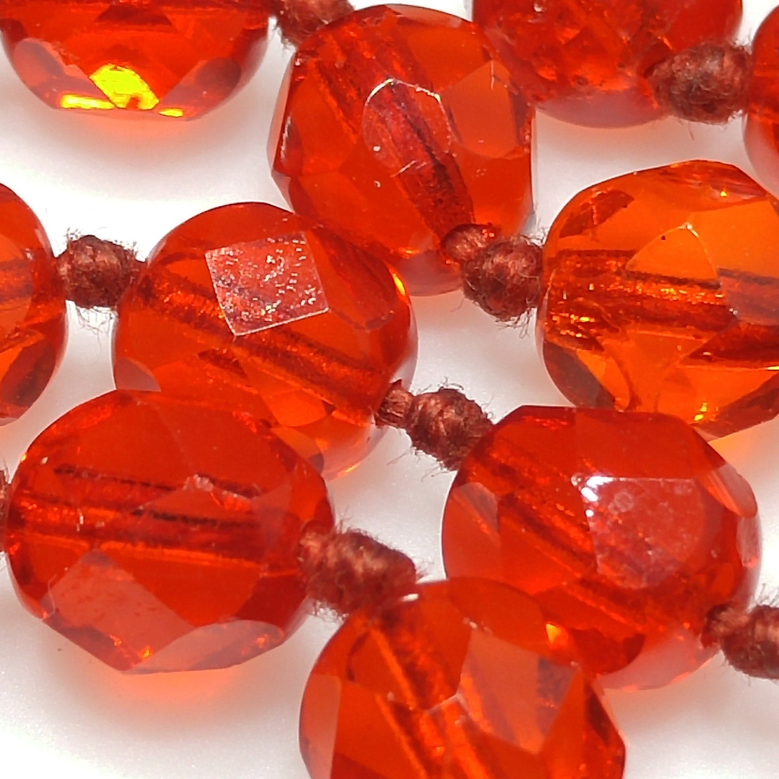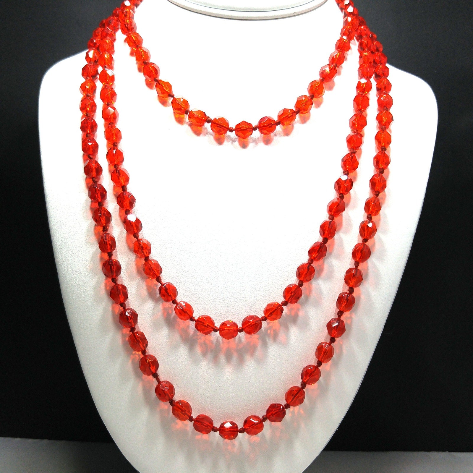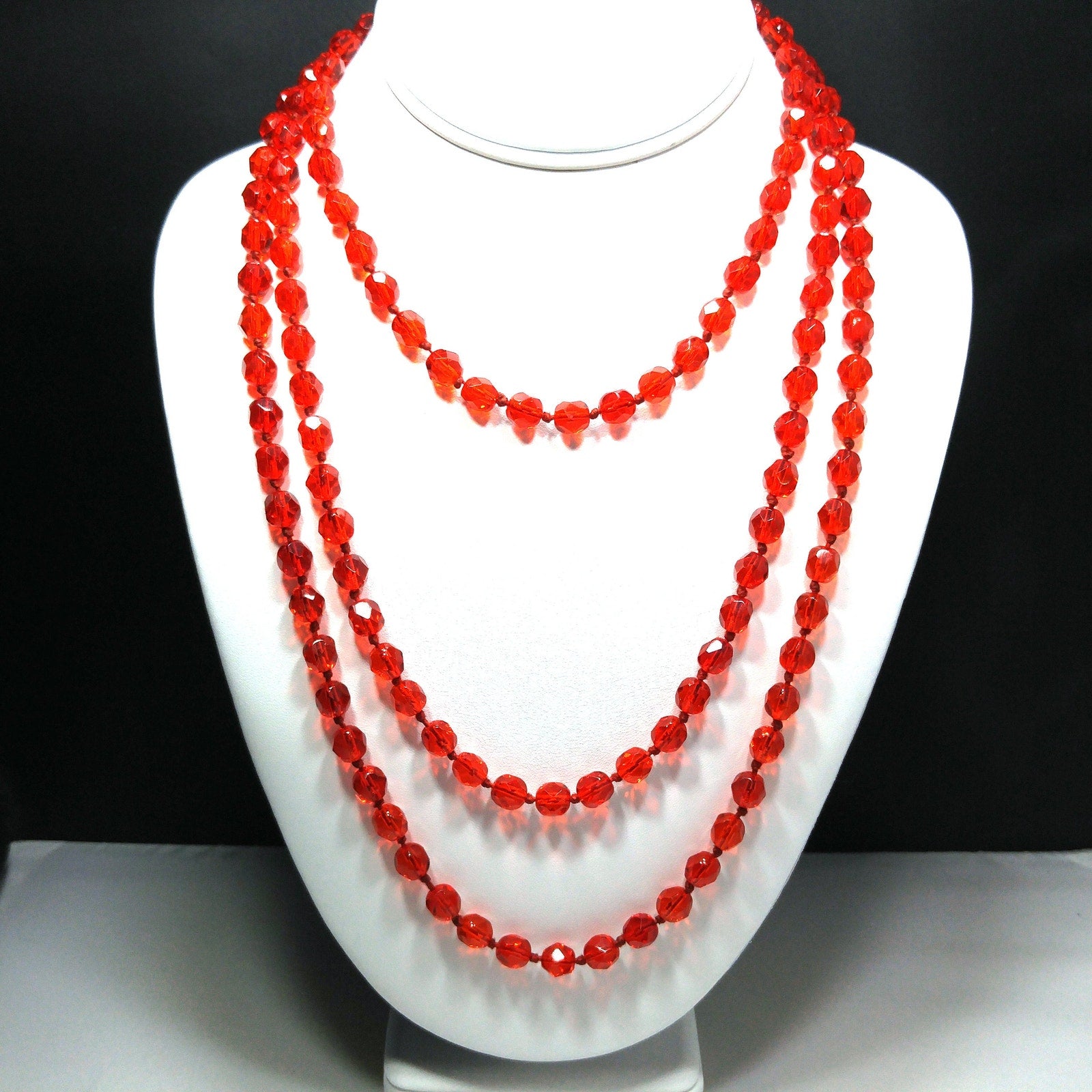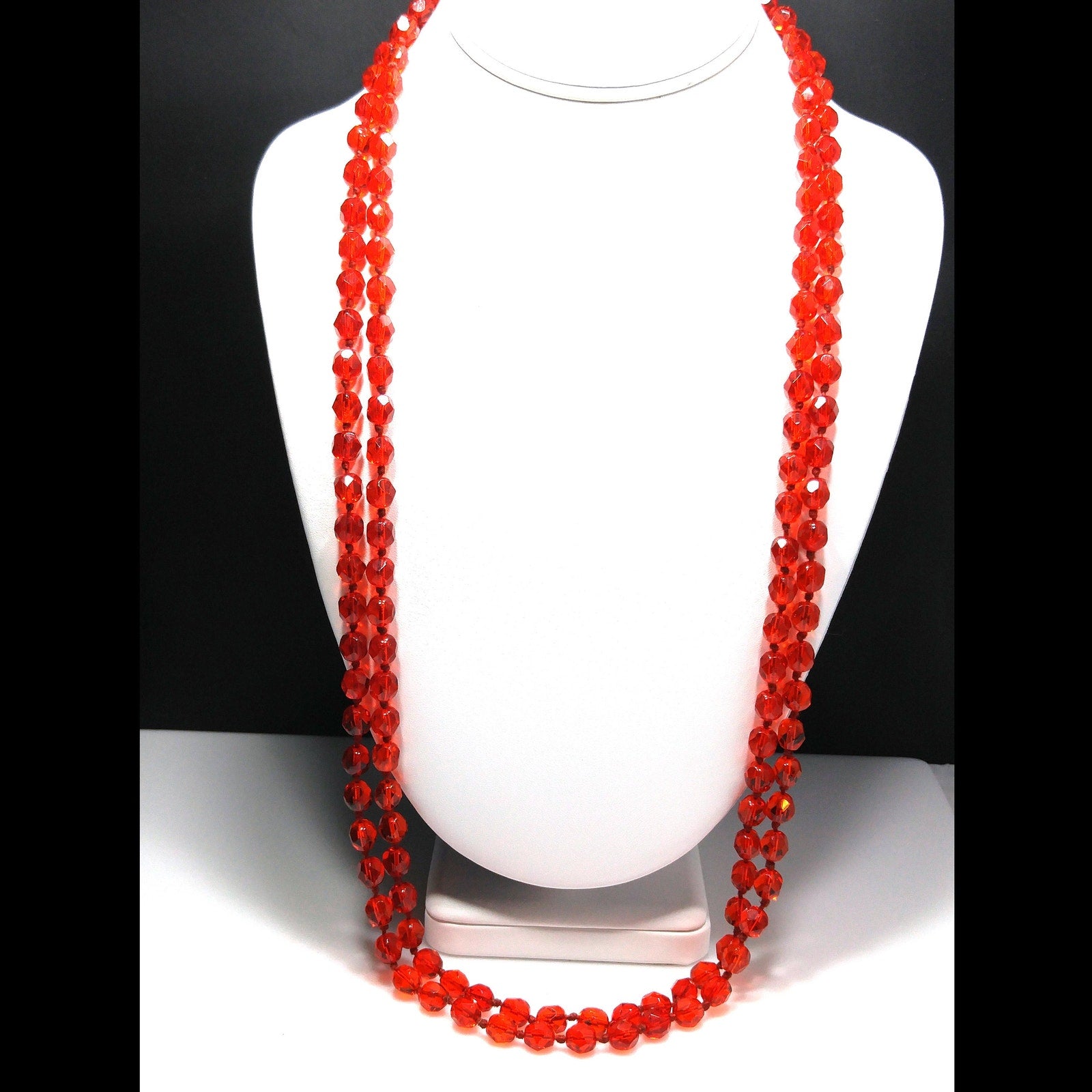 Vintage Red Crystal Hand Knotted Long Necklace, 62 Inches, No Clasp, 1960s Vintage Jewelry