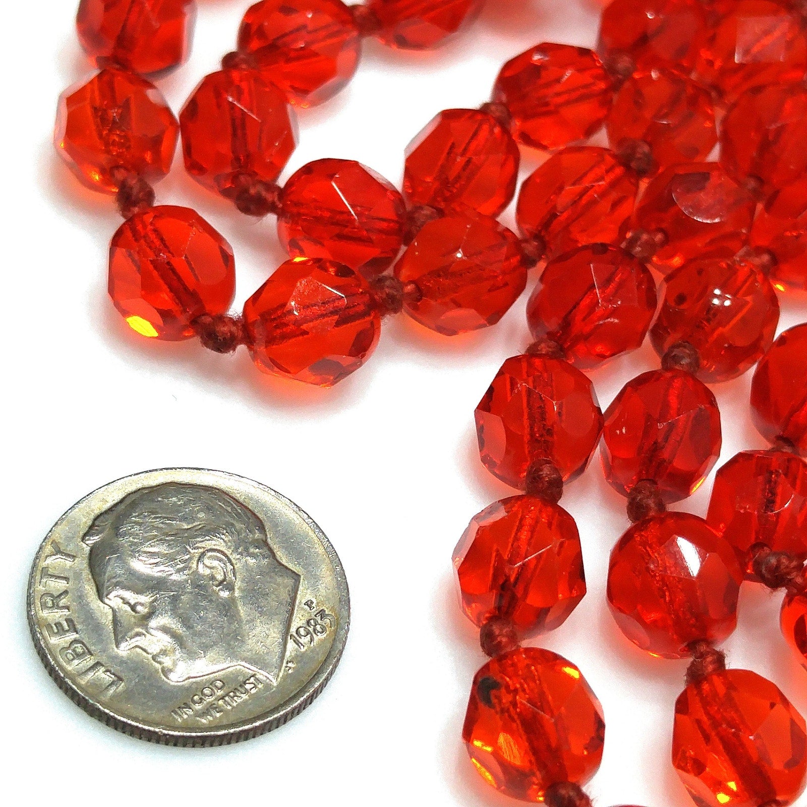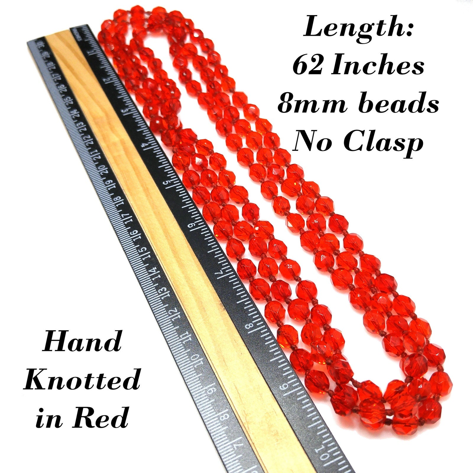 *Description: This is a beautiful long red vintage crystal necklace with red hand-knotted thread at 62 inches in length and 8mm beads from the 1960s. The long necklace may be worn in one strand, two, or three depending on putting it over your head without a clasp. The strength of the thread keeps every 8mm red crystal bead in place and all of your beads are secure. It is a beautiful long necklace and would be a great addition to your vintage jewelry collection or make a great vintage gift!