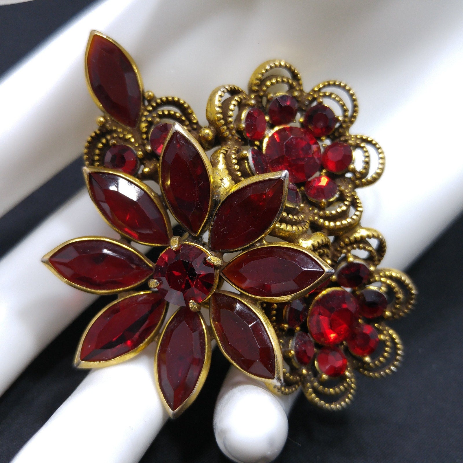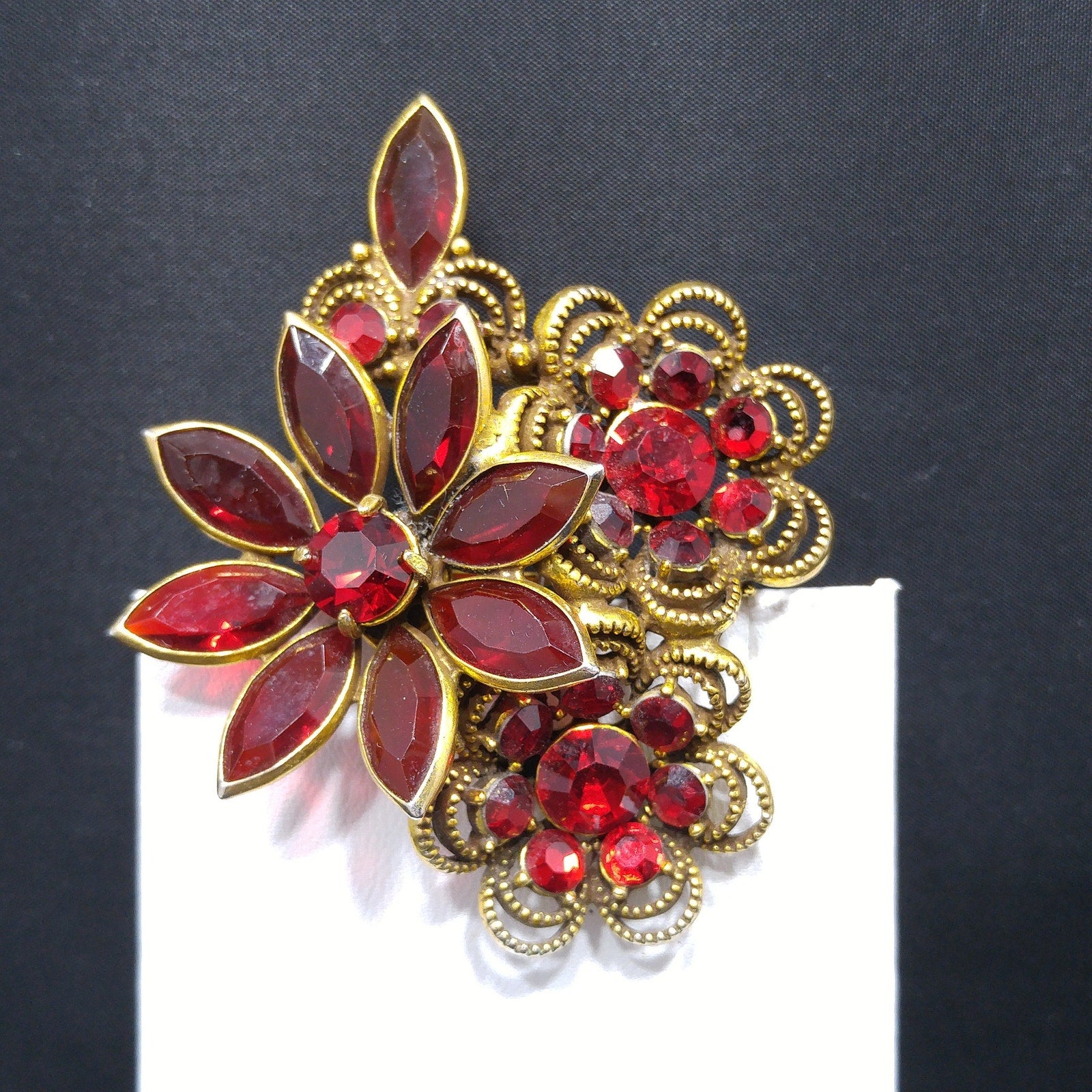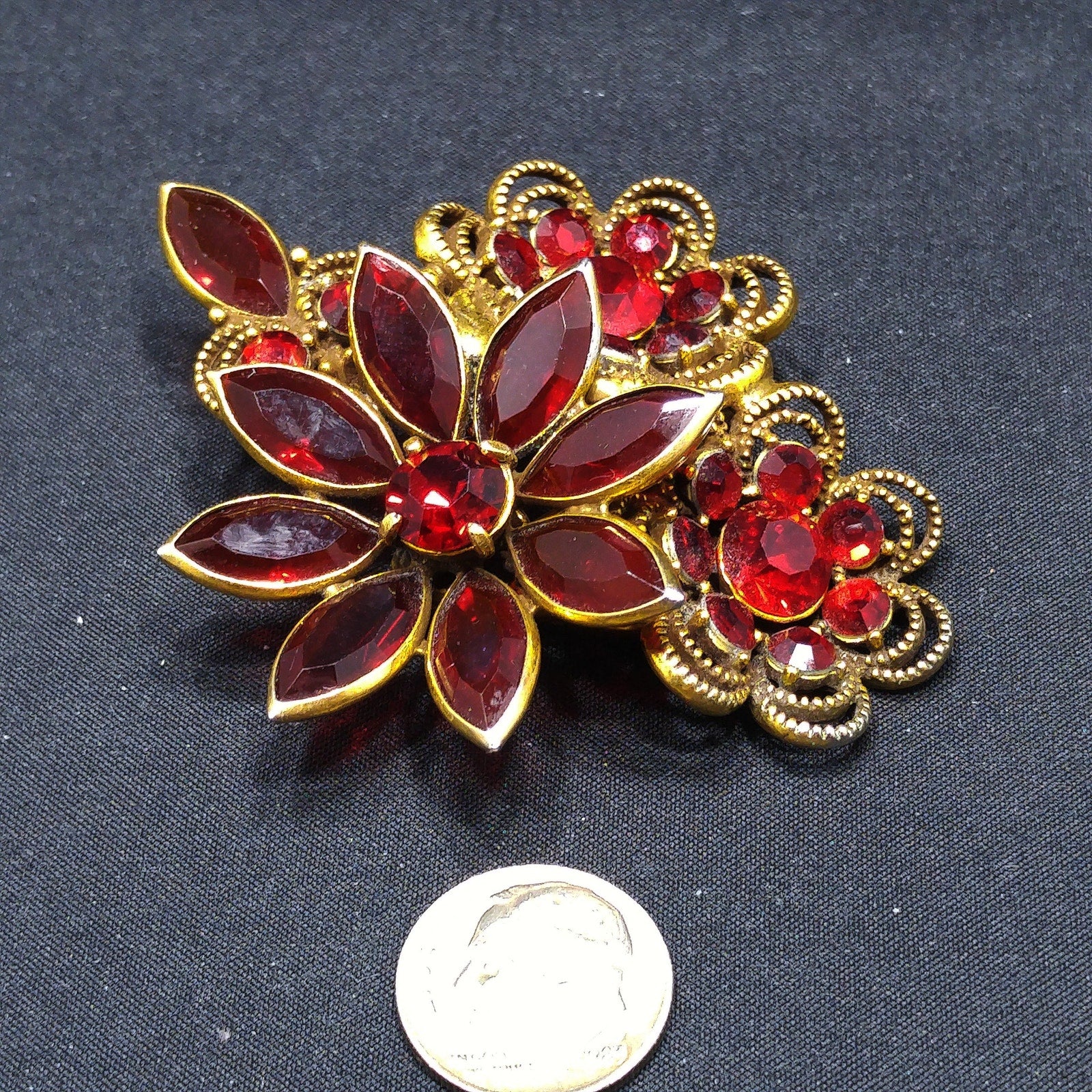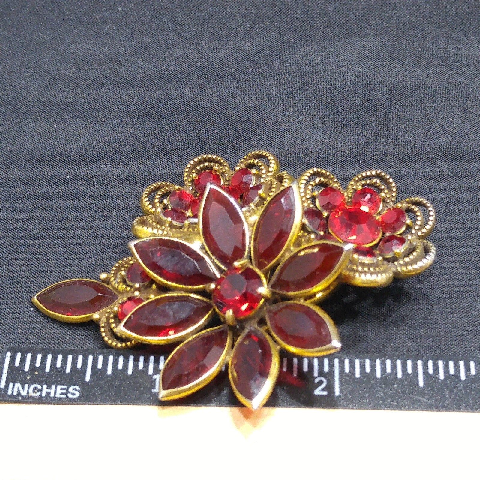 Vintage Red Crystal Rhinestone Floral Brooch, Antique Gold Plated, 1980s Vintage Jewelry