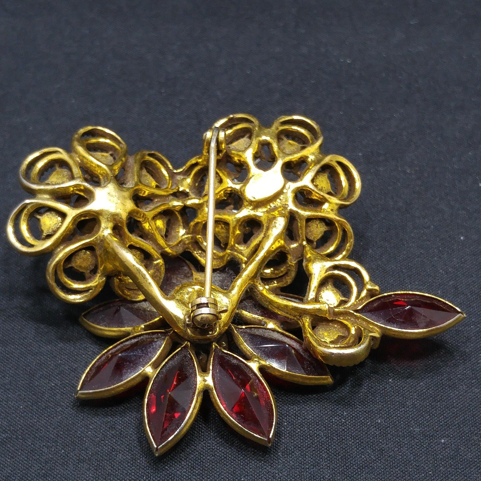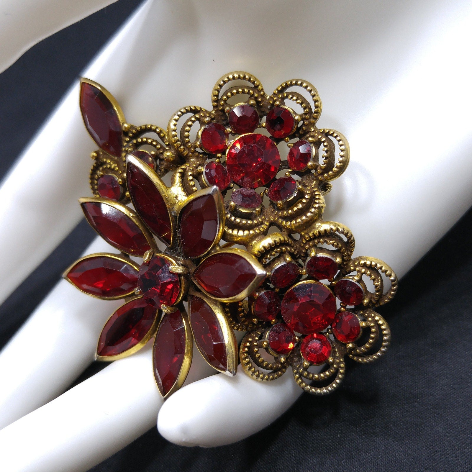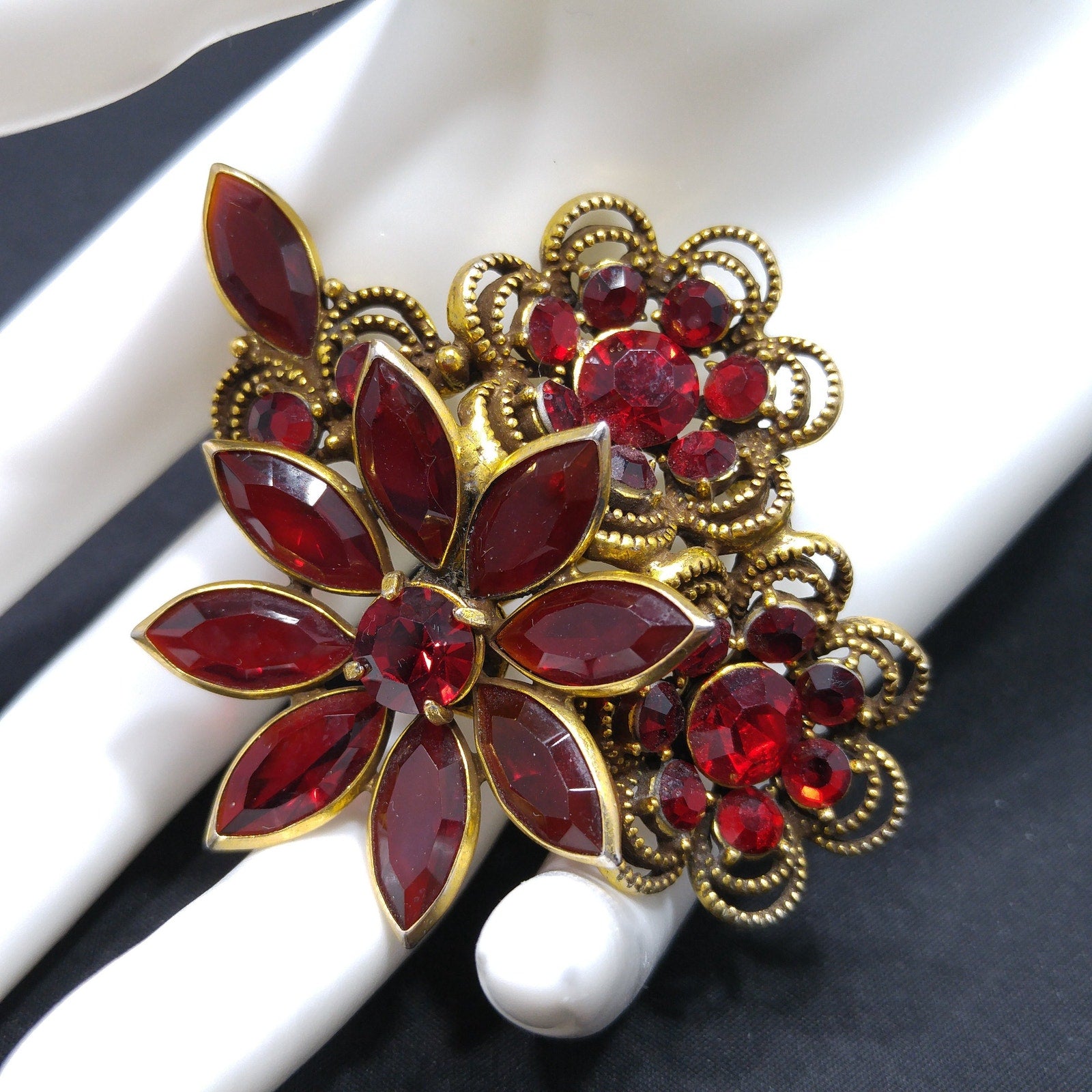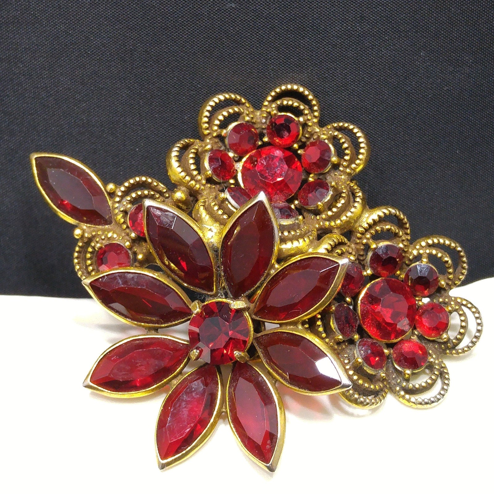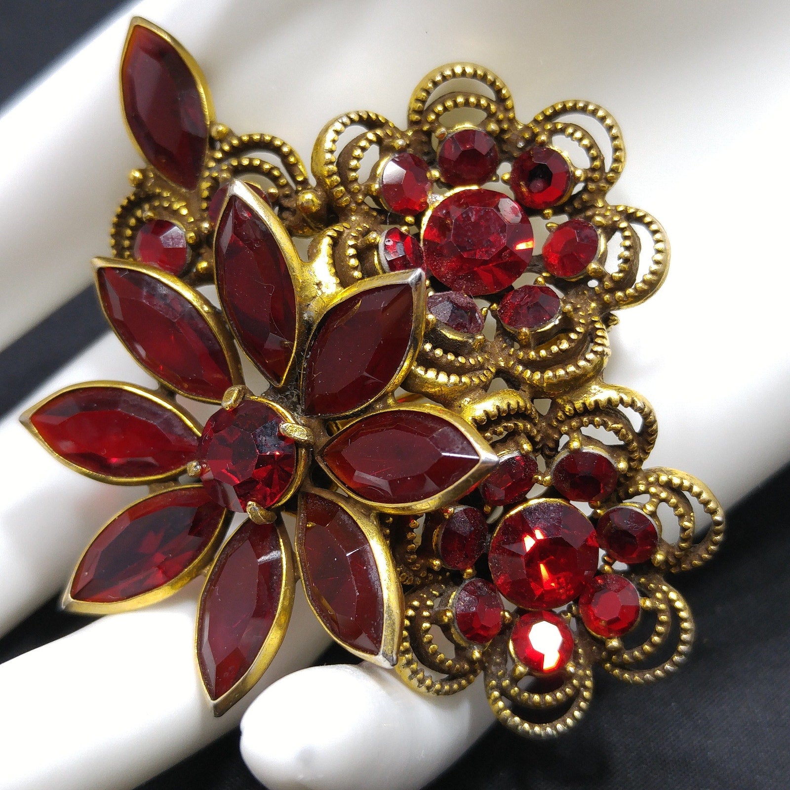 Vintage Red Crystal Rhinestone Floral Brooch, Antique Gold Plated, 1980s Vintage Jewelry