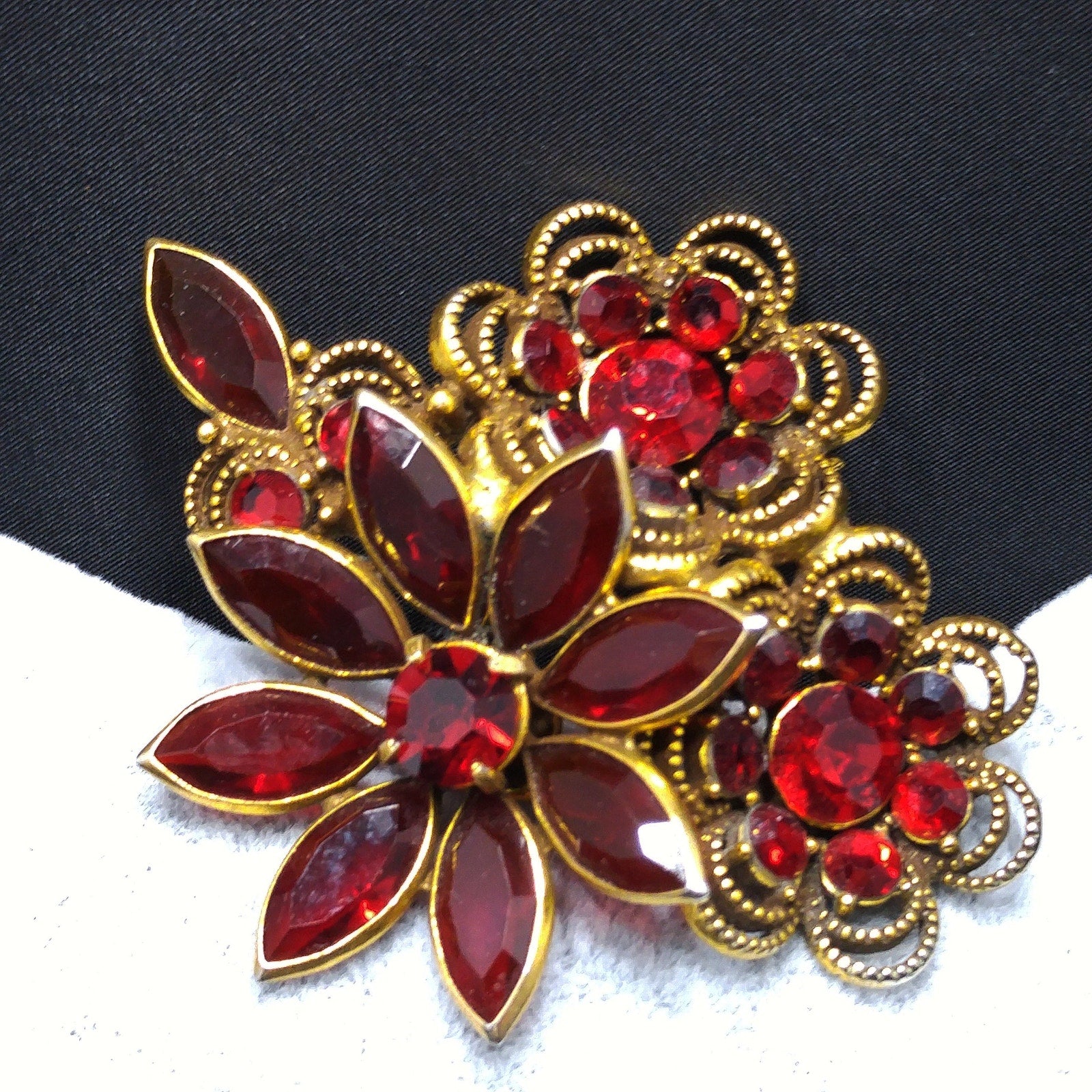 *Description: This is a beautiful floral red rhinestone and antique gold plated brooch from the 1980s to 1990s. The rhinestones appear to be Swarovski bezel set crystals with matching garnet red rhinestones. The rhinestones are a deep red which look beautiful on this antique finish gold plated backing. This would be a great addition to your vintage jewelry collection or make a great vintage gift!