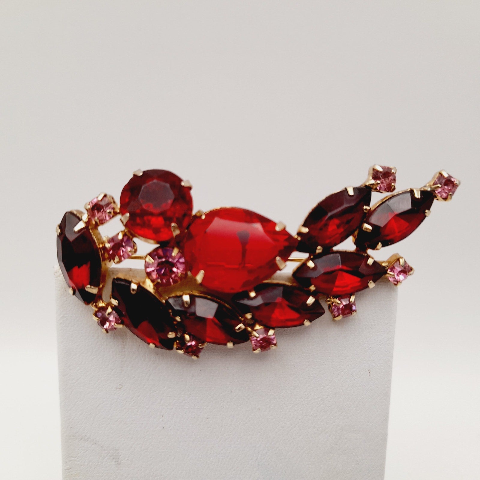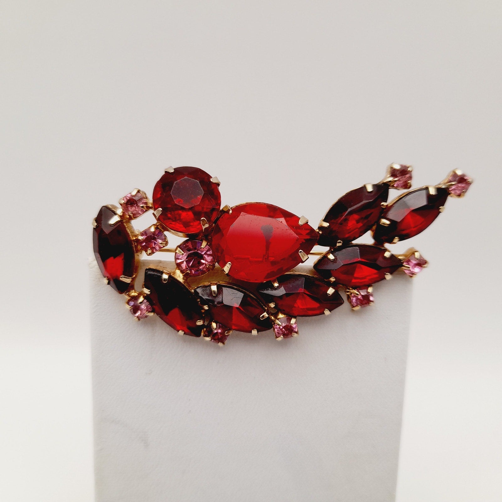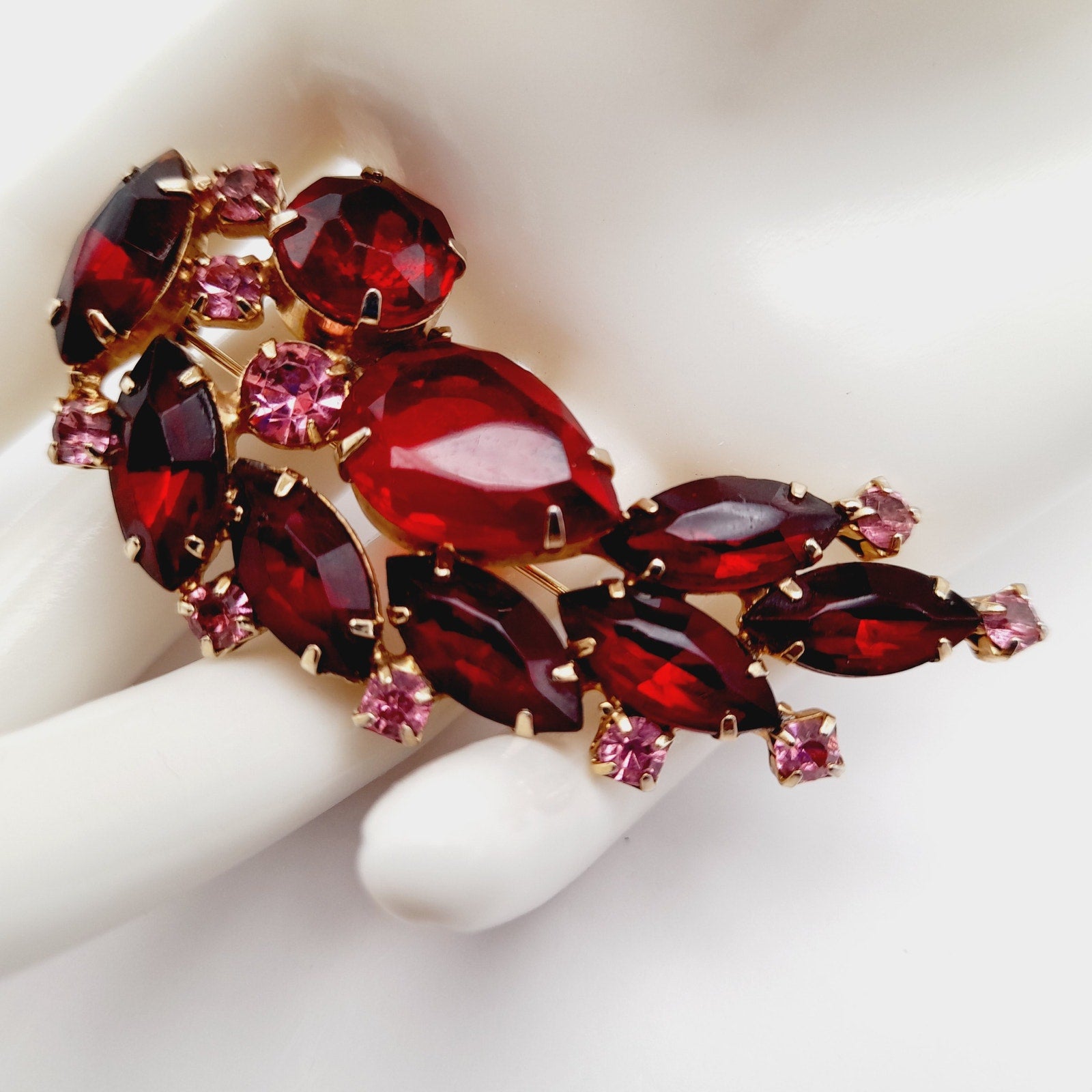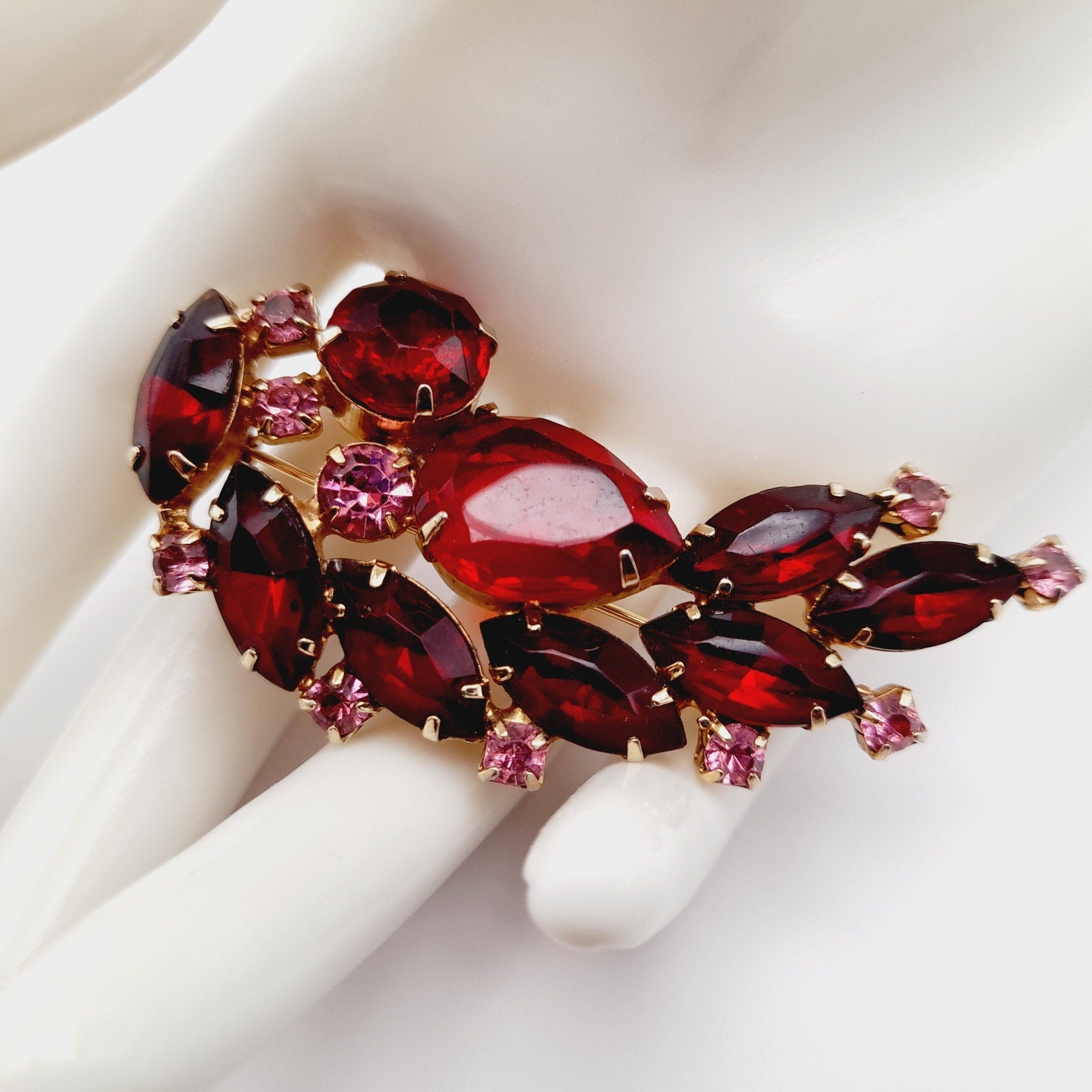 Add a touch of vintage elegance to your outfit with this beautiful red and pink rhinestone floral spray brooch! This stunning piece is in very good vintage condition and features a delicate floral design with sparkling rhinestones.