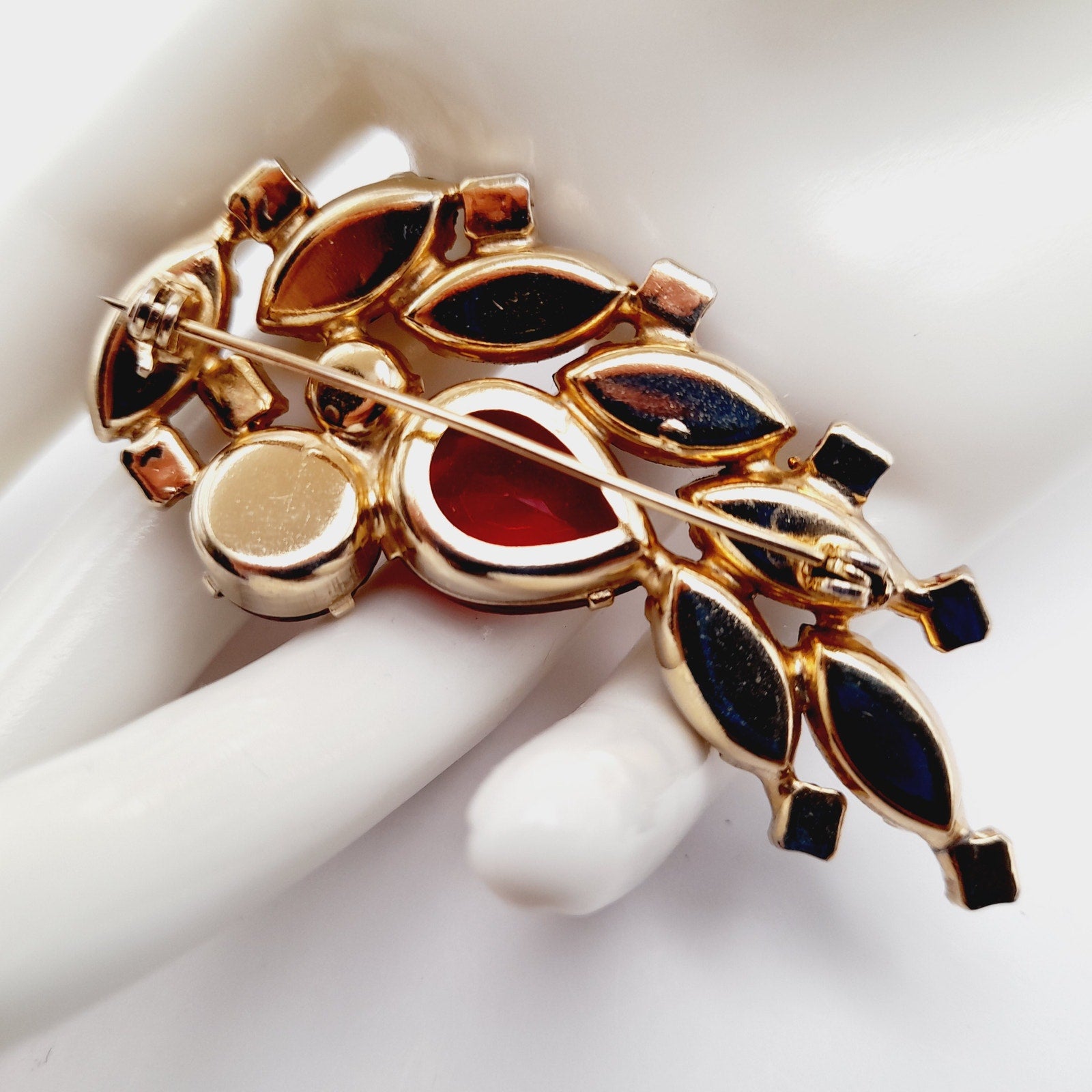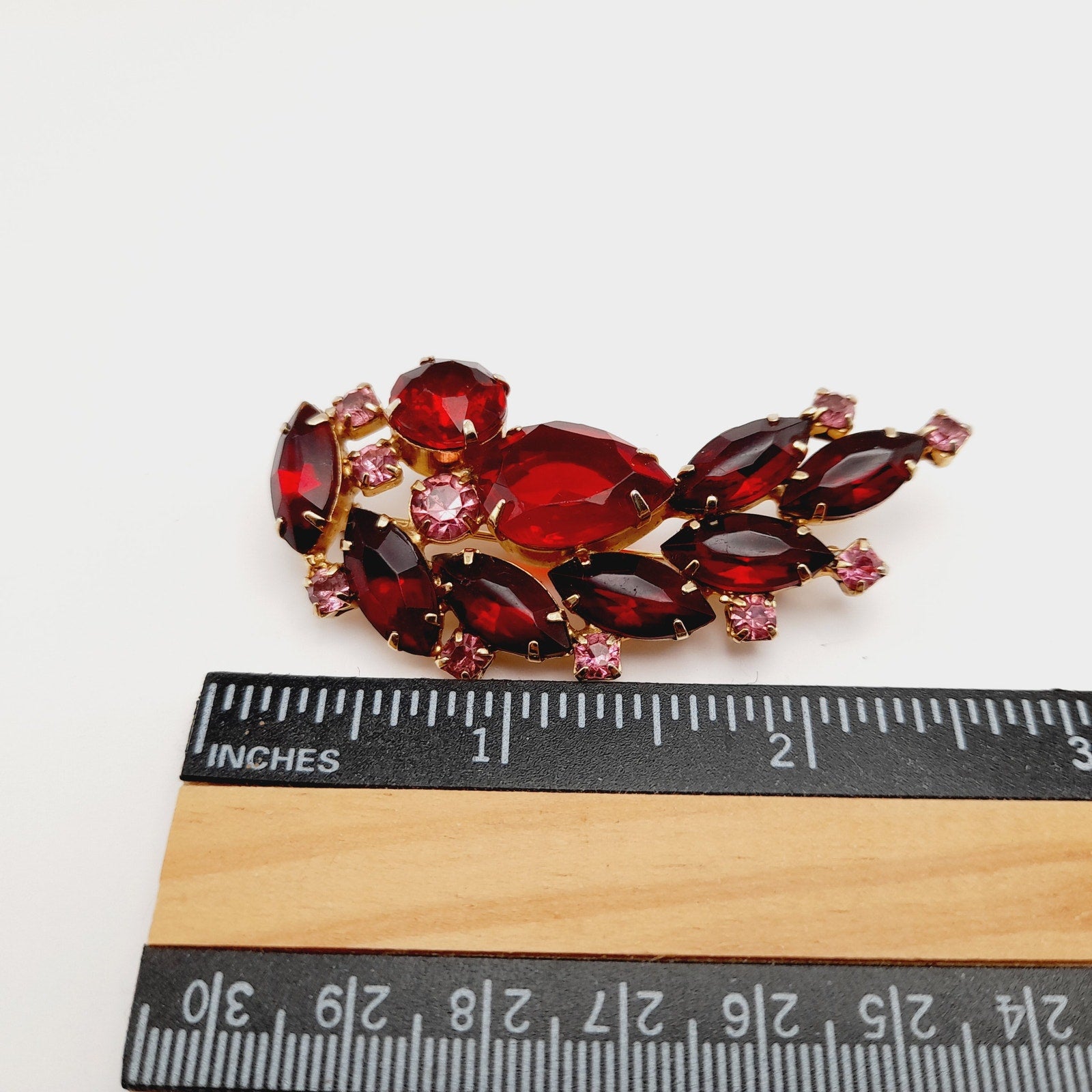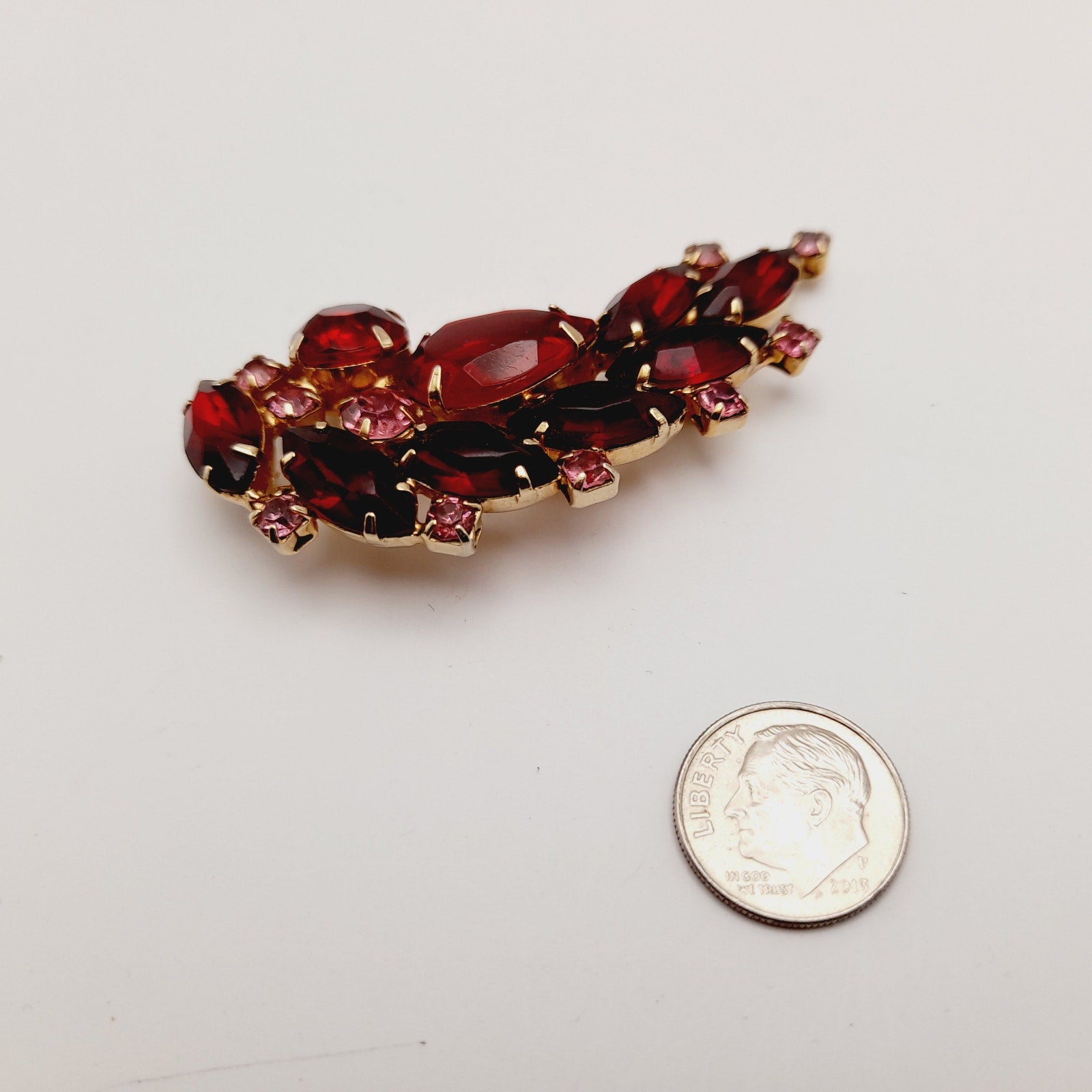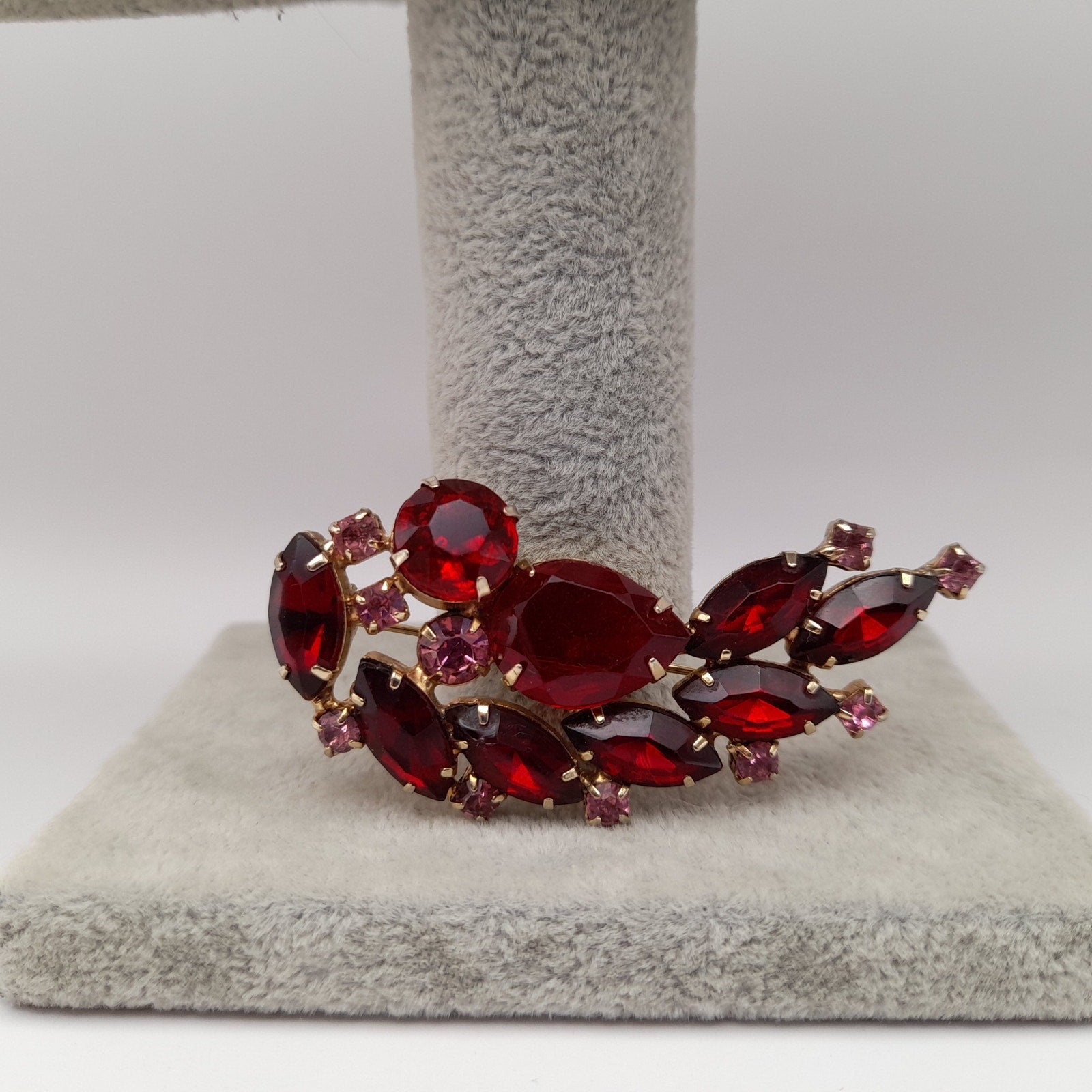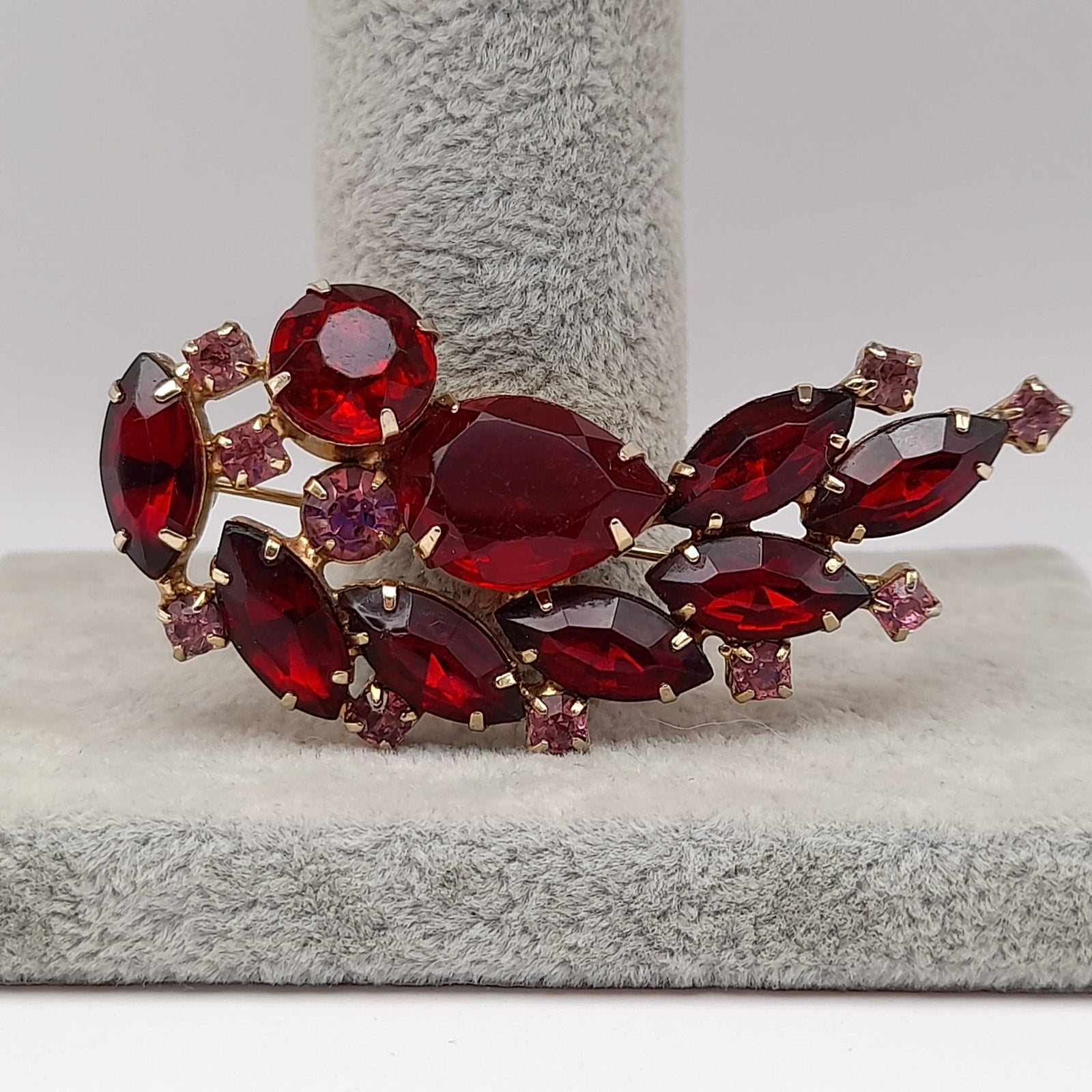 Add a touch of vintage elegance to your outfit with this beautiful red and pink rhinestone floral spray brooch! This stunning piece is in very good vintage condition and features a delicate floral design with sparkling rhinestones.
