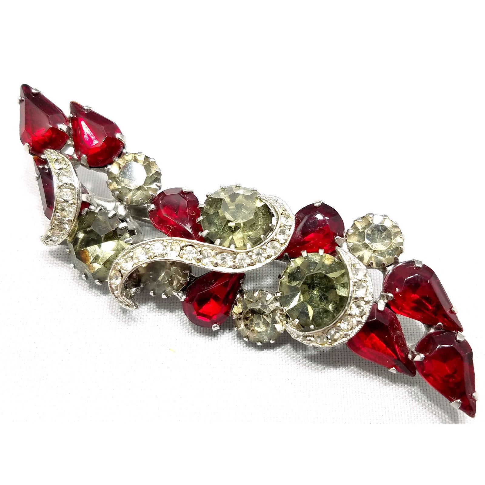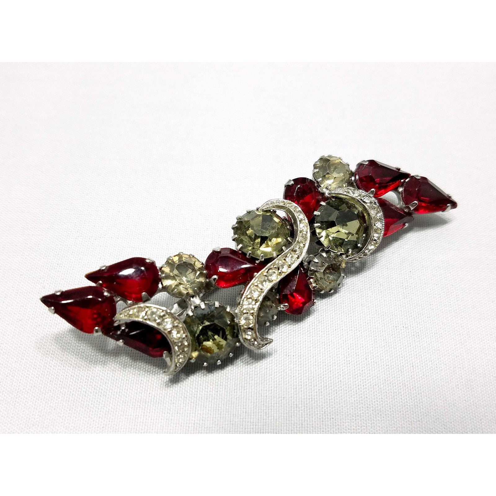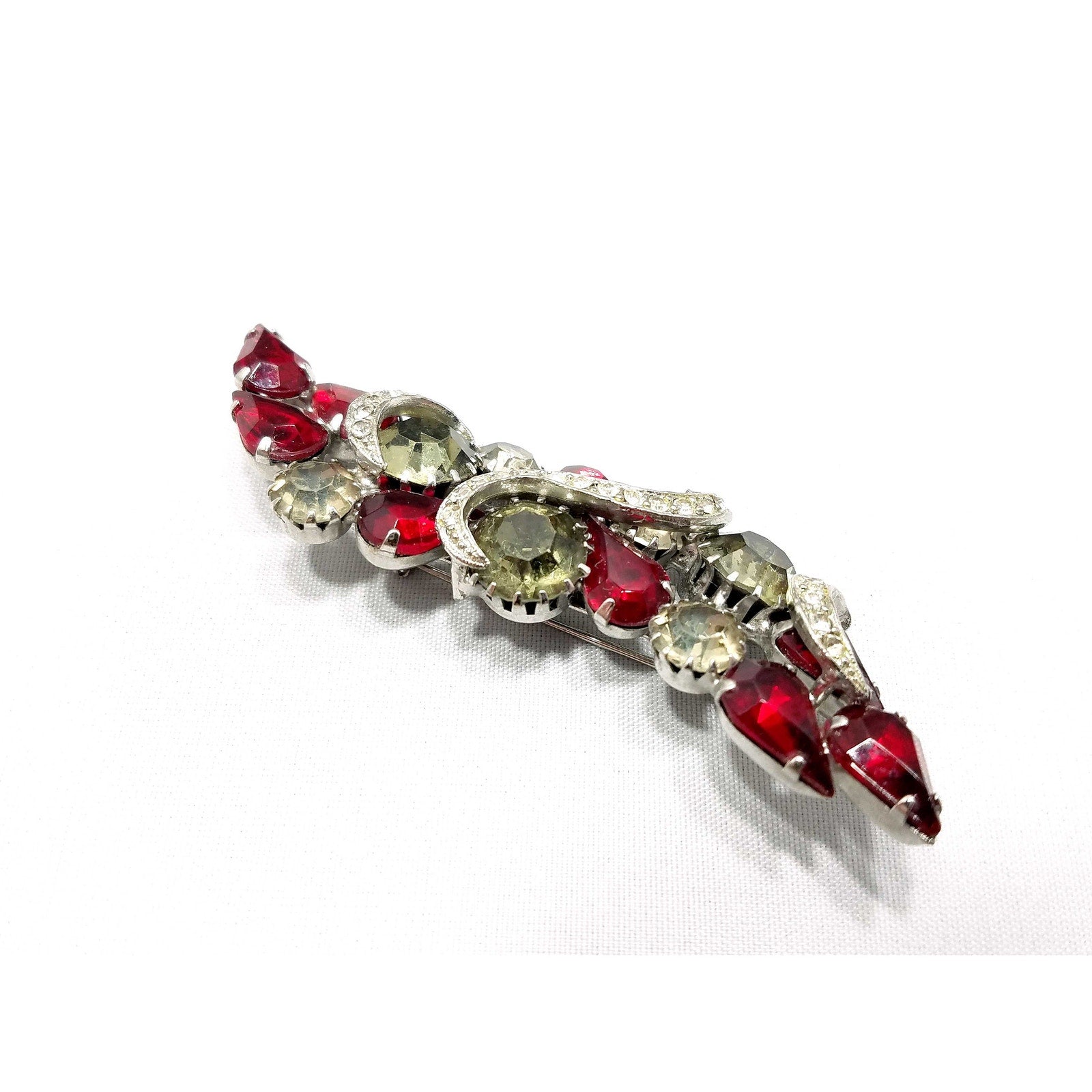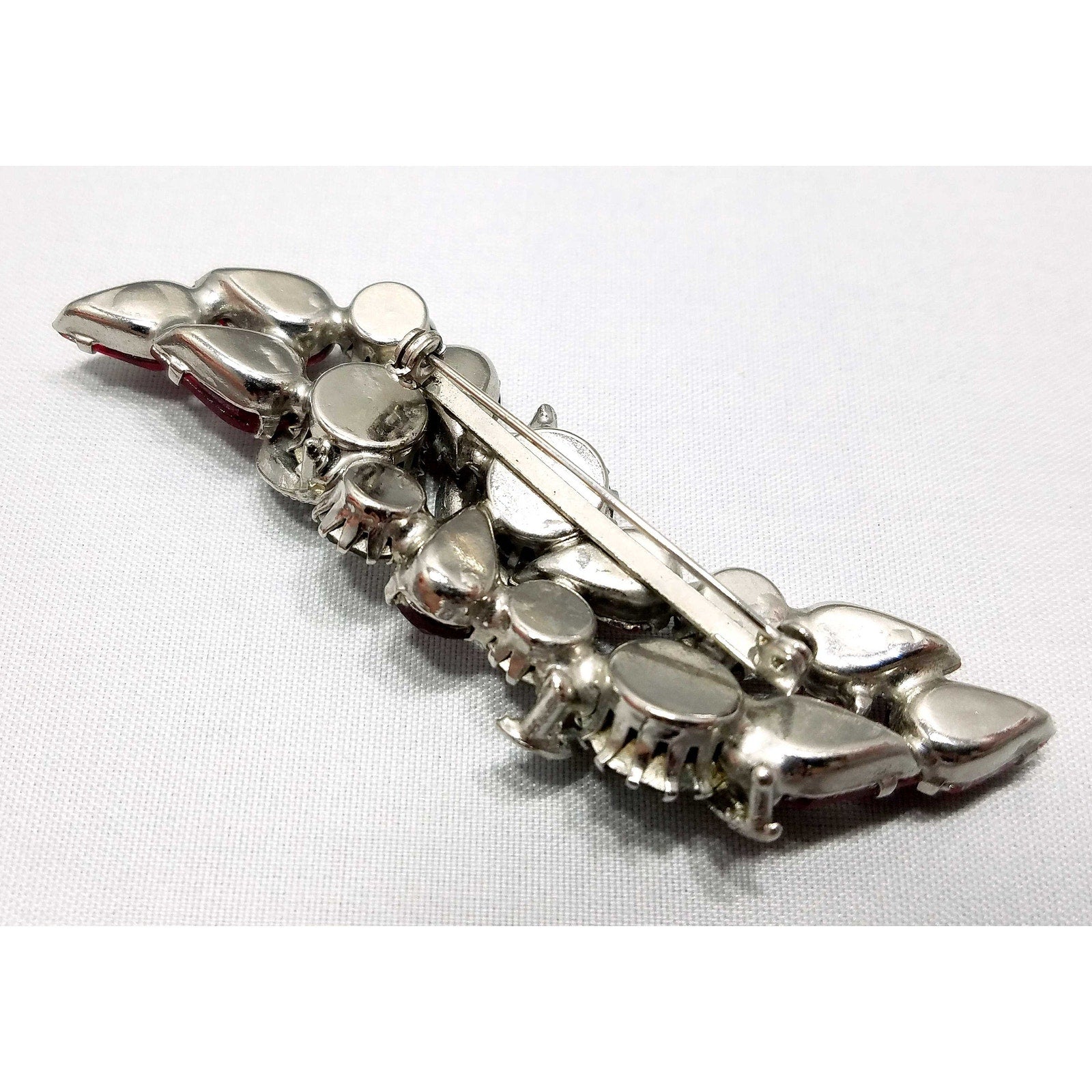 Vintage Red Rhinestone Brooch, Rhodium Plated, Ribbon Design, 1960s Vintage Jewelry