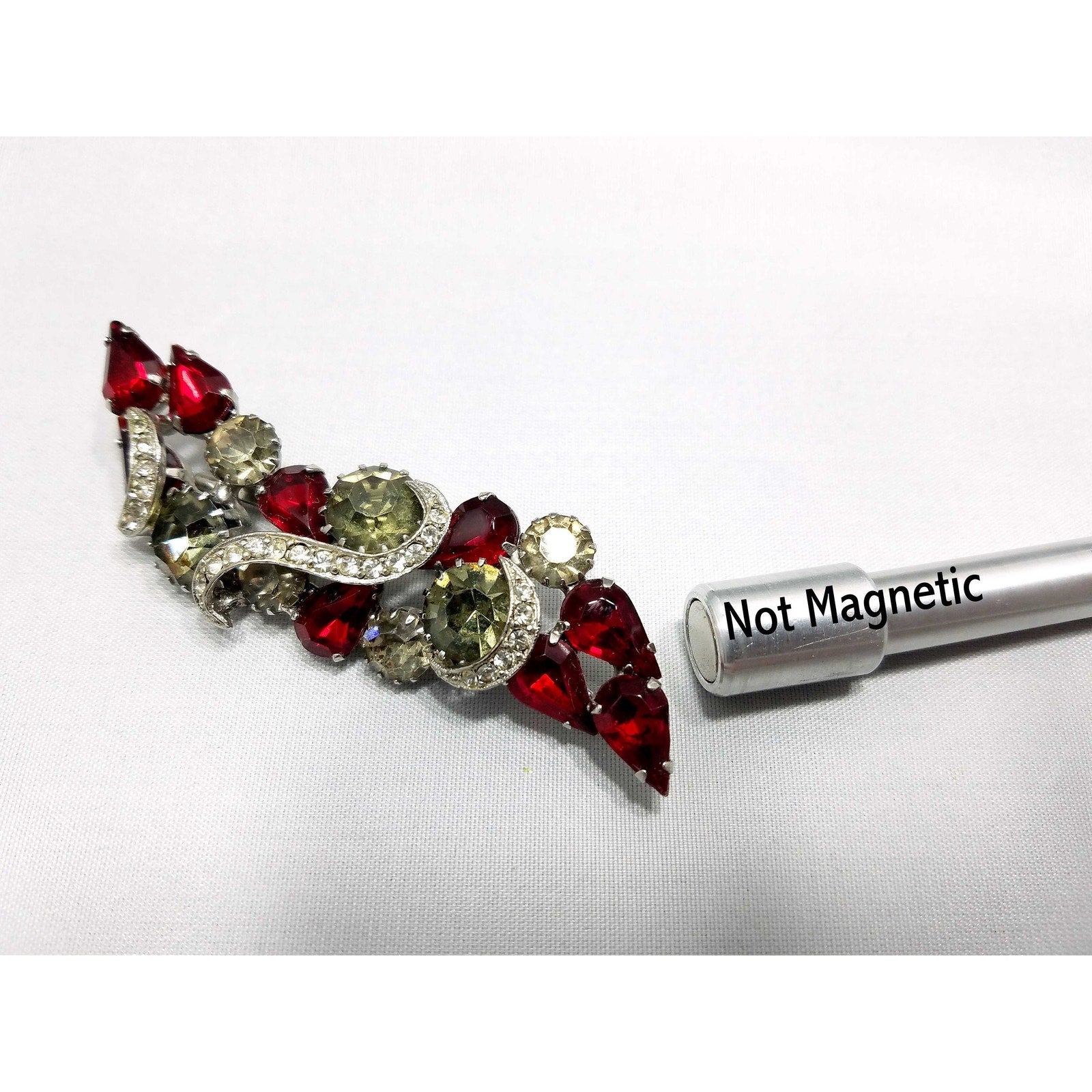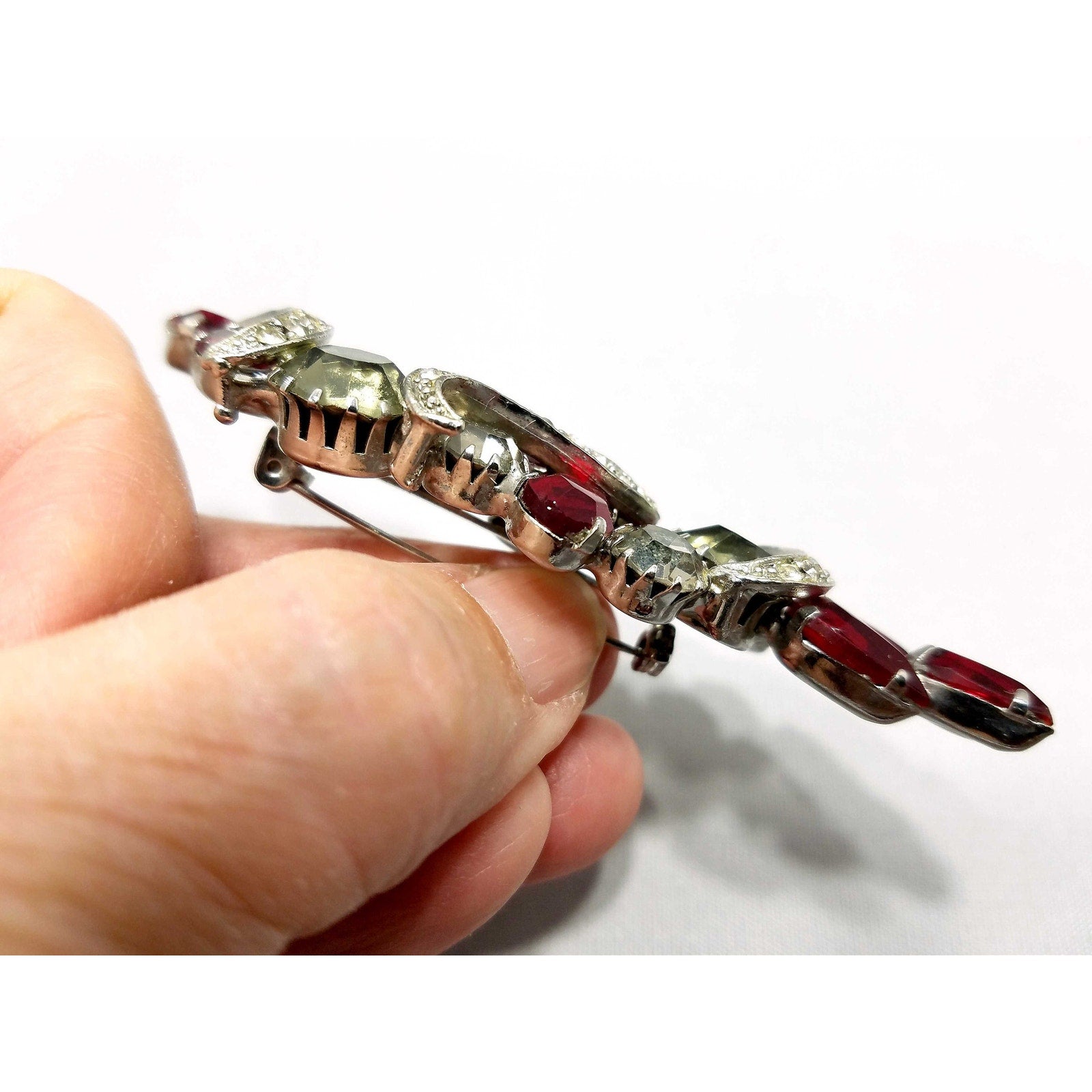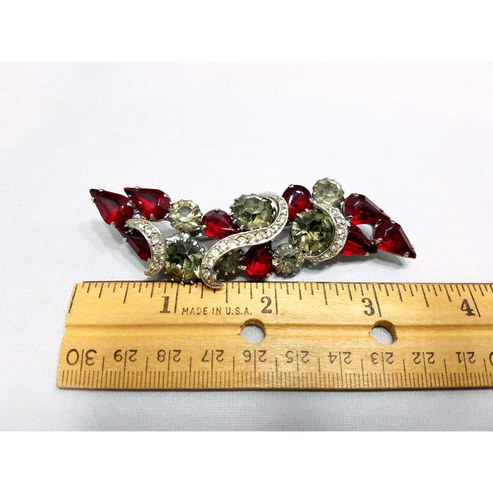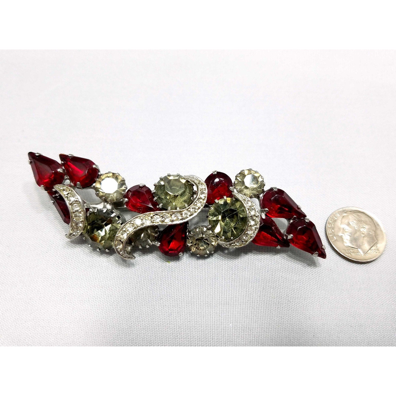 Vintage Red Rhinestone Brooch, Rhodium Plated, Ribbon Design, 1960s Vintage Jewelry