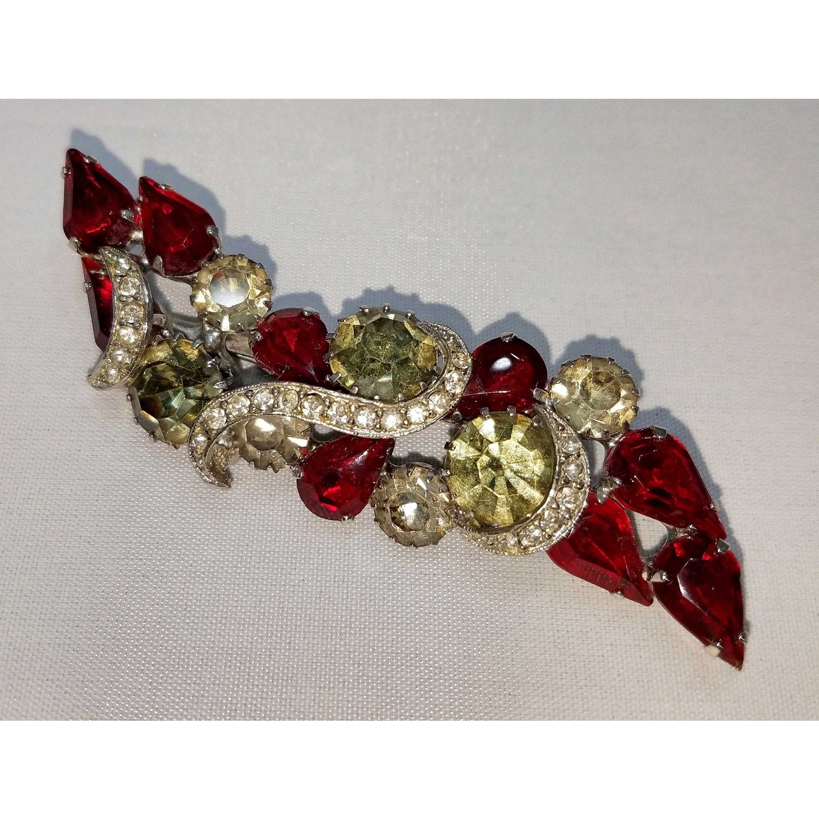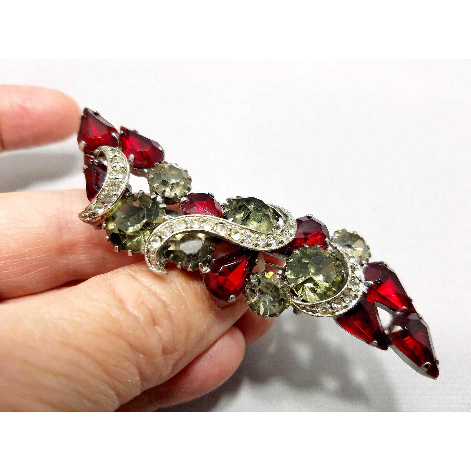 *Description: This is a beautiful 1960's Ruby Red Rhinestone Statement Brooch in the style of WEISS with the dog-toothed pronged chaton rhinestones and teardrop cabochons accented with pave' clear rhinestone ribbons throughout. It is of excellent quality and obviously a designer piece with a paper tag. It would make a great gift or wonderful addition to your vintage jewelry collection.