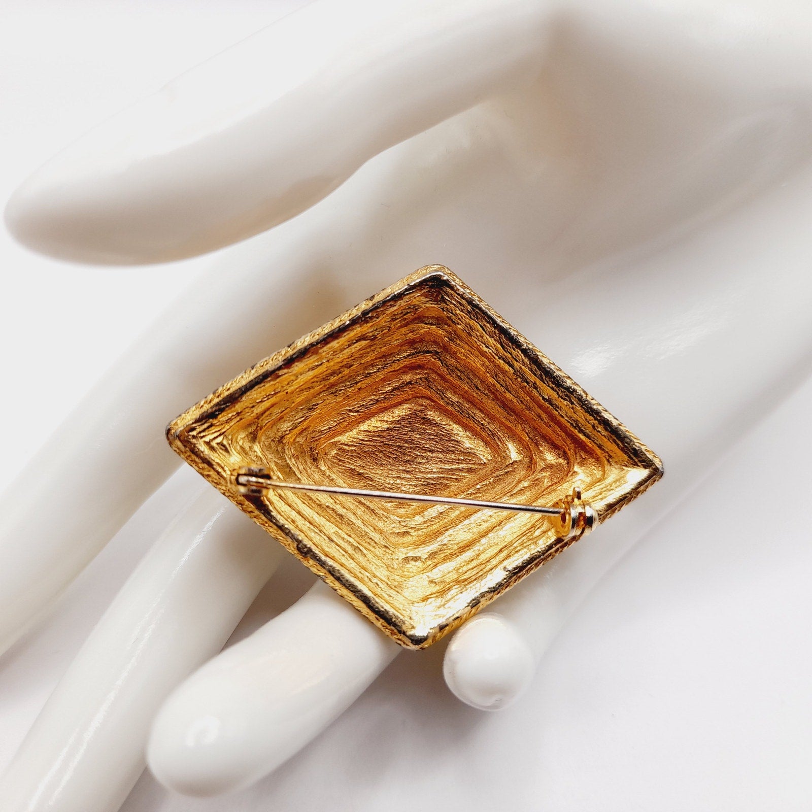 Add timeless elegance to your collection with this vintage rhinestone and faux pearl brooch in a bold diamond-shaped design. Measuring approximately 2 1/4 inches wide, this gold-tone brooch features intricate layers of shimmering rhinestones and luminous faux pearls arranged in a tiered, dimensional pattern for a stunning statement piece.