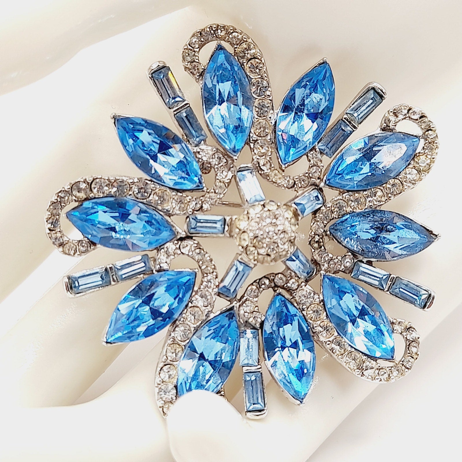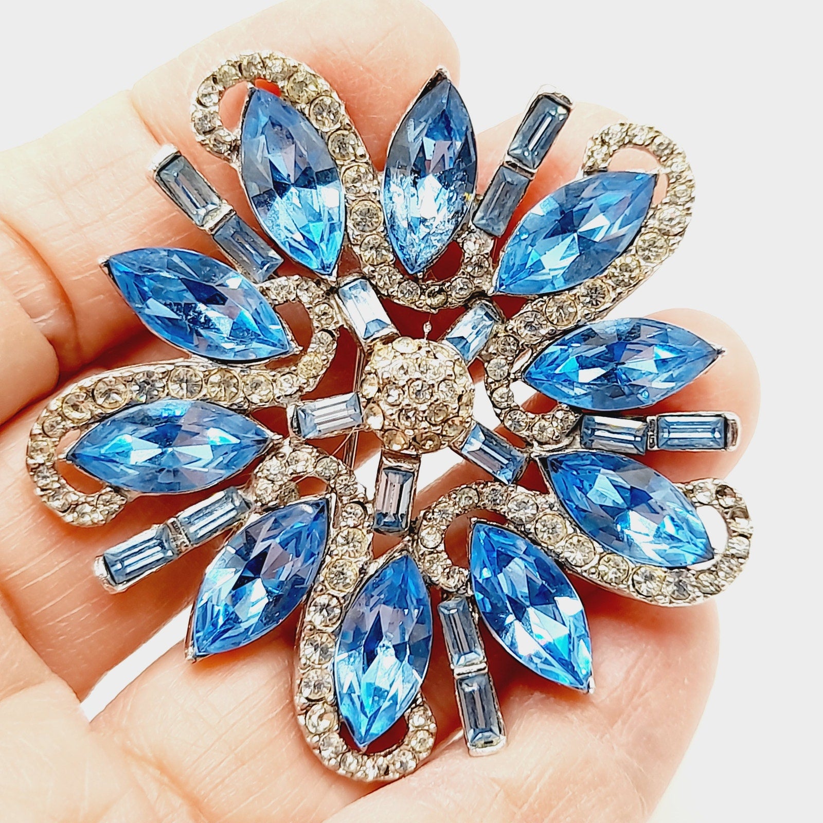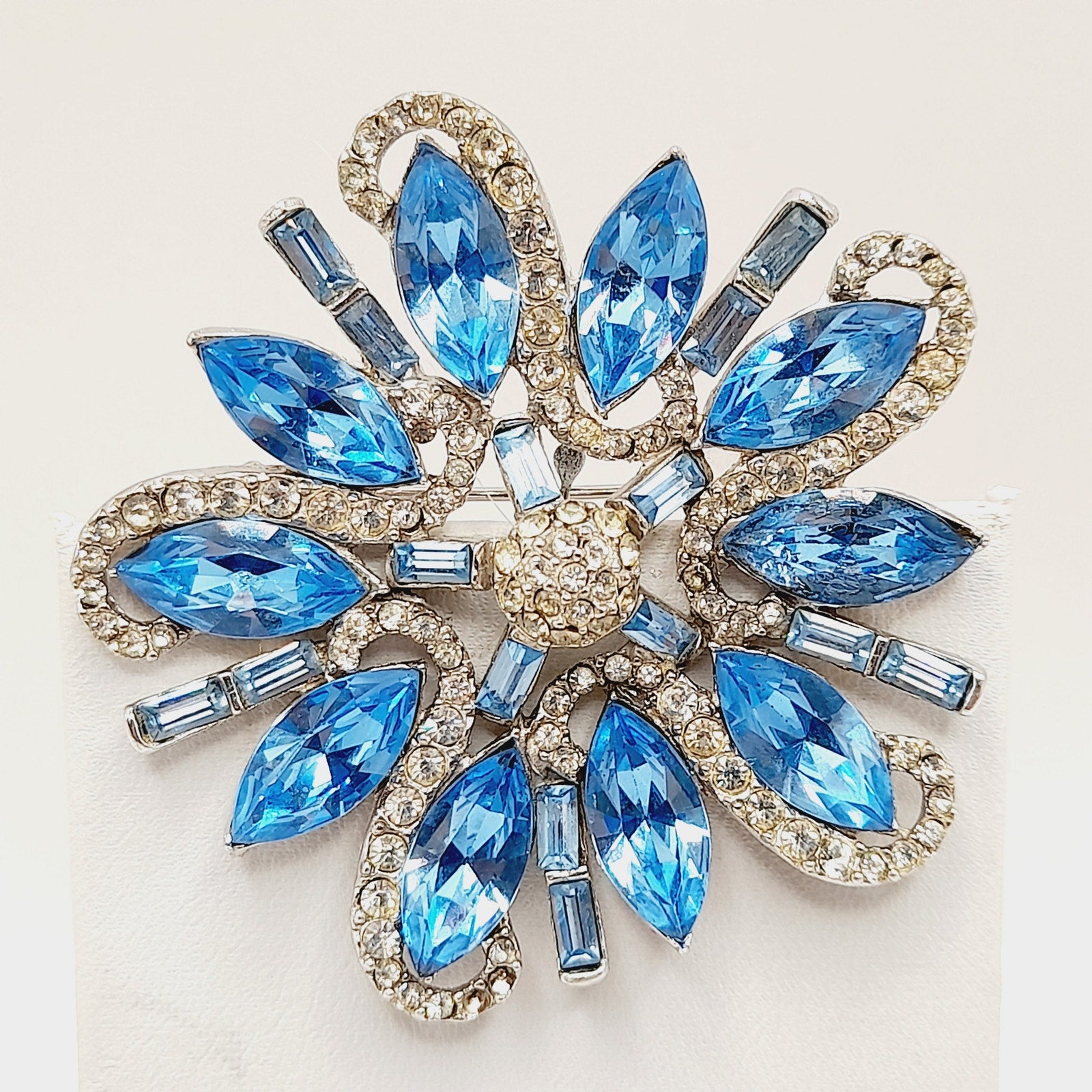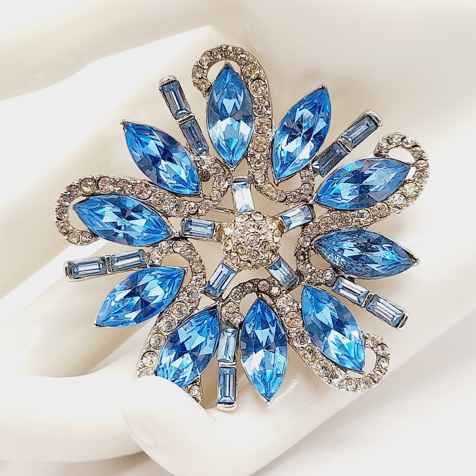 "Vintage rhodium-plated brooch featuring dazzling blue marquise rhinestones and sparkling clear accents — a timeless collectible statement piece."