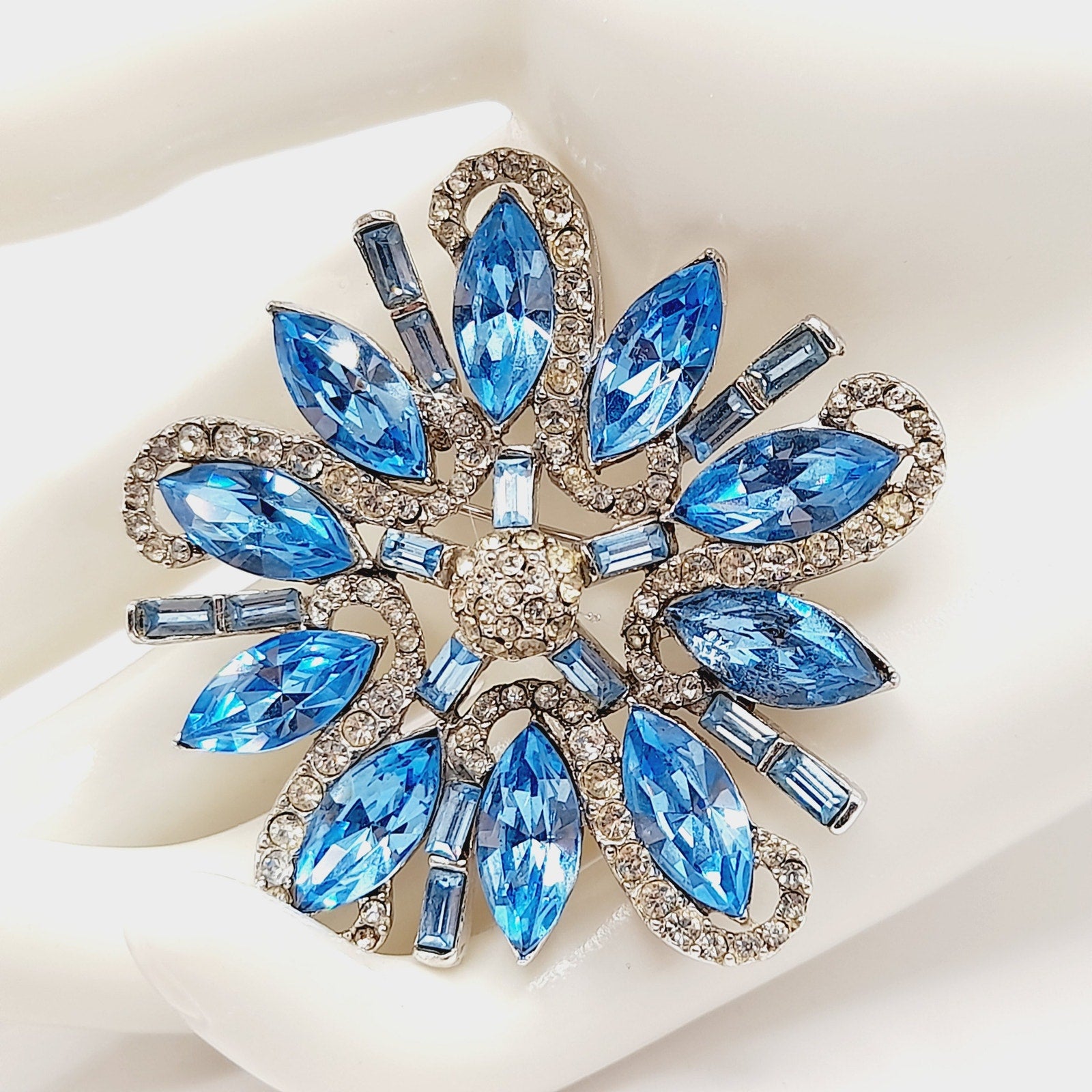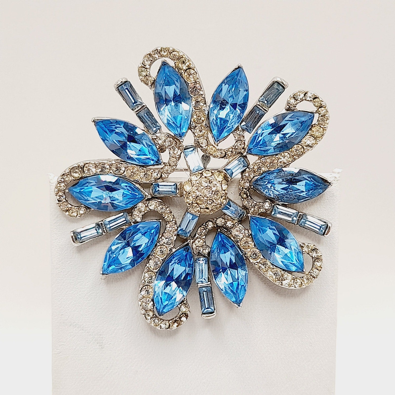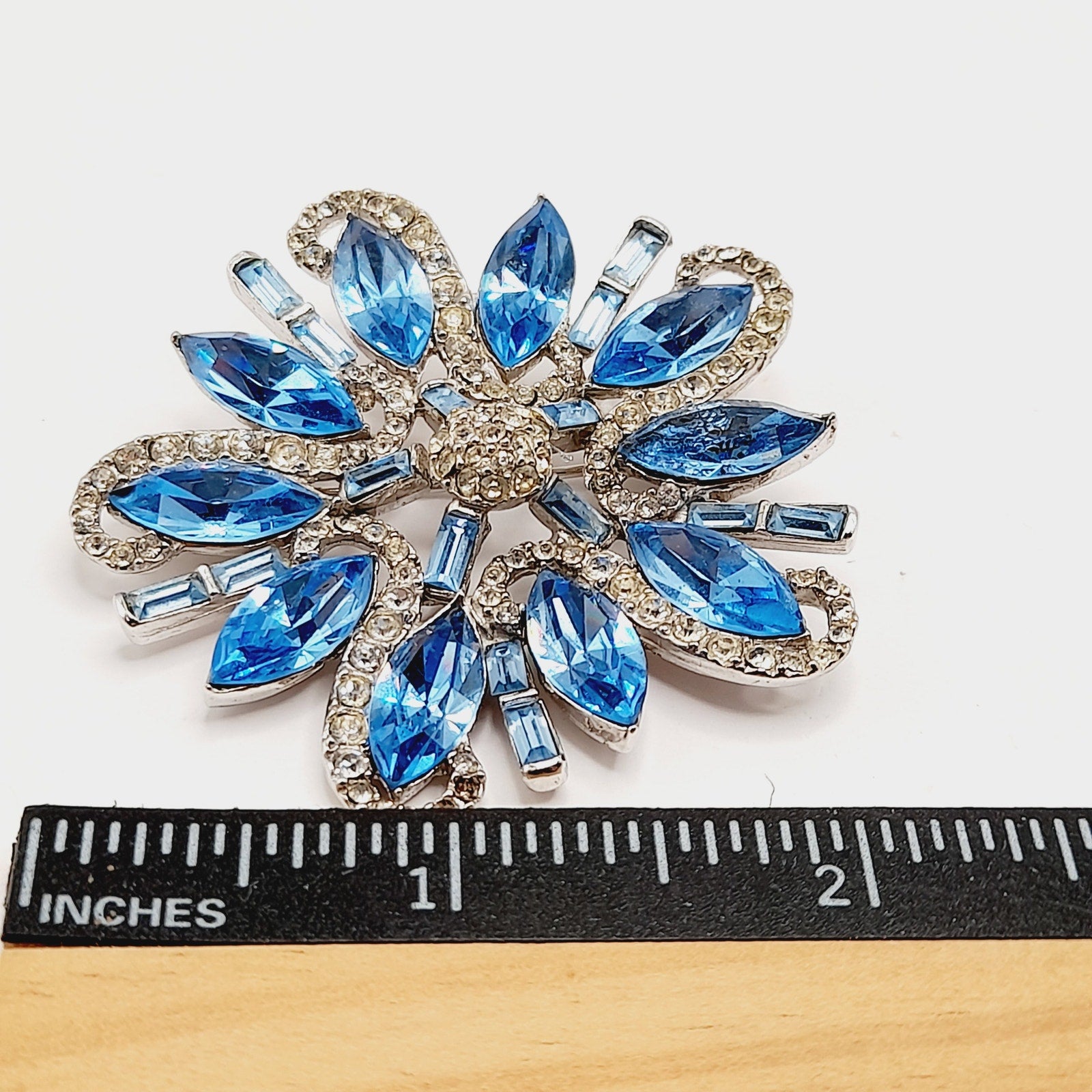 Add a bold pop of sparkle to your collection with this vintage rhodium-plated brooch featuring dazzling blue marquise rhinestones, accented by shimmering clear round and baguette rhinestones. Crafted in a stunning floral-inspired design, this brooch is perfect for dressing up a special occasion look or adding a touch of vintage glam to everyday outfits.
