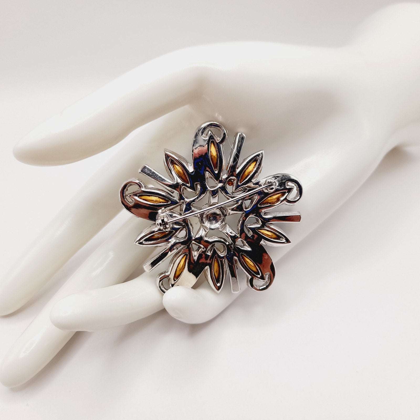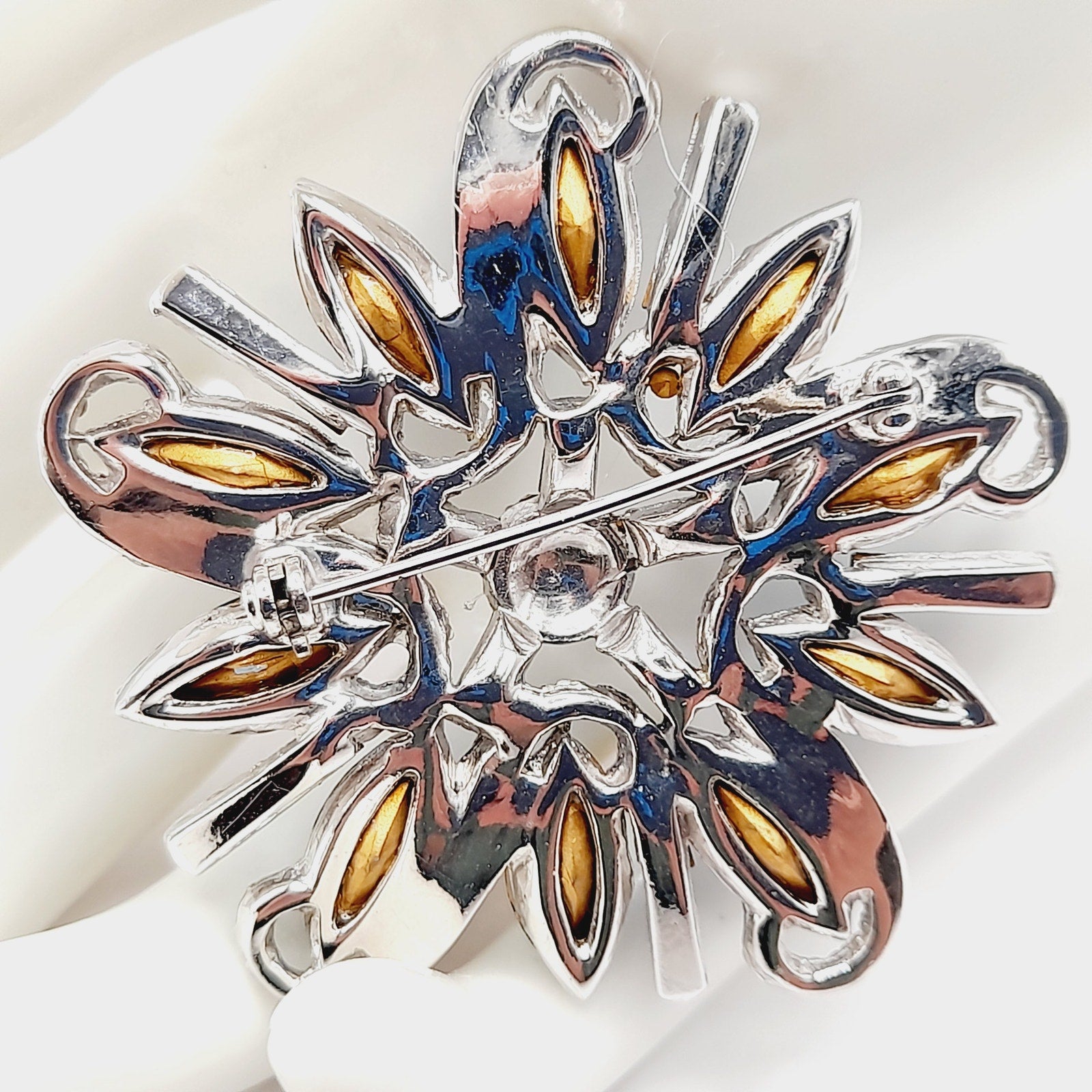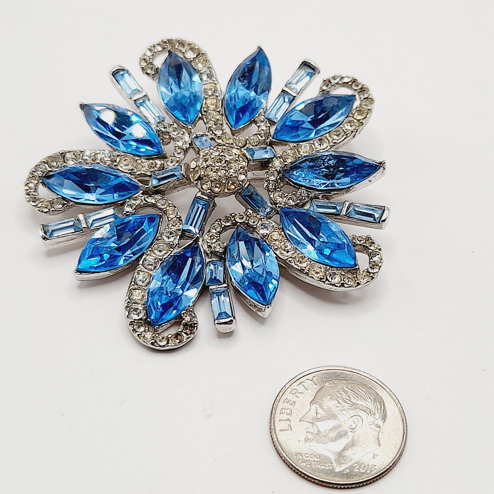 Add a bold pop of sparkle to your collection with this vintage rhodium-plated brooch featuring dazzling blue marquise rhinestones, accented by shimmering clear round and baguette rhinestones. Crafted in a stunning floral-inspired design, this brooch is perfect for dressing up a special occasion look or adding a touch of vintage glam to everyday outfits.