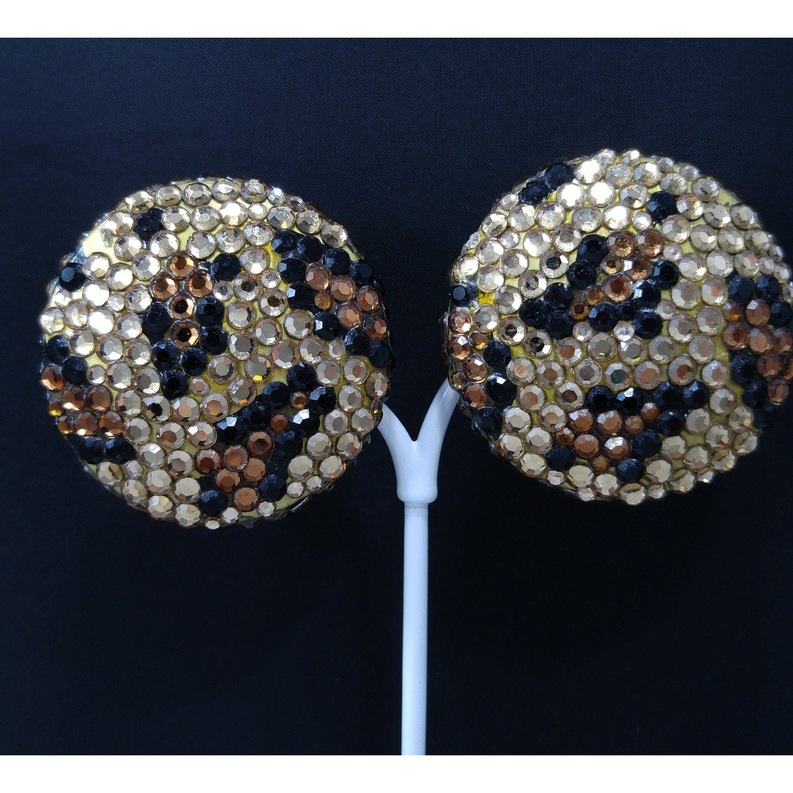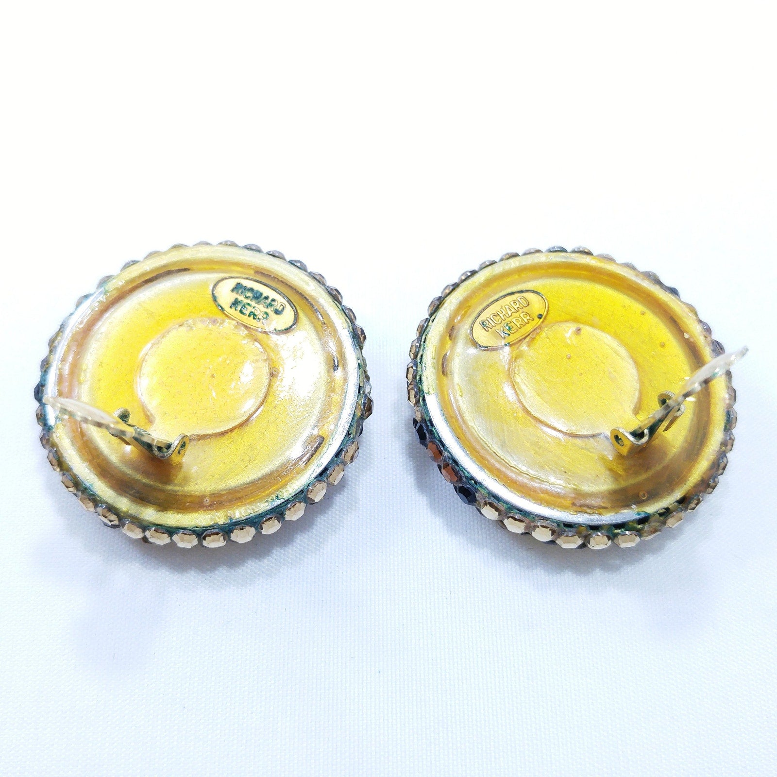 Condition: Good vintage condition. The fronts are vibrant and eye-catching. There are a few missing rhinestones along the edges (two on one earring and one on the other), and the backs show some discoloration (see photos). These minor flaws are not noticeable when worn and have been reflected in the adjusted price.