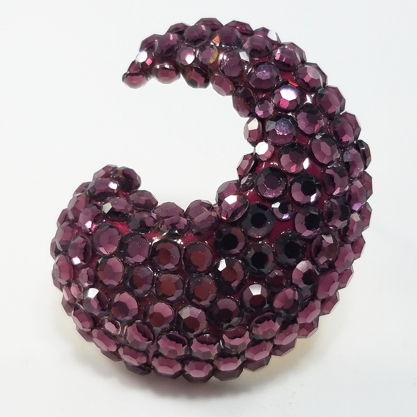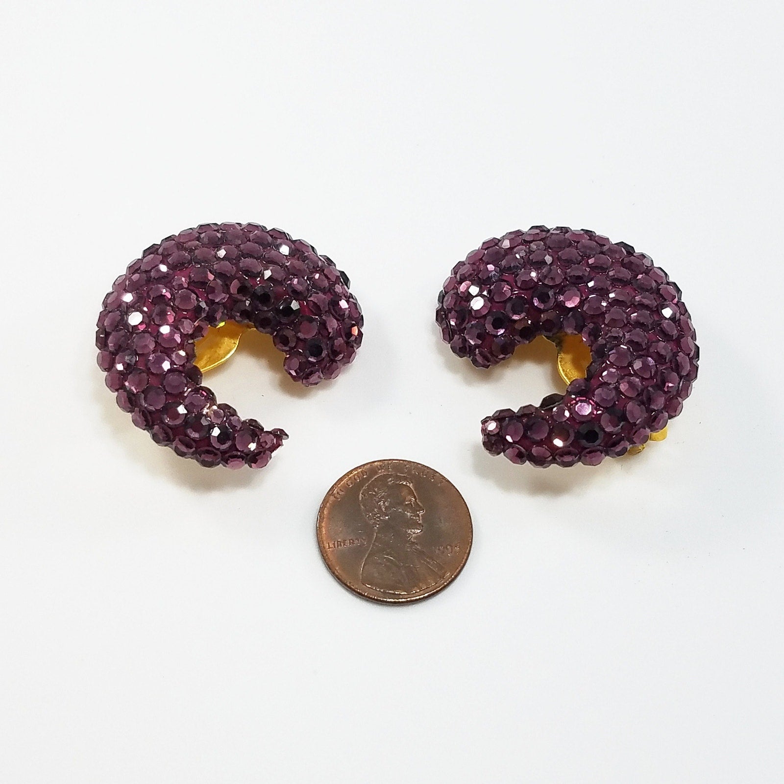 *Description: This is a beautiful pair of Richard Kerr statement earrings from the 1980s. The earrings have the encrusted purple Swarovski flat-back crystals covering each earring. For this reason, they are full of sparkle and beautiful making these the perfect statement earrings from the 1980s. This would be a great pair of earrings for your vintage jewelry collection.