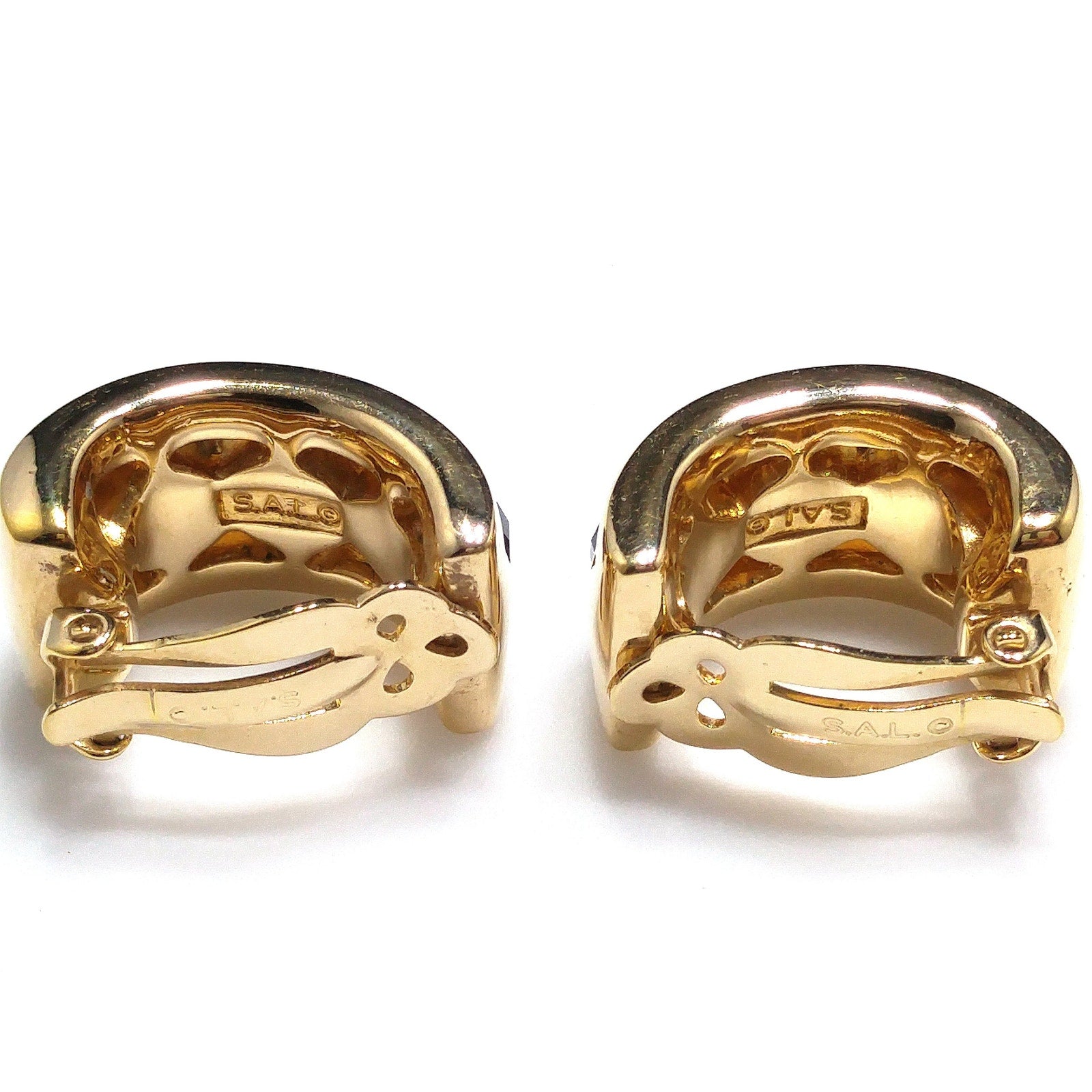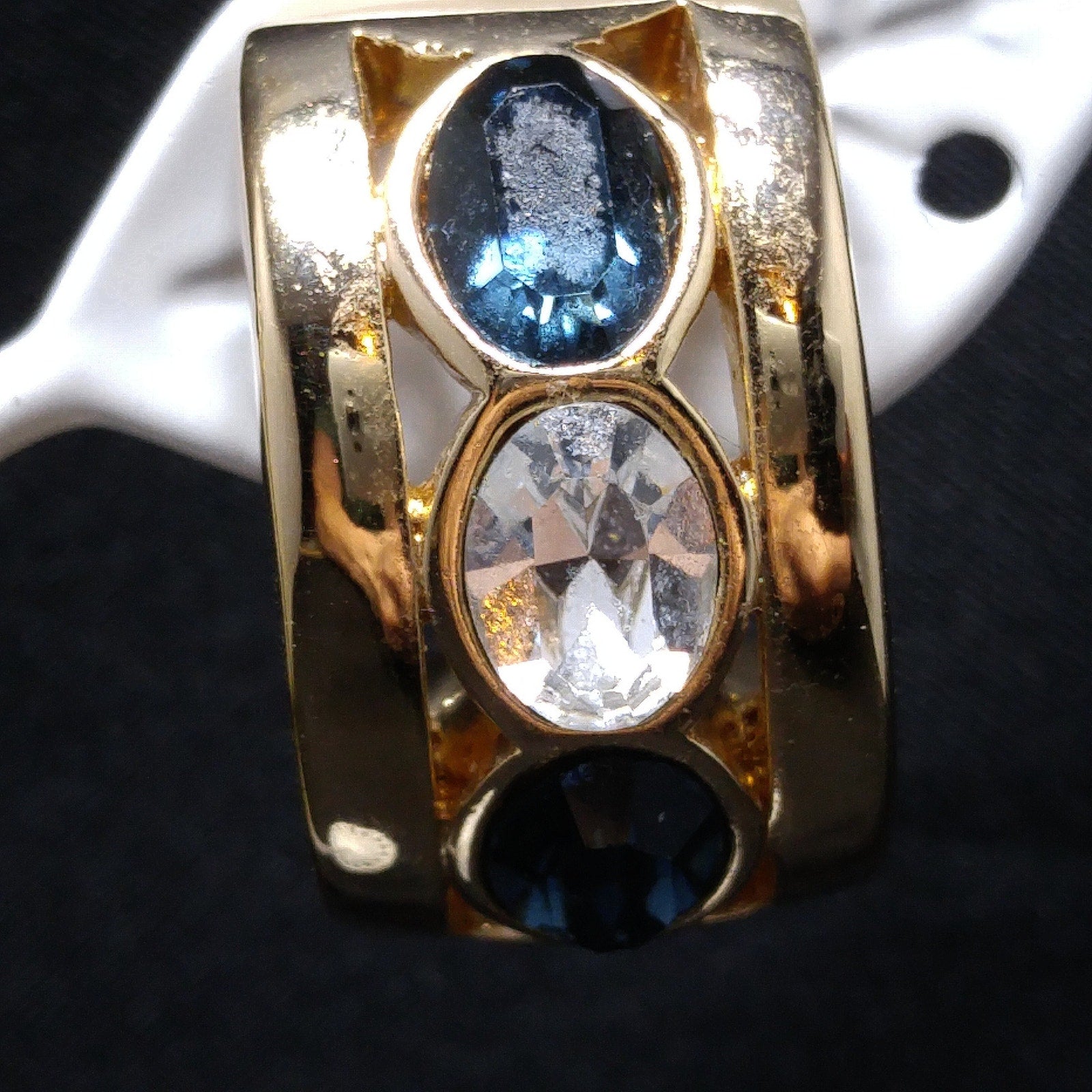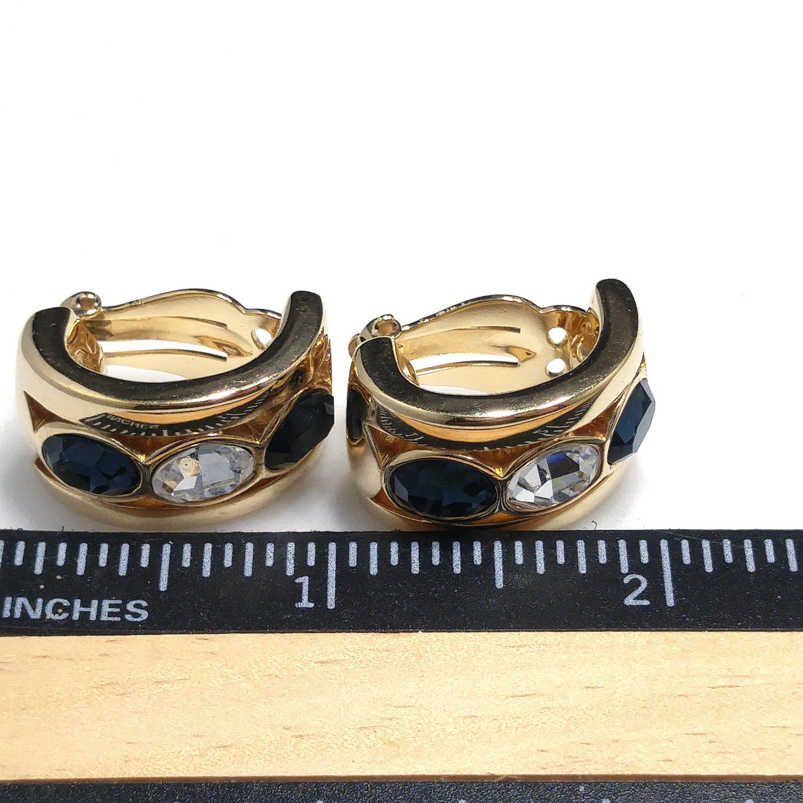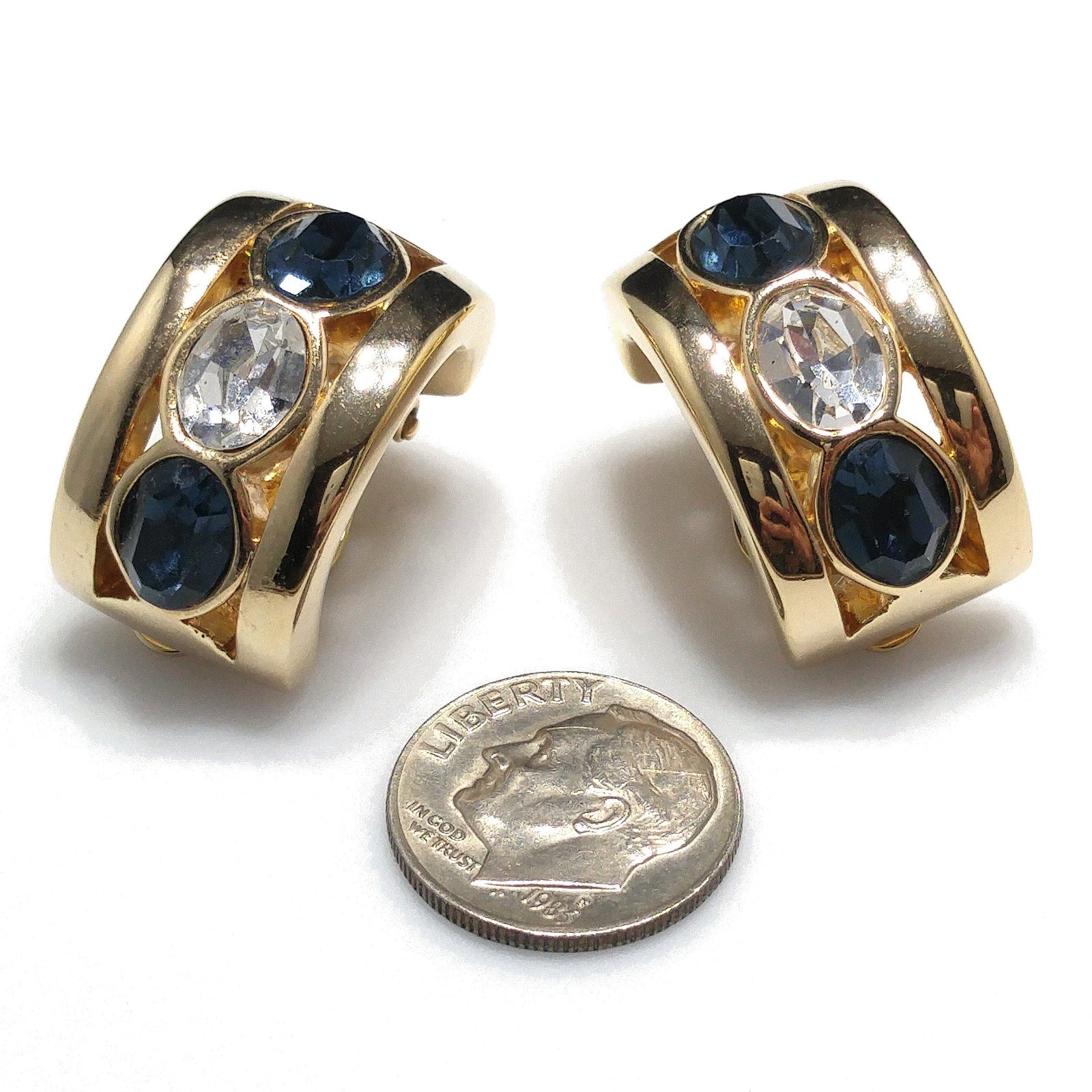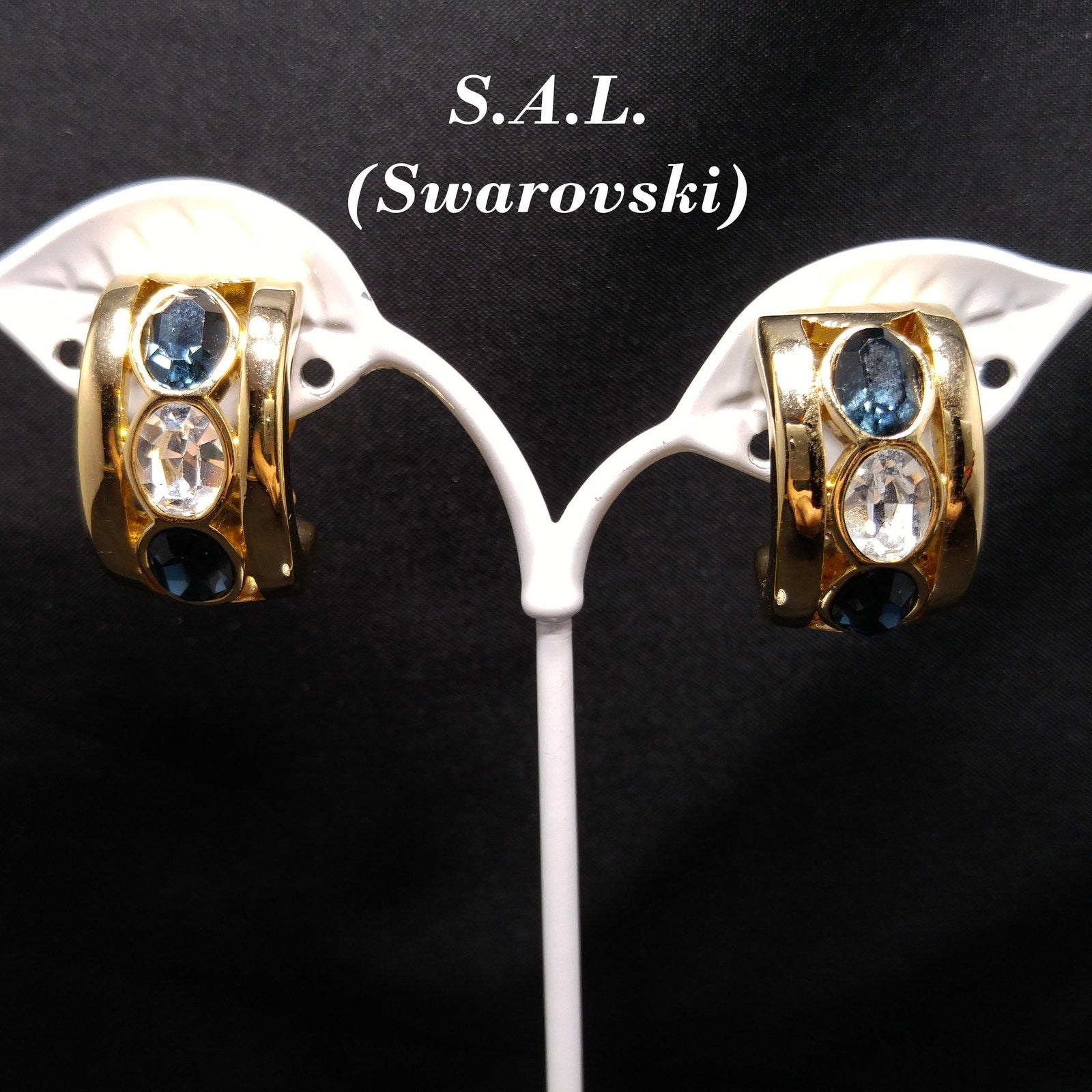 *Description: This is a beautiful pair of sapphire blue and clear crystal rhinestone clip on earrings by Swarovski from the 1980s. The blue and clear crystal rhinestones are oval and faceted; sparkling in the light. Each earring is stamped S.A.L. on the inside and is gold plated. The gold plated finish is very reflective and as you can see by the photos, my reflection is in each one. S.A.L. was used up until the late 1980s as the Swarovski trademark. This is a gorgeous pair of earrings. This would be a great addition to your vintage jewelry collection or make a great vintage gift!