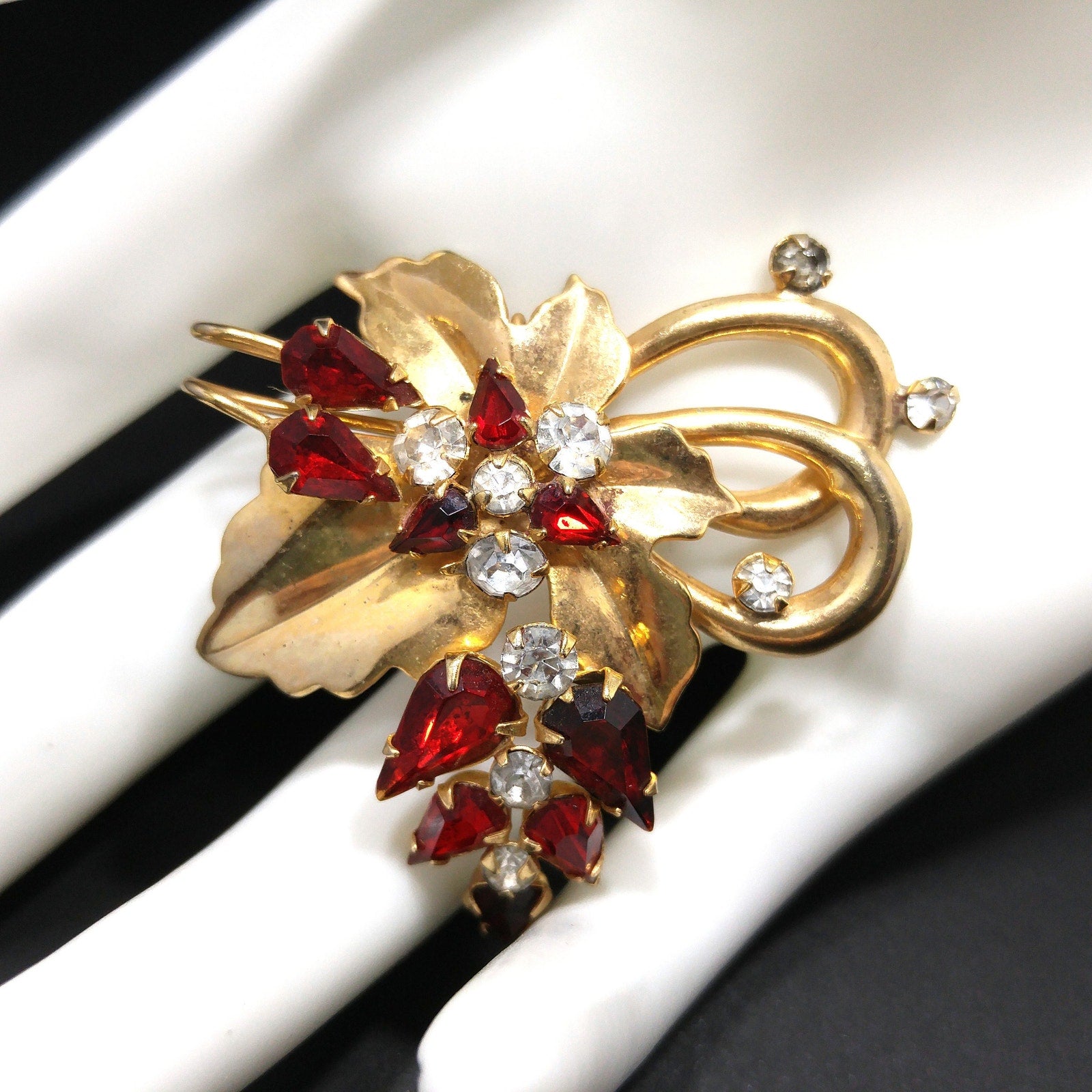 This is a beautiful mid-century Scitarelli brooch and pendant from the 1950s. The piece features brilliant pear-shaped ruby red and round clear glass rhinestones arranged in a floral spray design with a gold plated leaf backdrop. It includes both a bail for wearing as a pendant and a rolling C clasp for wearing as a brooch, offering versatile styling.