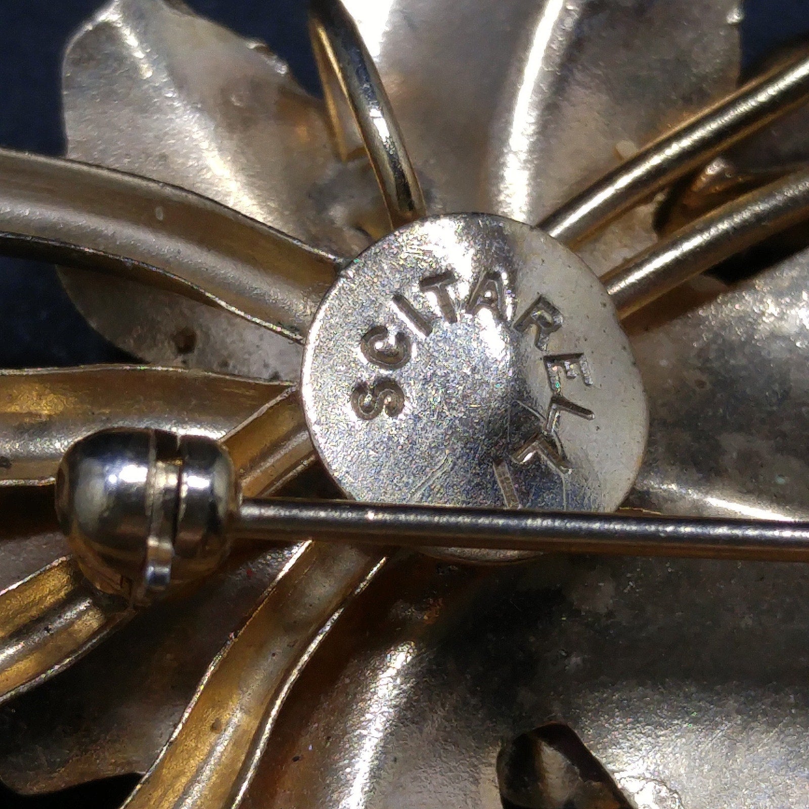 The round cartouche on the back is stamped Scitarelli, a hallmark of M. & S. Manufacturing Company of Providence, Rhode Island, active in the 1950s and documented in the Jewelers Circular of 1950.