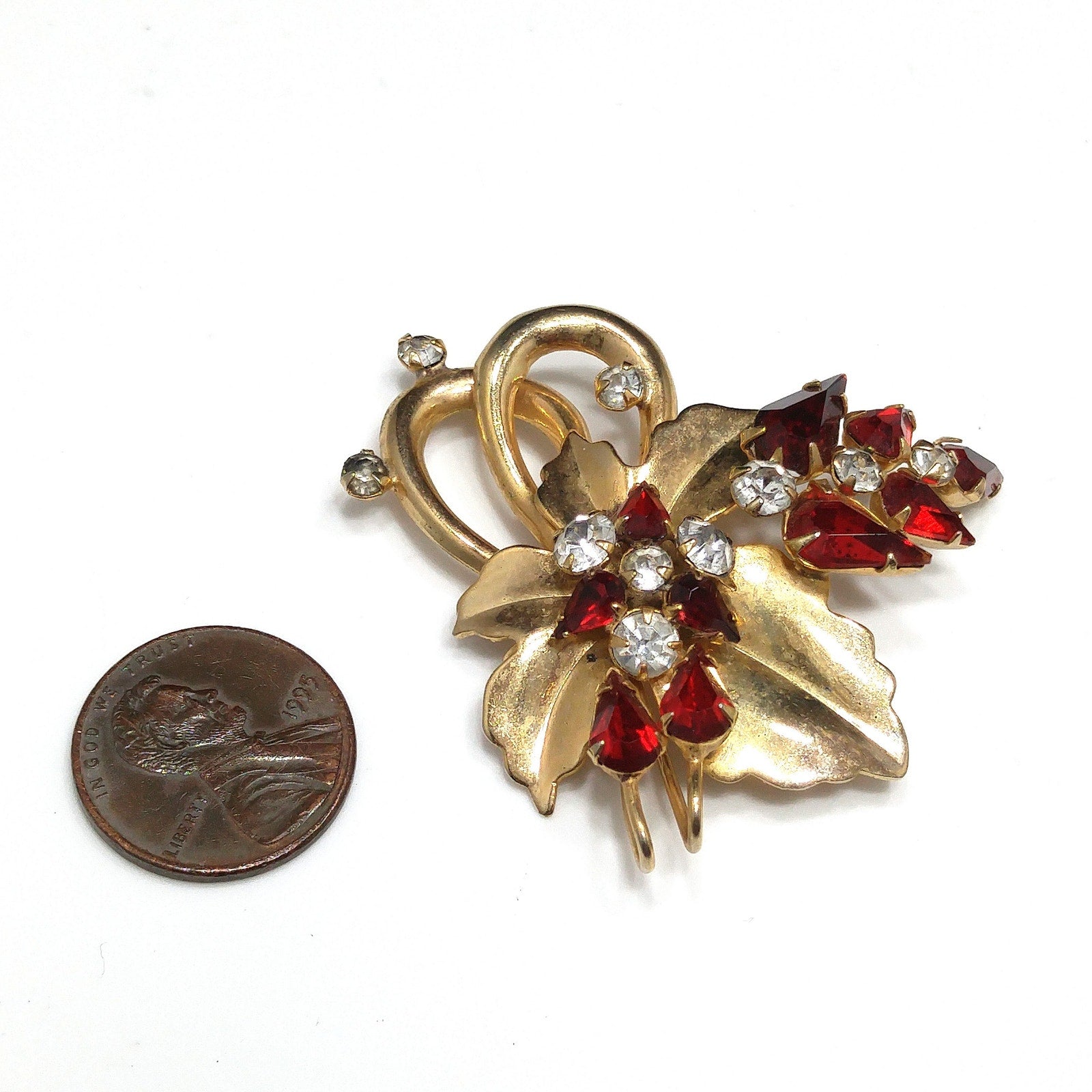 Vintage Scitarelli Red Rhinestone Floral Brooch Pendant 1950s Gold Plated Signed