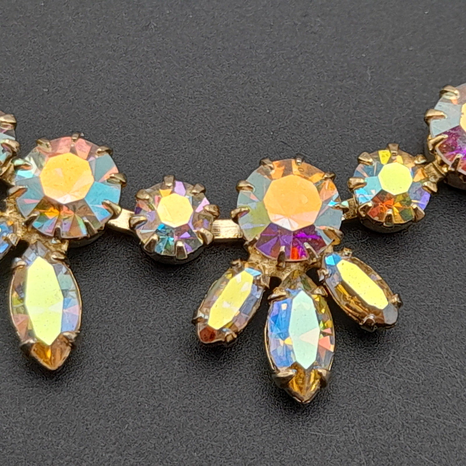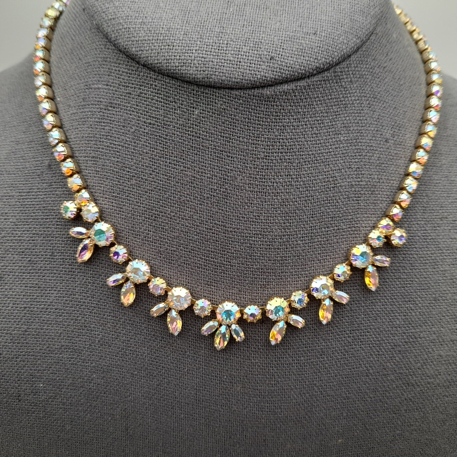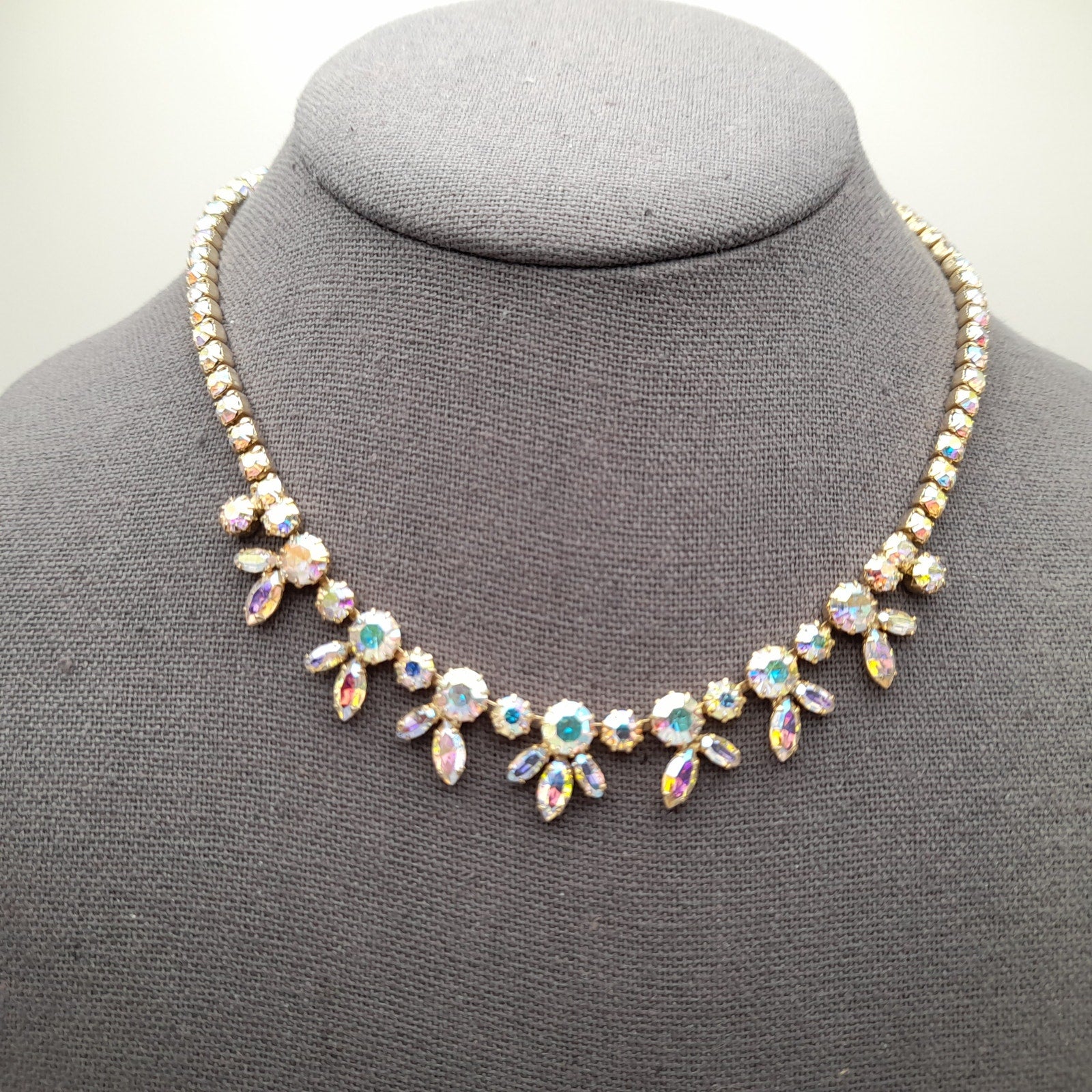 Add a touch of vintage glamour to your collection with this stunning Sherman choker necklace! This exquisite piece features dazzling Aurora Borealis rhinestones set in a beautiful gold-plated finish.