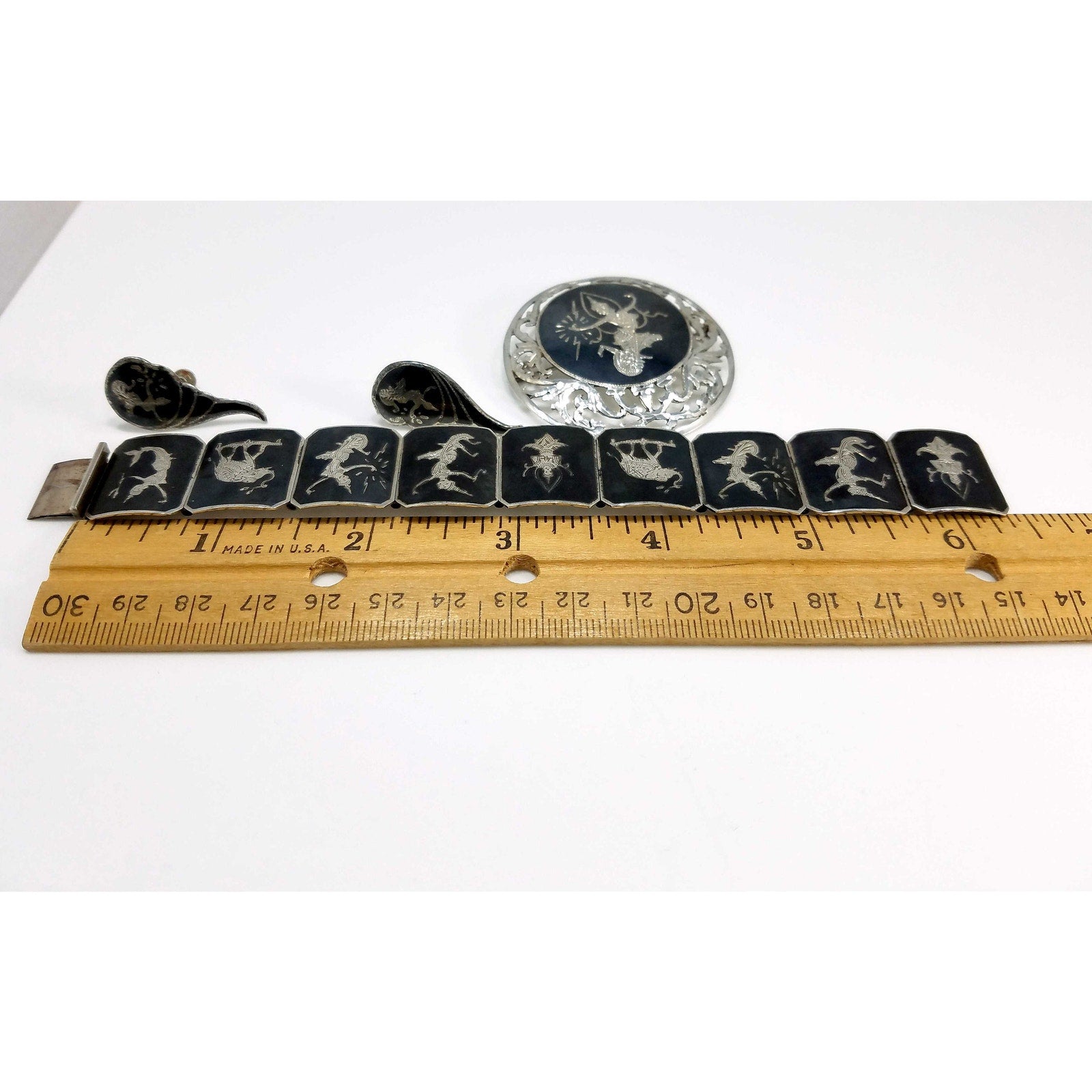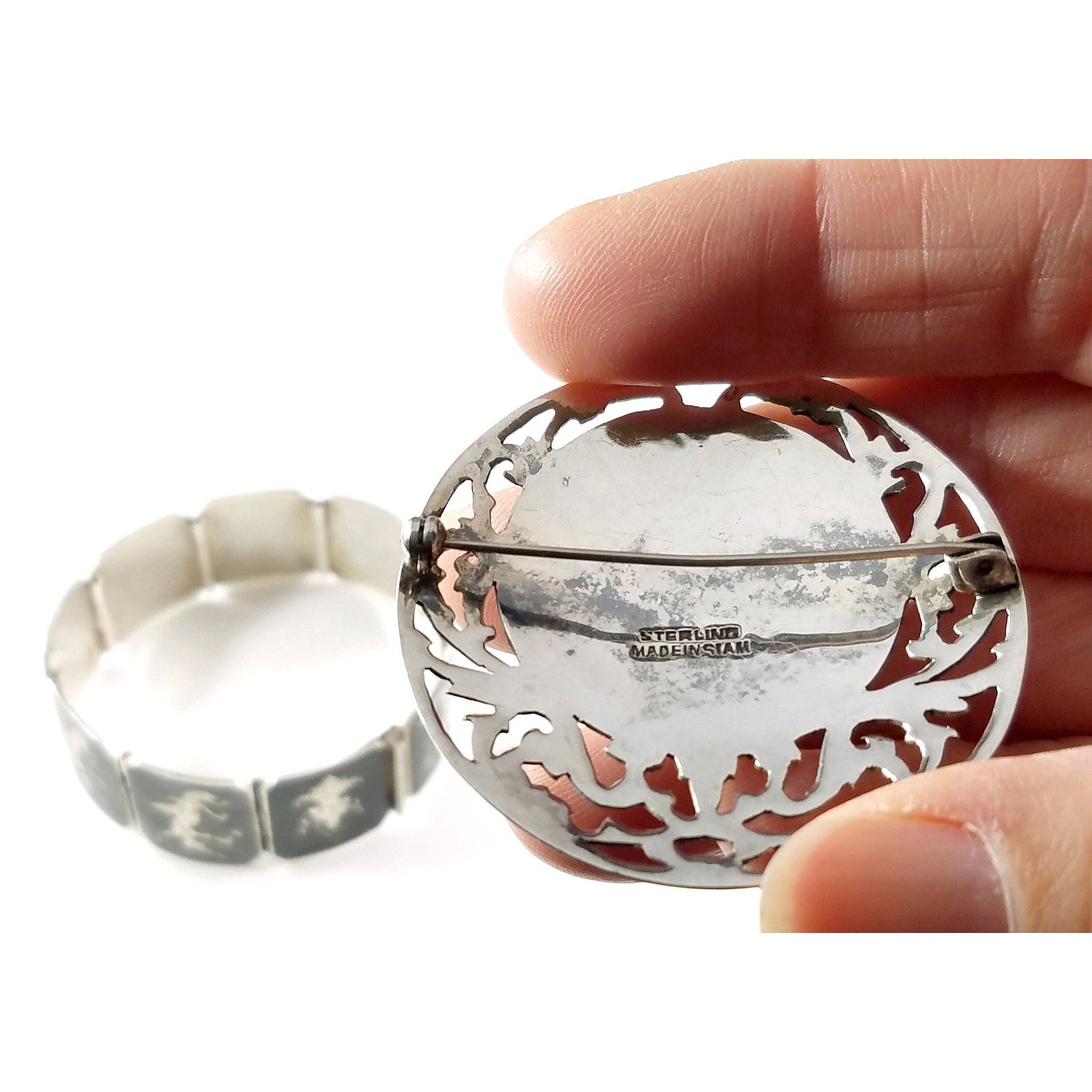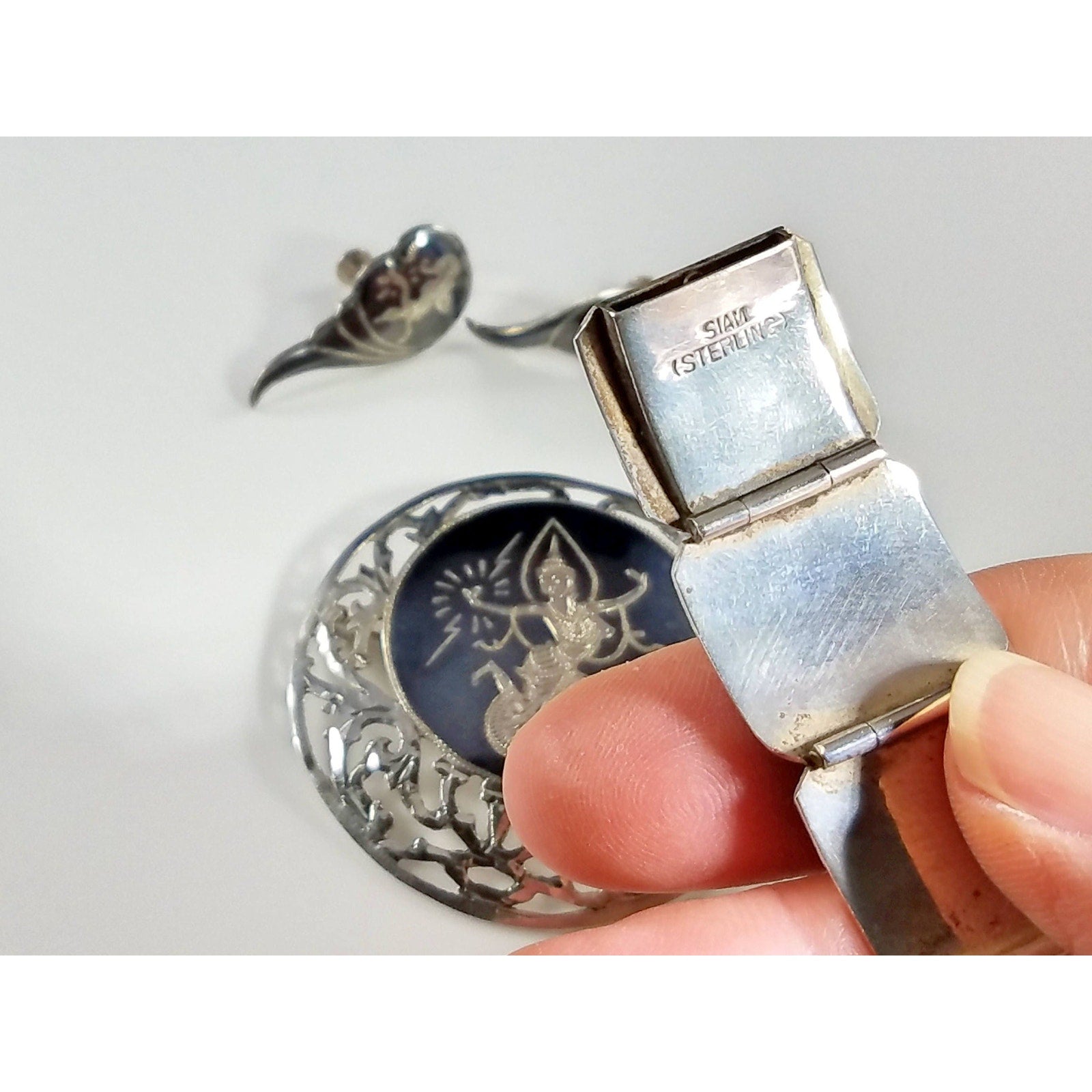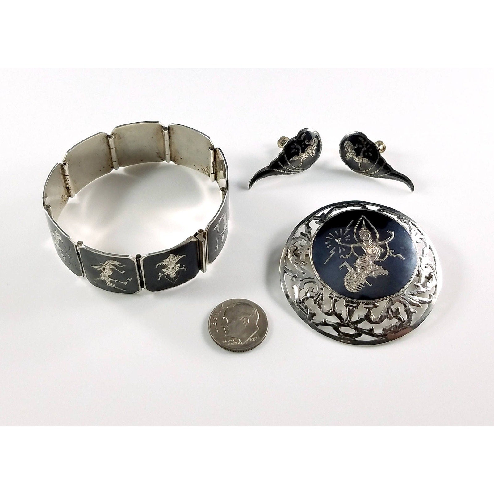 Vintage Siam Sterling Niello Silver Bracelet Brooch Earrings Set Mekkala Goddess