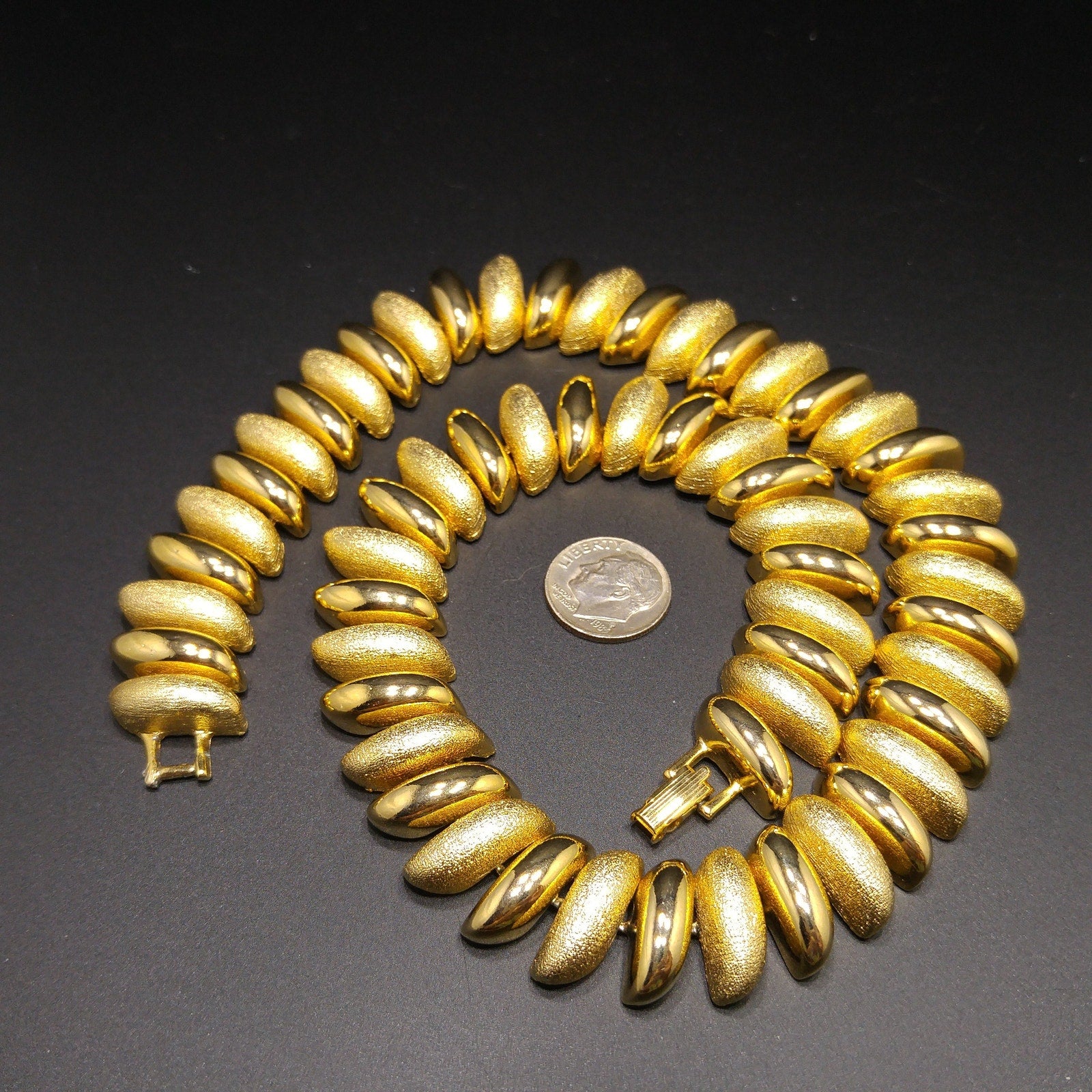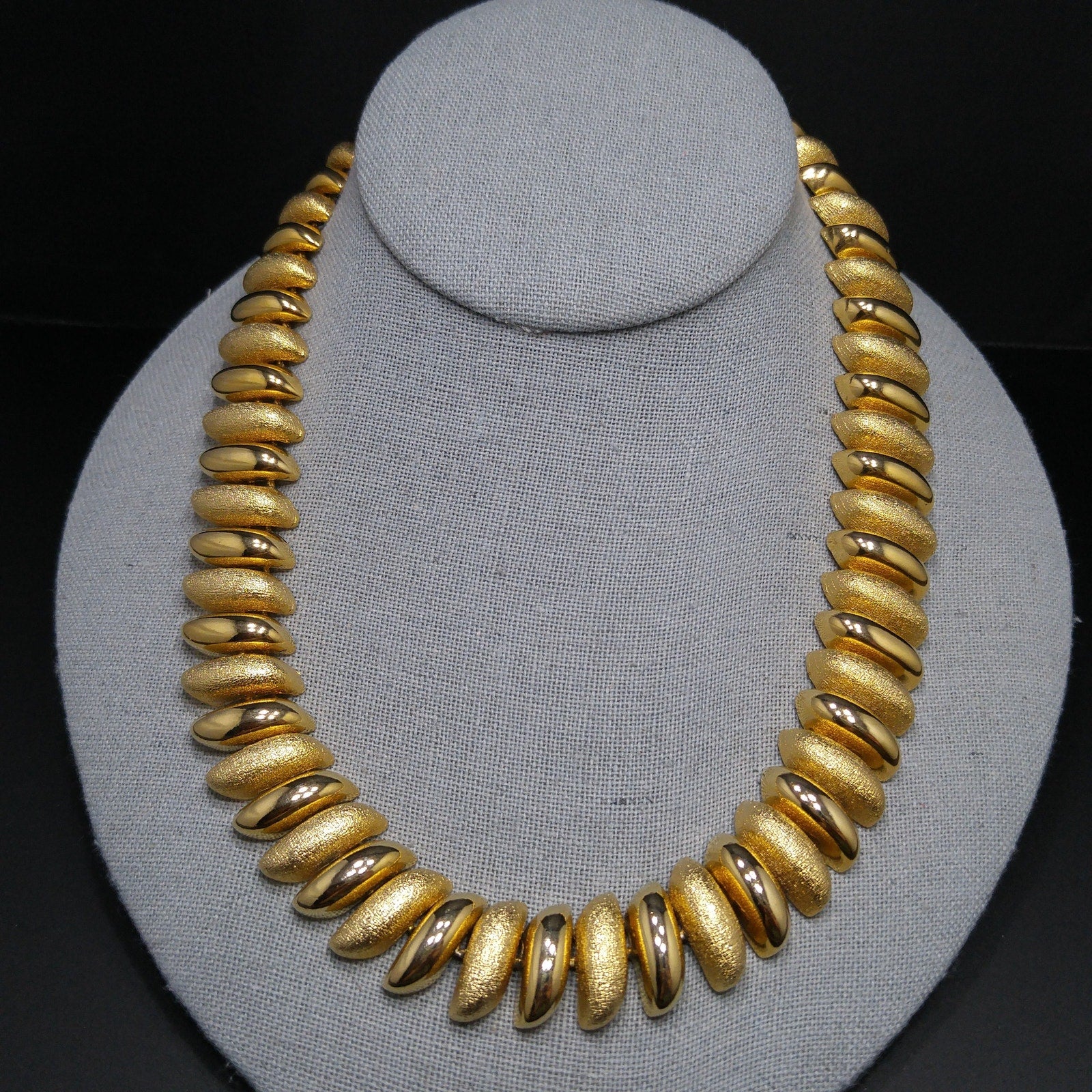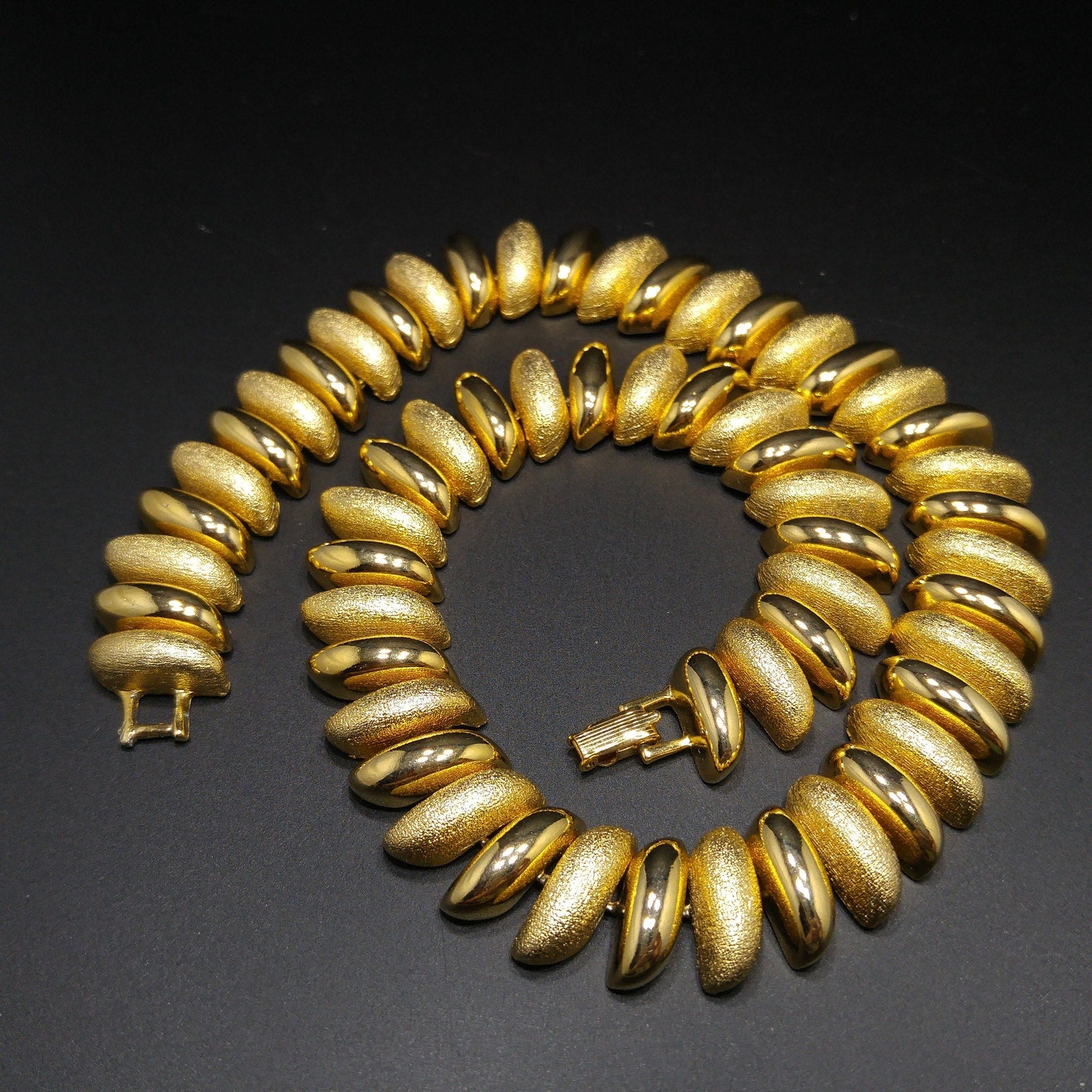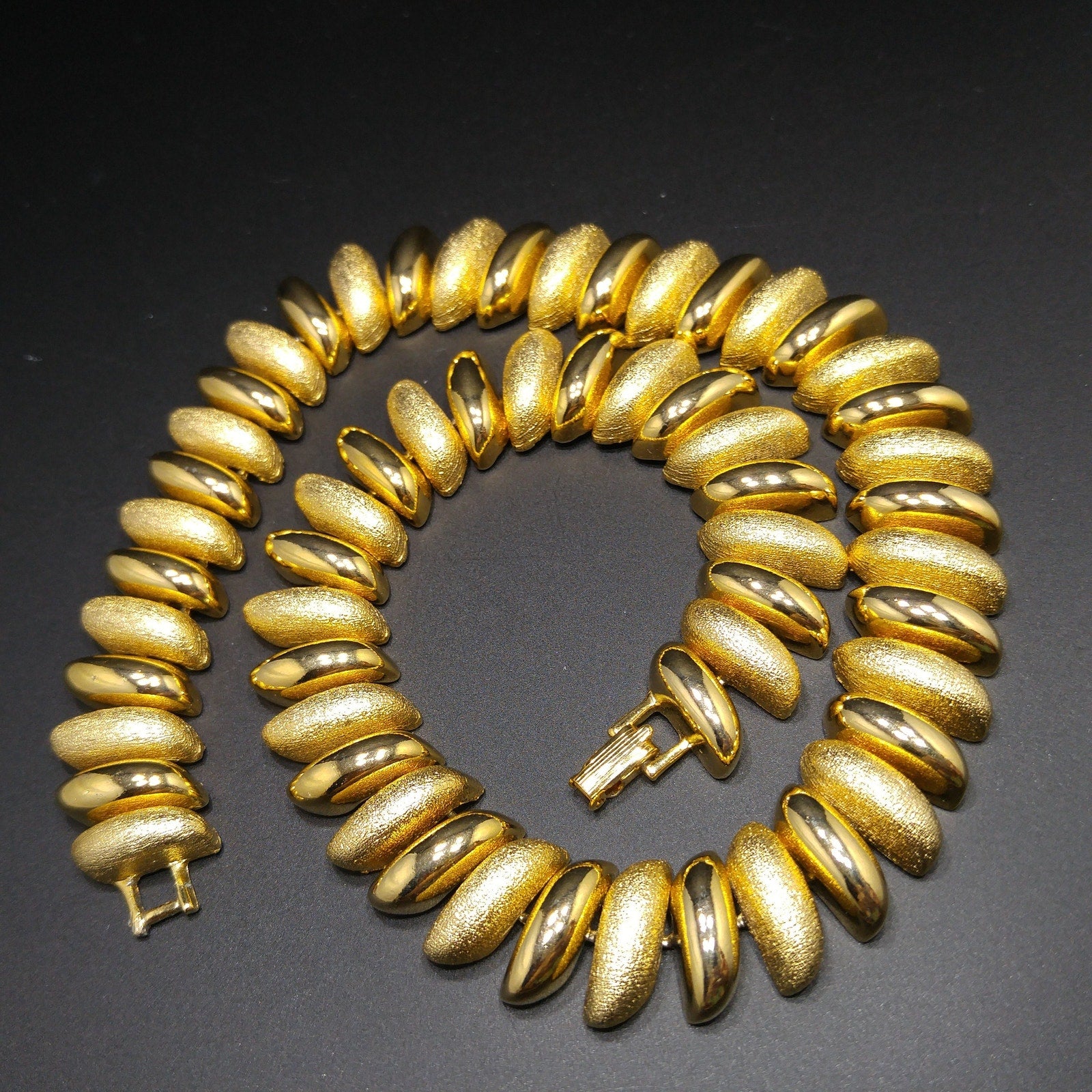 *Description: This is a beautiful gold plated link necklace from the 1980s. The necklace has links in smooth and textured finish. It is substantial at 5.9 ounces. It is a classic look and will be a favorite for years to come. This would be a great addition to your vintage jewelry collection or make a great vintage gift!