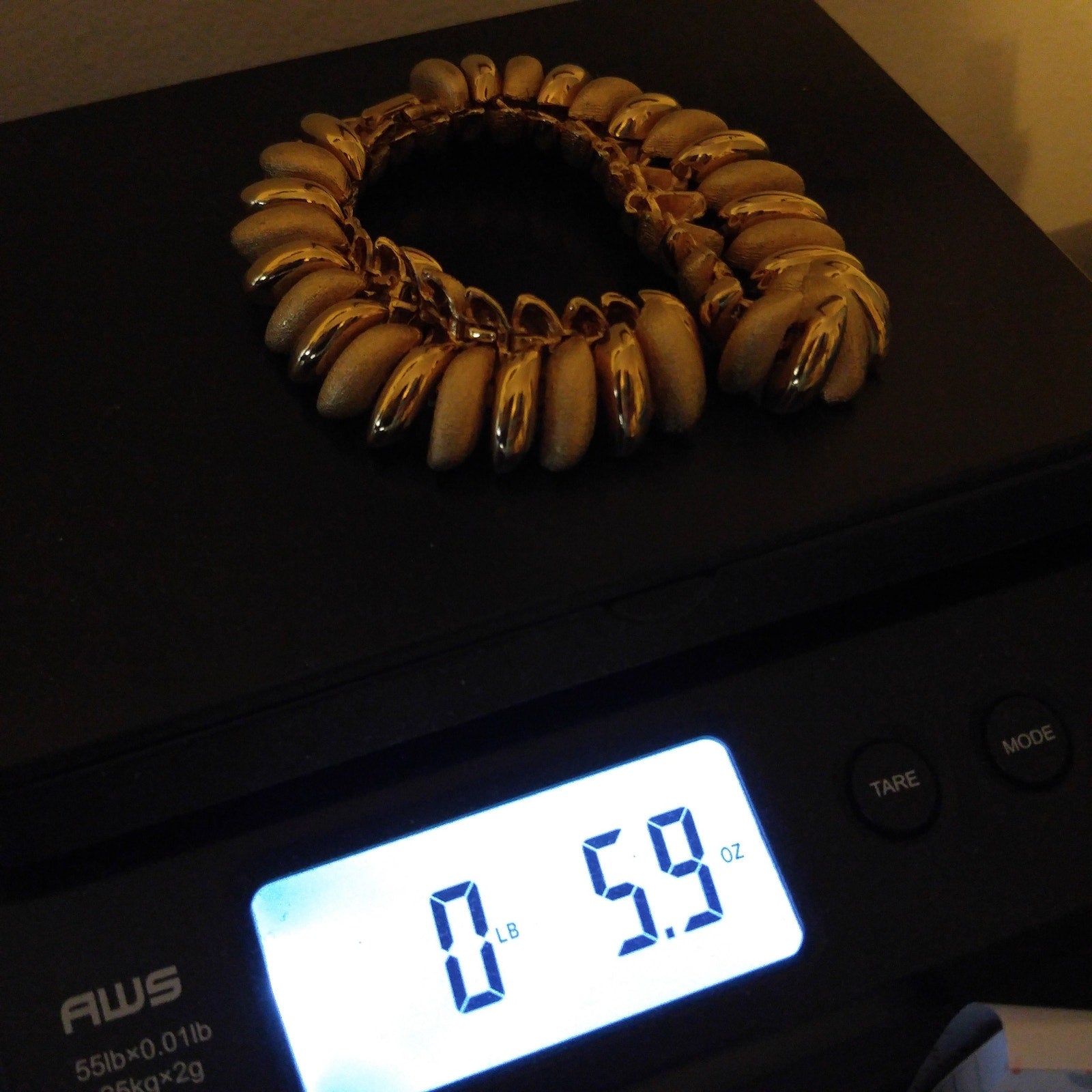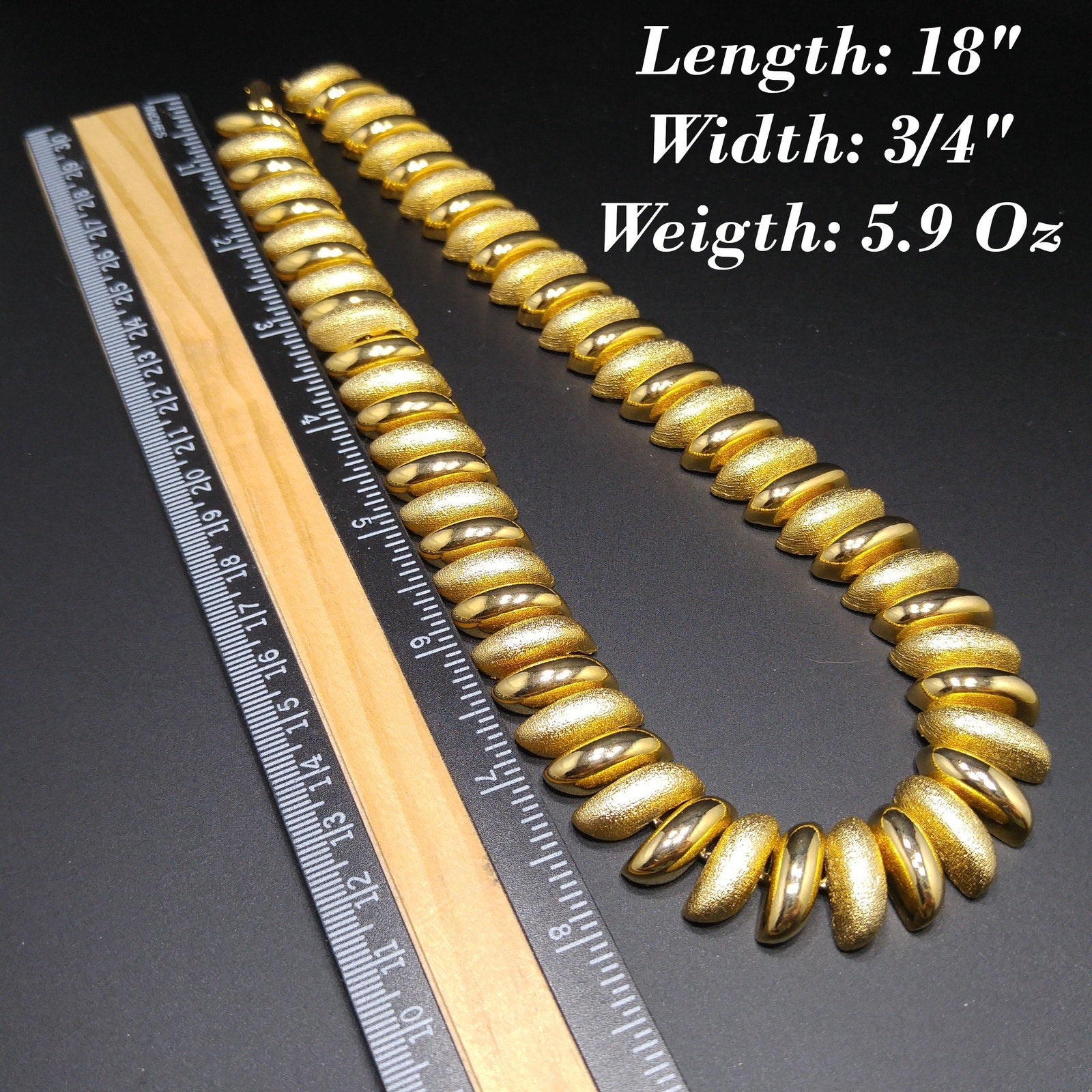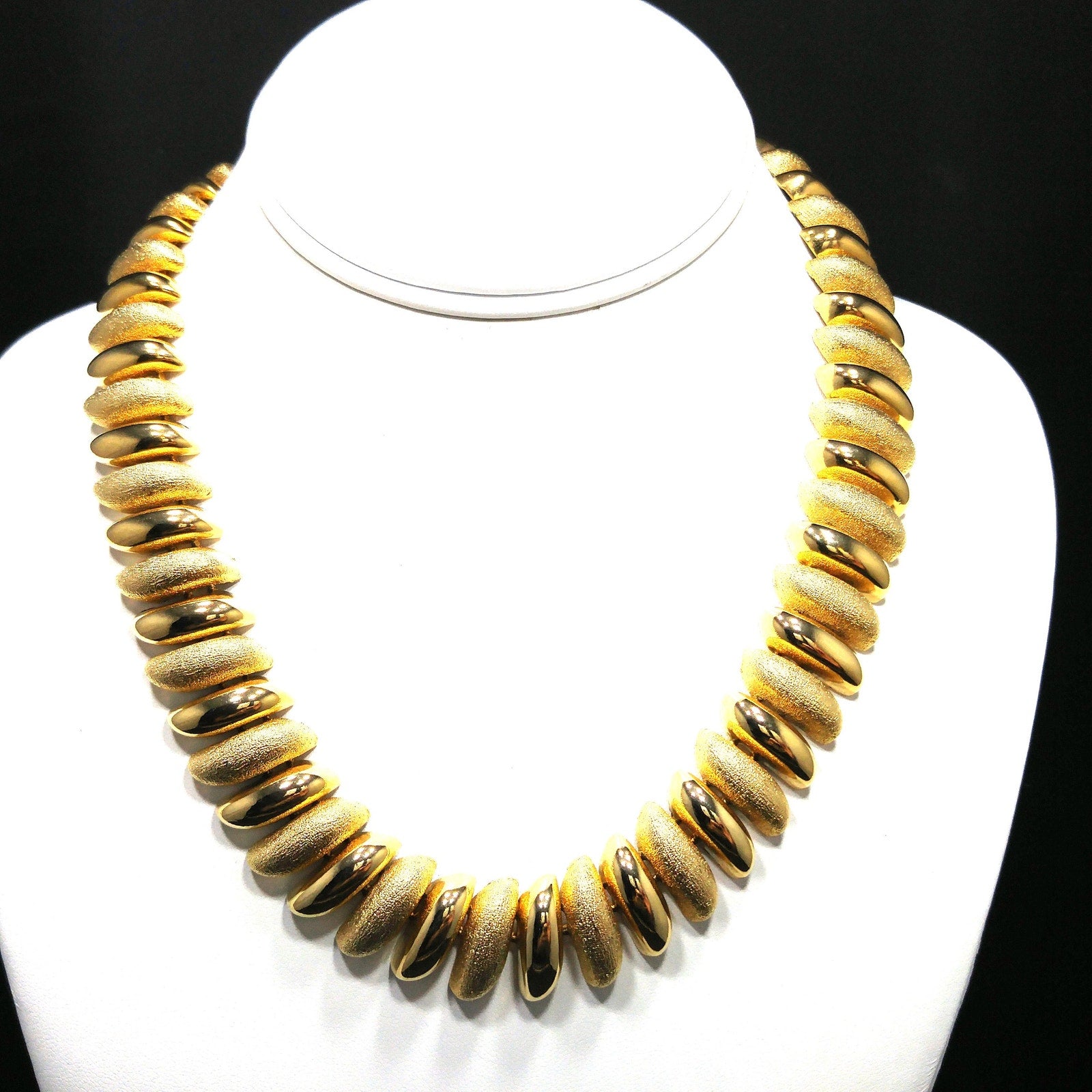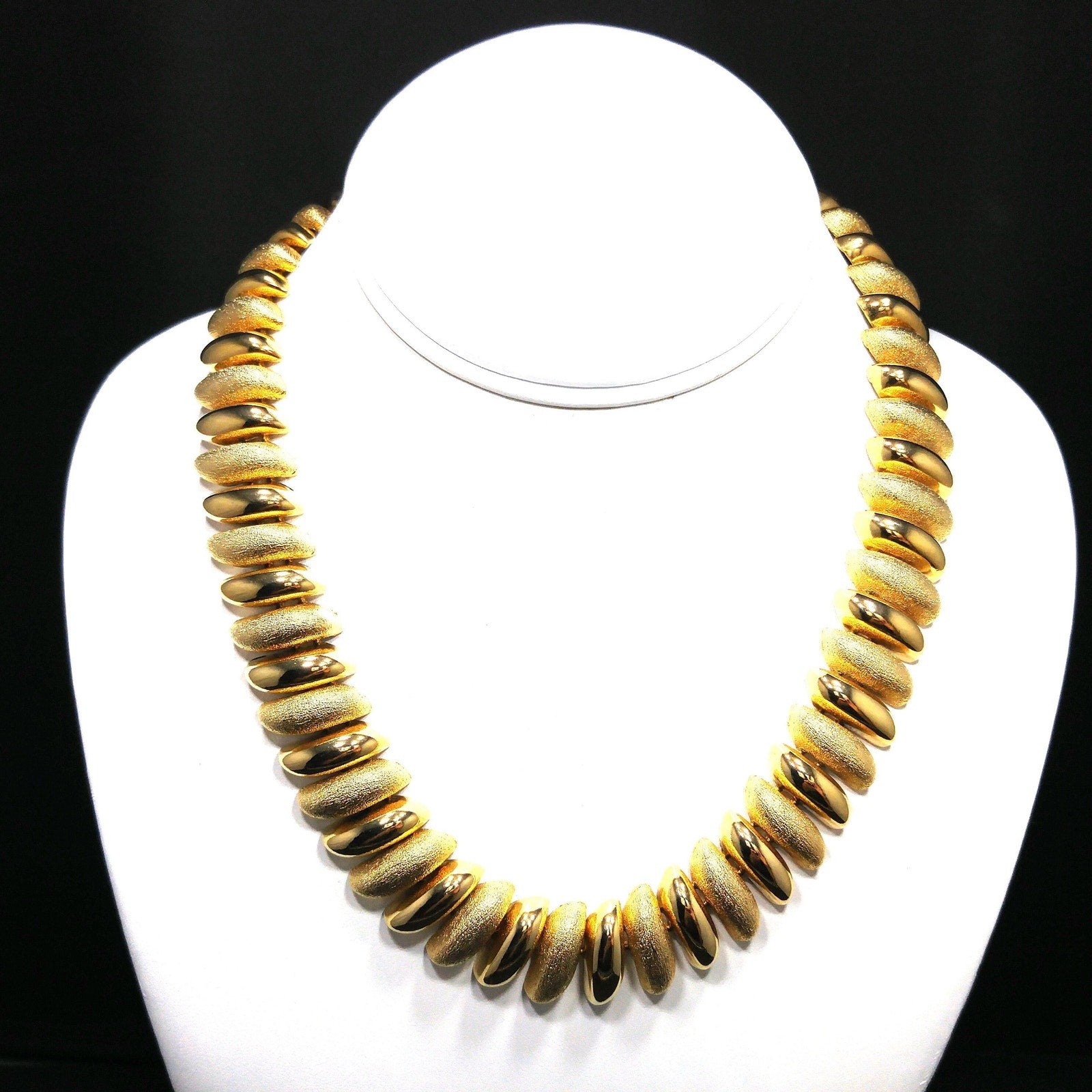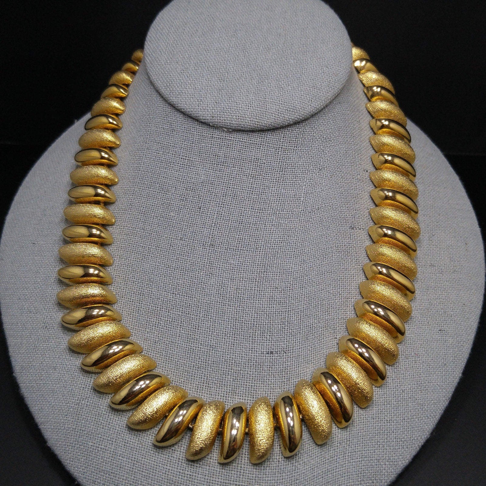 *Description: This is a beautiful gold plated link necklace from the 1980s. The necklace has links in smooth and textured finish. It is substantial at 5.9 ounces. It is a classic look and will be a favorite for years to come. This would be a great addition to your vintage jewelry collection or make a great vintage gift!