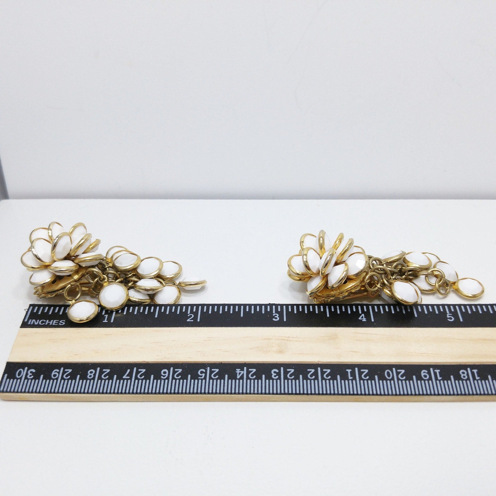 This is a stunning pair of vintage Sorrelli cluster earrings from the 1990s. Each earring features flat white Swarovski crystals framed in gold tone, arranged in a cascading drop design. The cluster effect gives them striking movement and sparkle, perfect for evening wear or adding bold style to any outfit.
