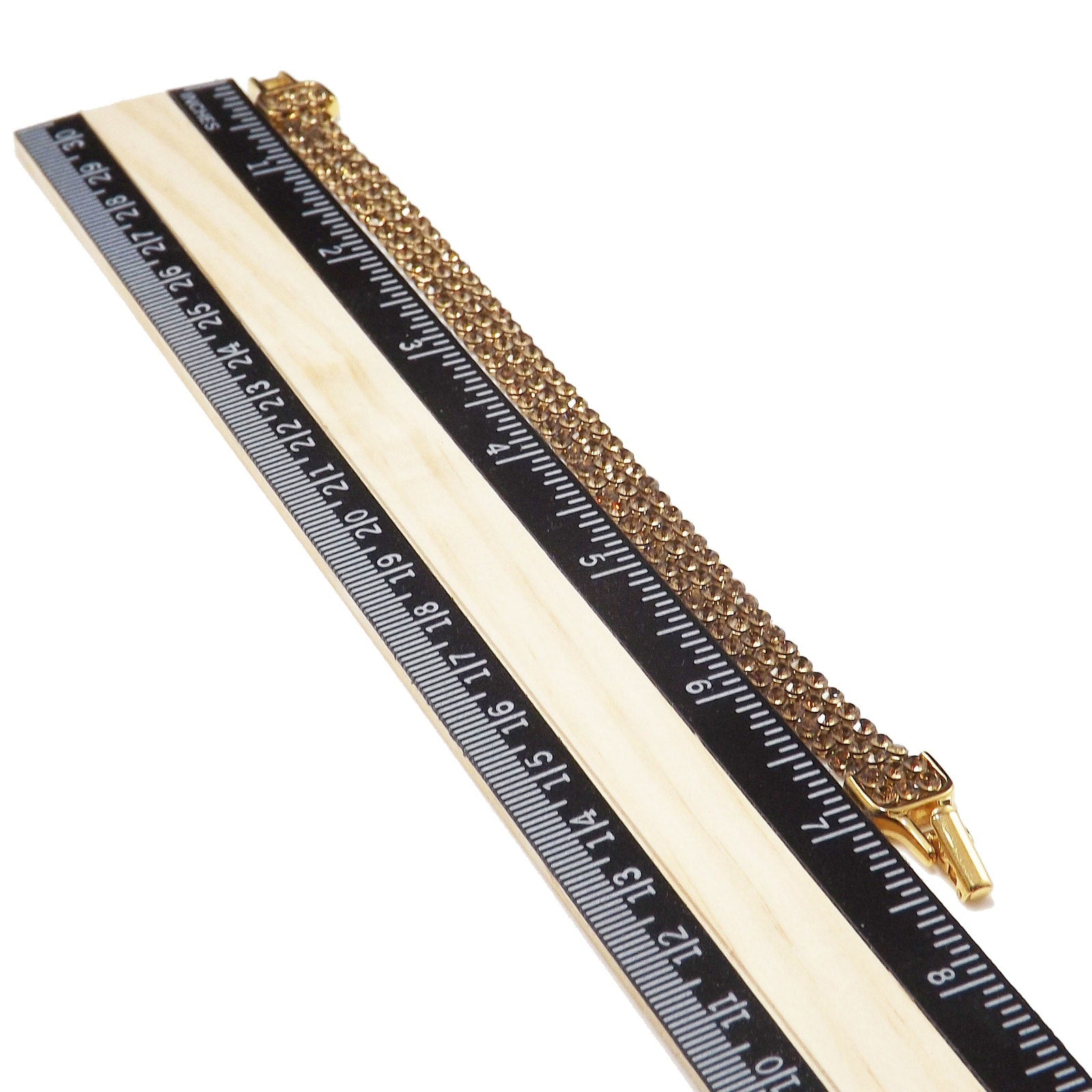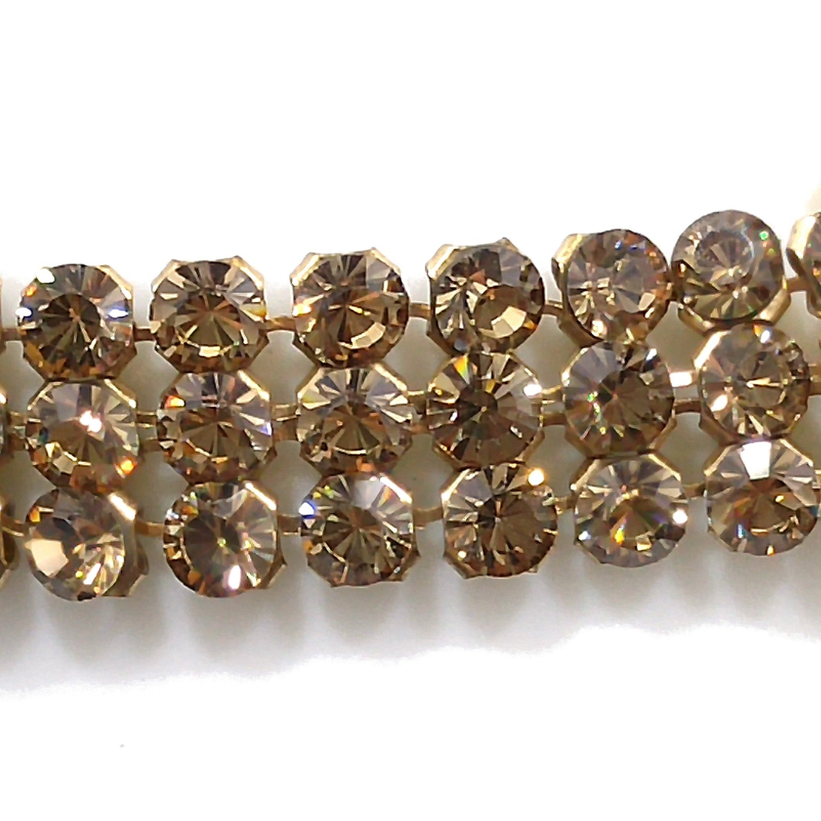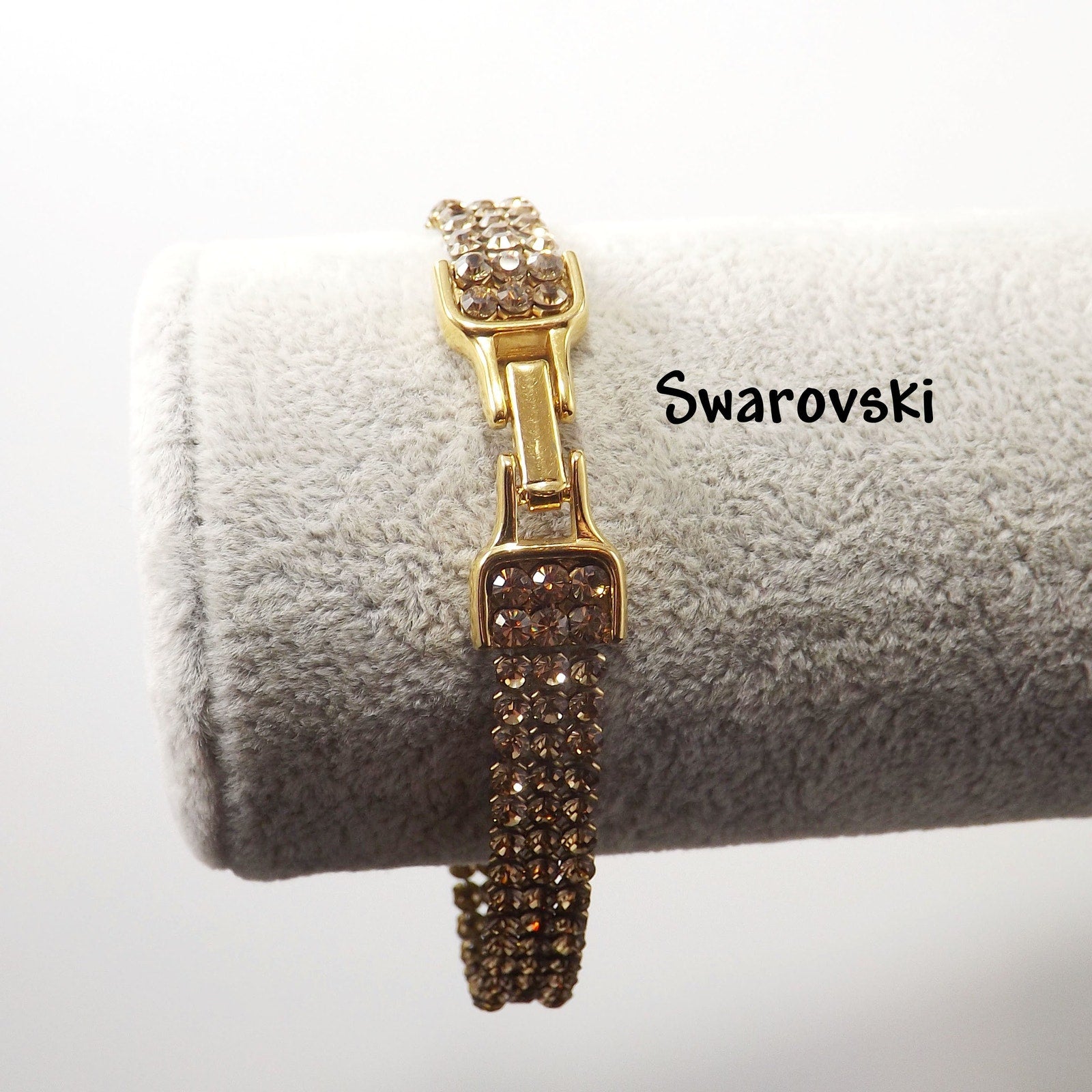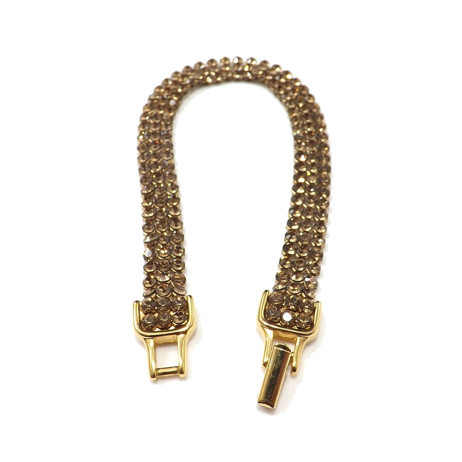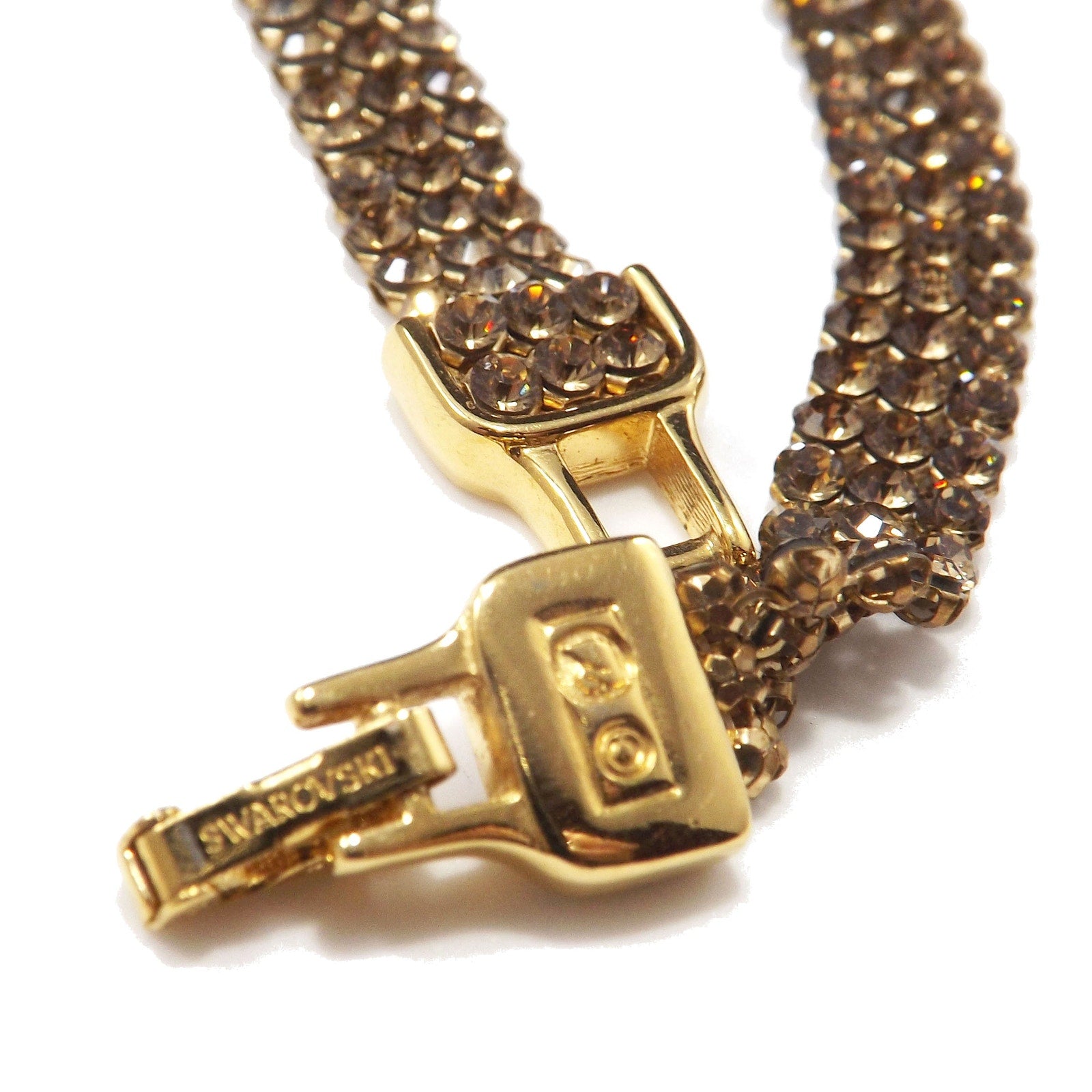 This vintage Swarovski bracelet from the 1990s features sparkling light topaz rhinestones set atop a flexible gold-plated mesh band. Lightweight and comfortable, the bracelet shimmers beautifully with every movement. It closes securely with an alligator clasp stamped SWAROVSKI, with the iconic Swan logo discreetly placed beneath the clasp bar.