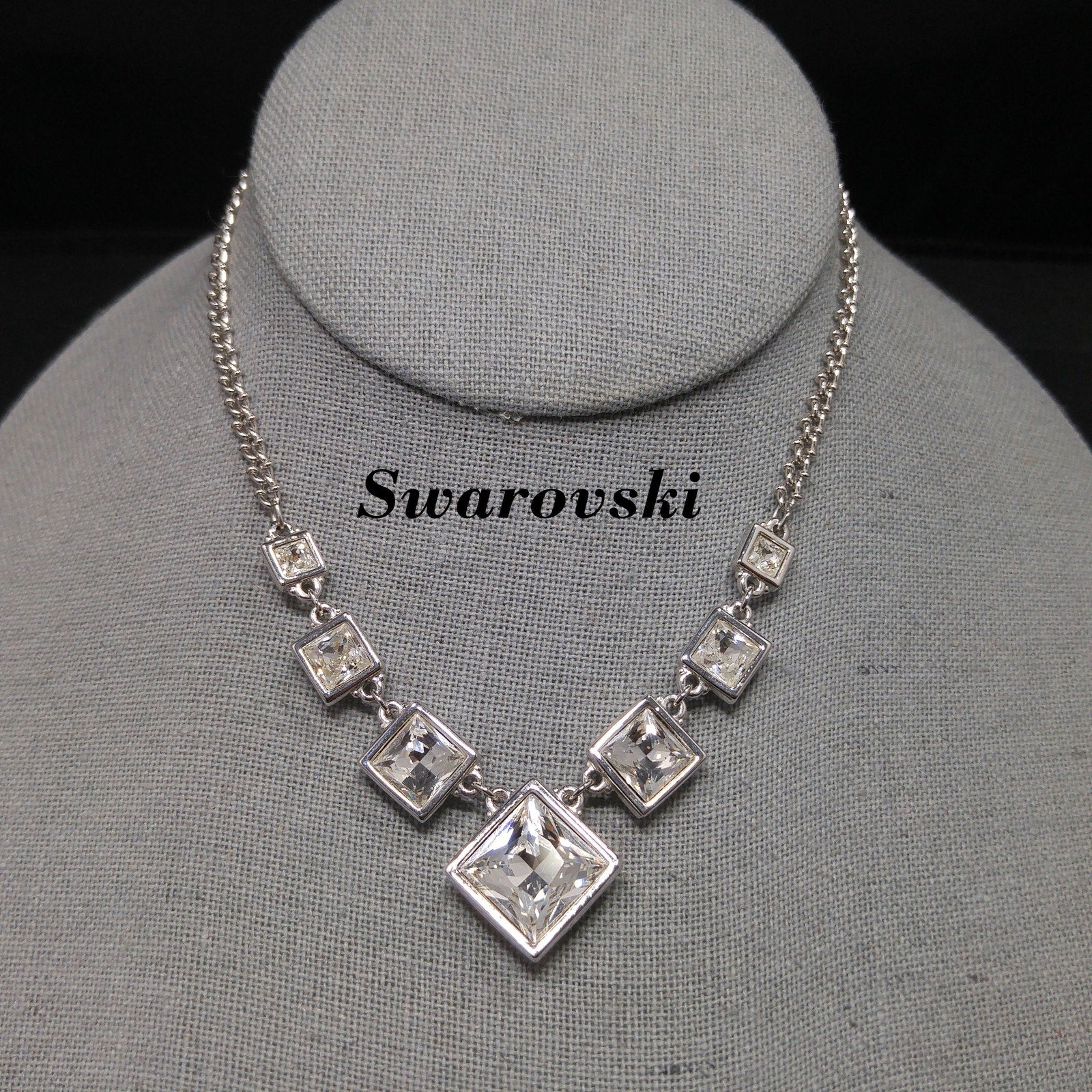 The necklace fastens securely with a thick hook clasp and is signed with Swarovski’s Swan logo hang tag. Measuring 15 1/2 inches, this piece is a timeless addition to any Swarovski collection and makes an elegant vintage gift.
