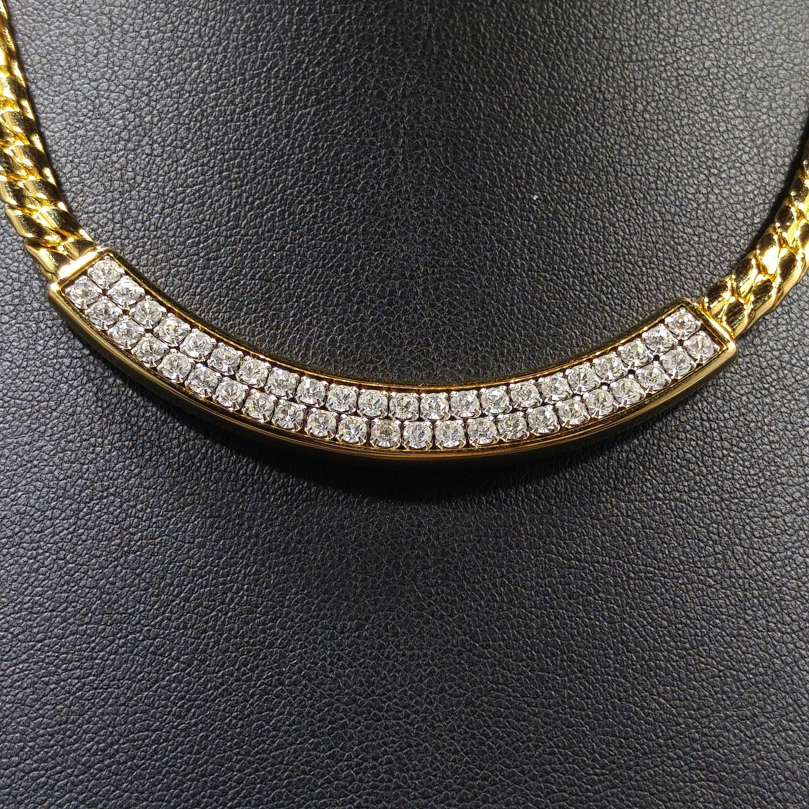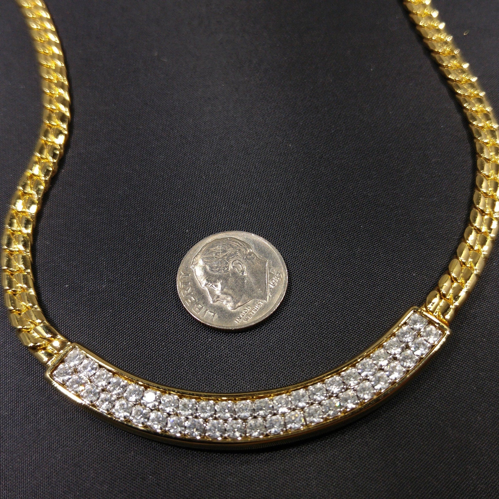 This is a beautiful vintage Swarovski rhinestone frontal necklace from the 1980s. The necklace features a brilliant curved bar centerpiece encrusted with clear Austrian Swarovski crystal rhinestones, set in gold plated metal. The sparkling frontal section measures 2 1/2 inches long and 1/4 inch wide, with additional rhinestone accents on each side of the clasp.