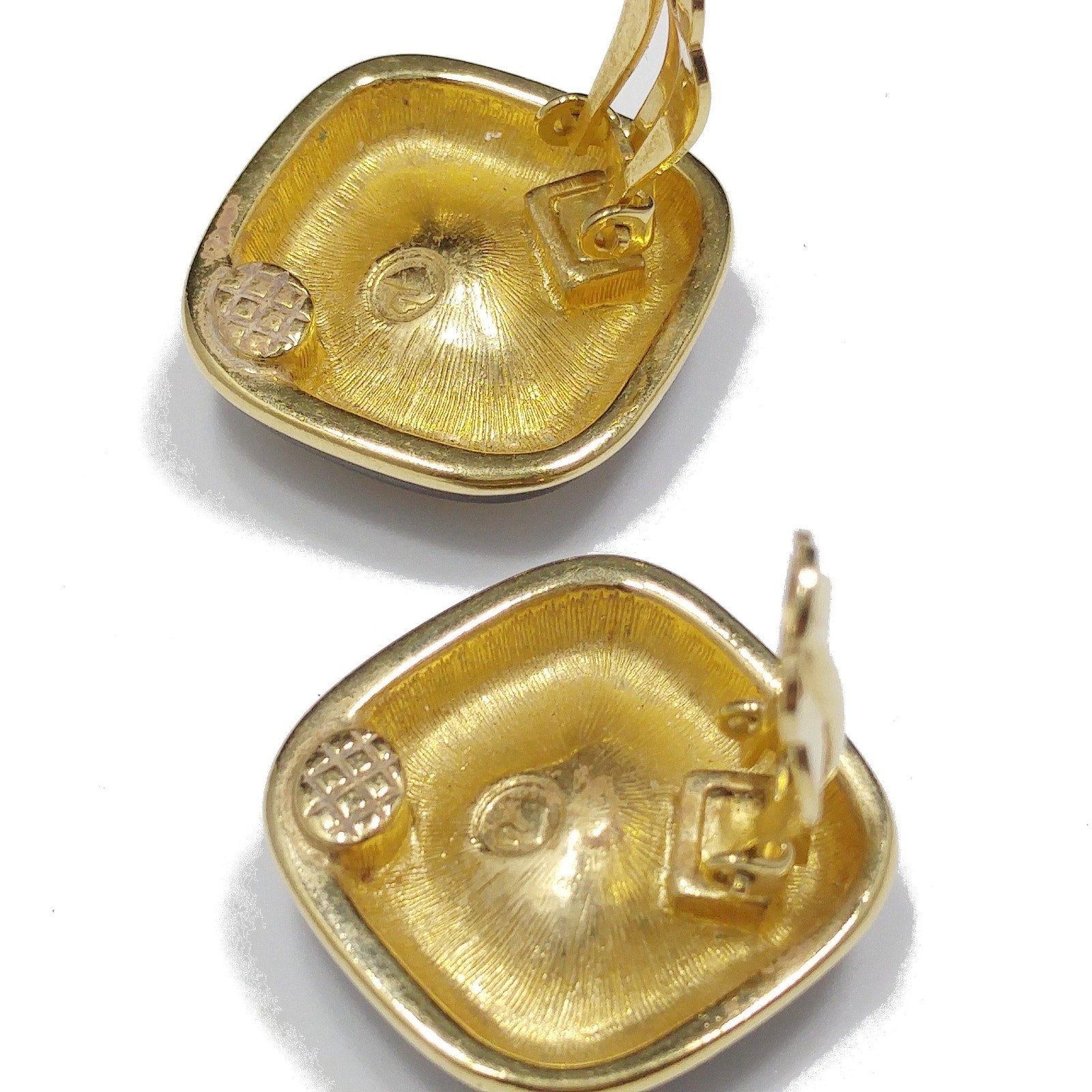 These striking vintage Swarovski clip-on earrings from the 1980s feature bold black enamel paired with faceted red crystal rhinestones at the center. Set in a gold-plated frame, they capture the dramatic, glamorous style of the decade.