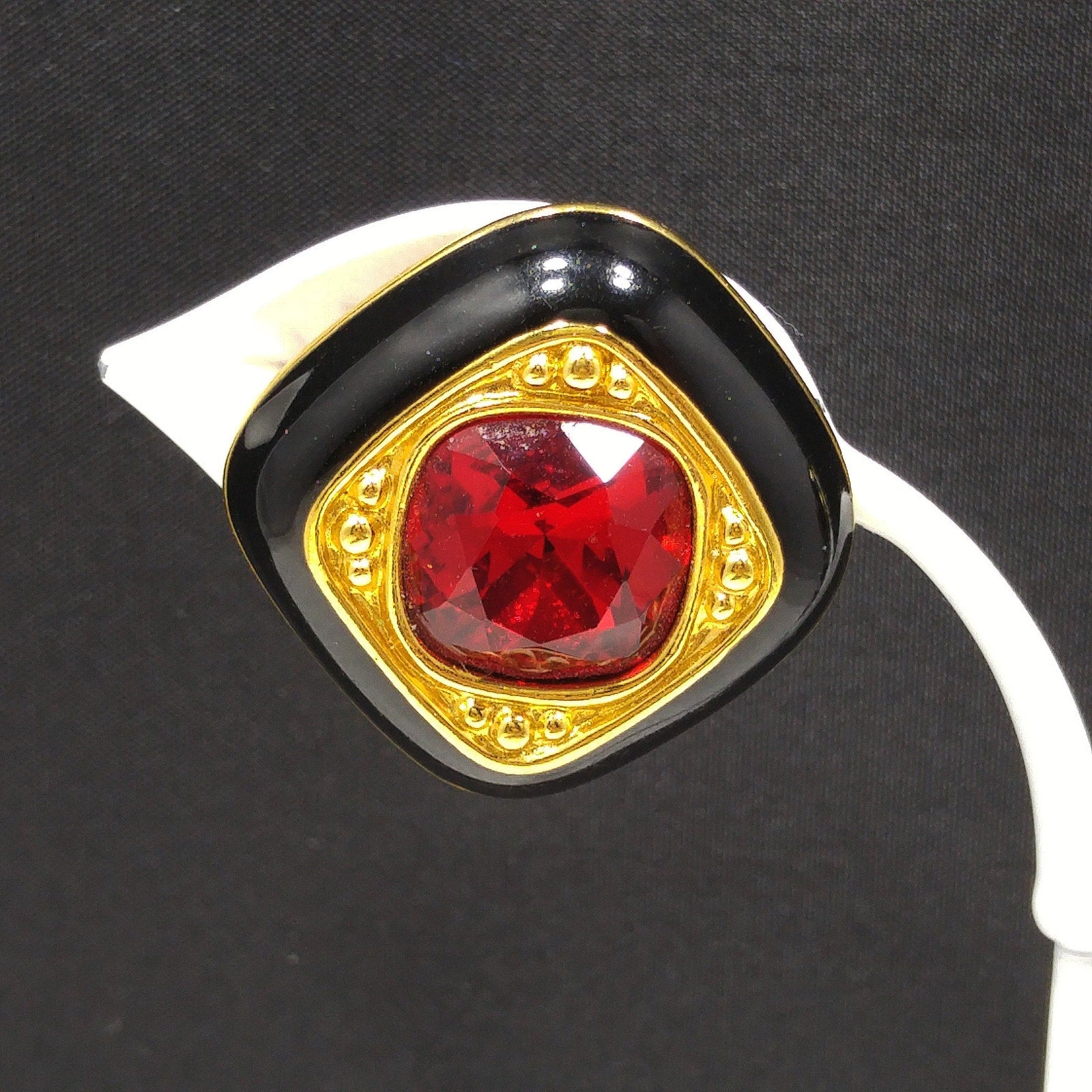 Vintage Swarovski Clip Earrings – Black Enamel & Red Crystal, Gold Plated 1980s
