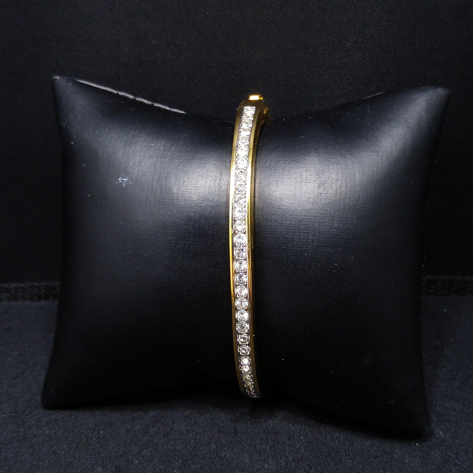 This is a stunning vintage Swarovski bangle bracelet from the late 1980s to 1990s. The bracelet is gold plated and features a sleek hinged design with a single row of sparkling Swarovski crystal rhinestones across the top. Stamped with the iconic Swan Logo, this piece captures the elegance and timeless beauty that Swarovski is known for. It closes securely with a snap, making it perfect for both everyday wear and special occasions. A wonderful addition to your vintage jewelry collection or a thoughtful gift for someone special.