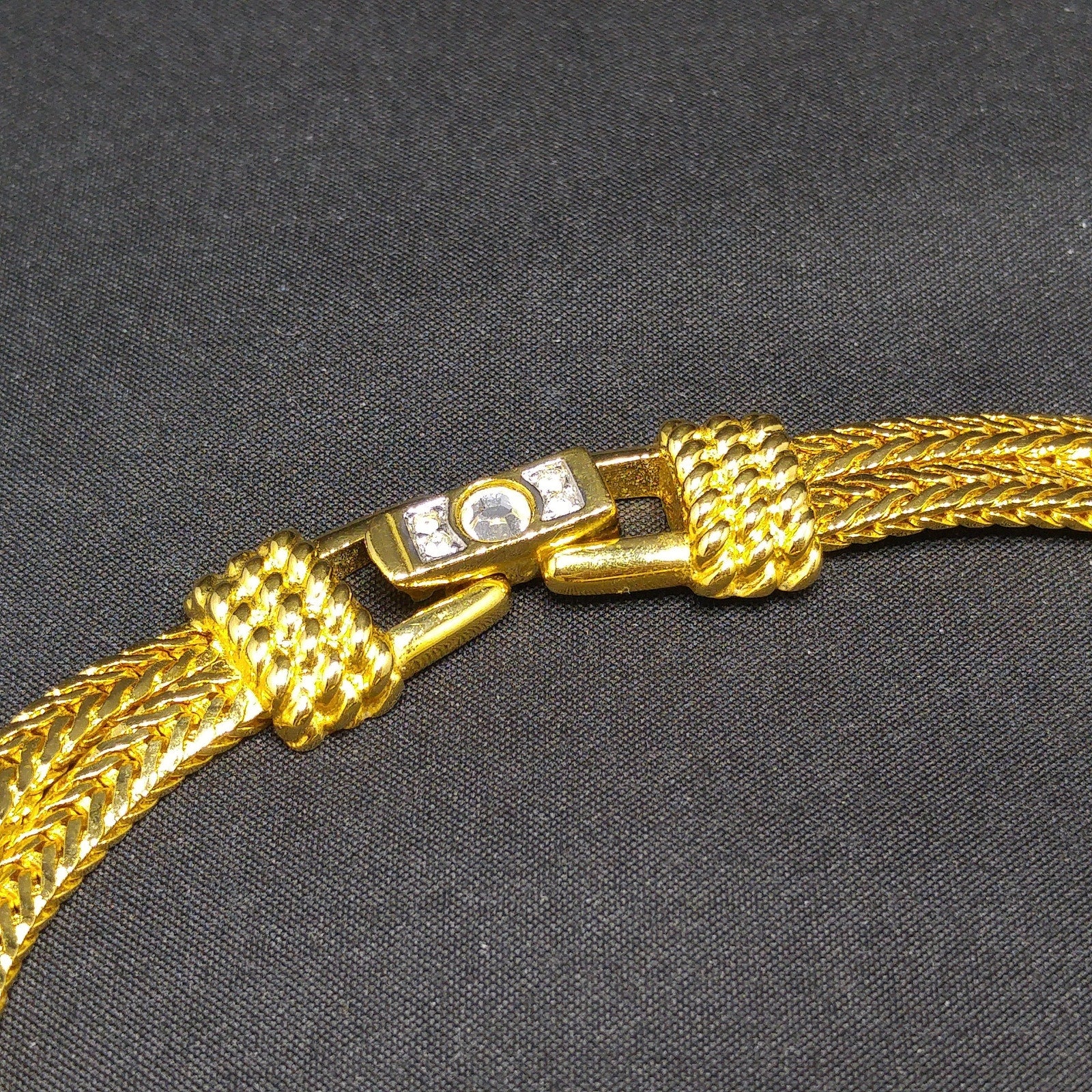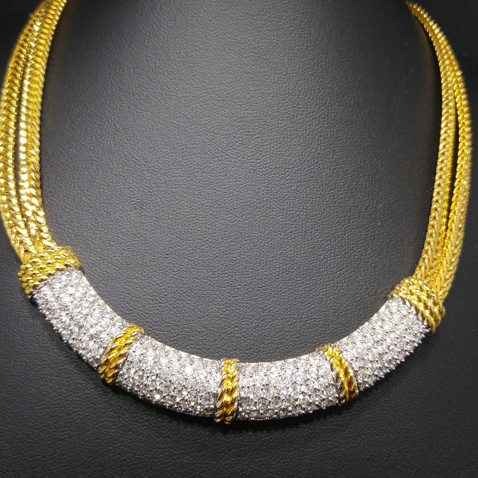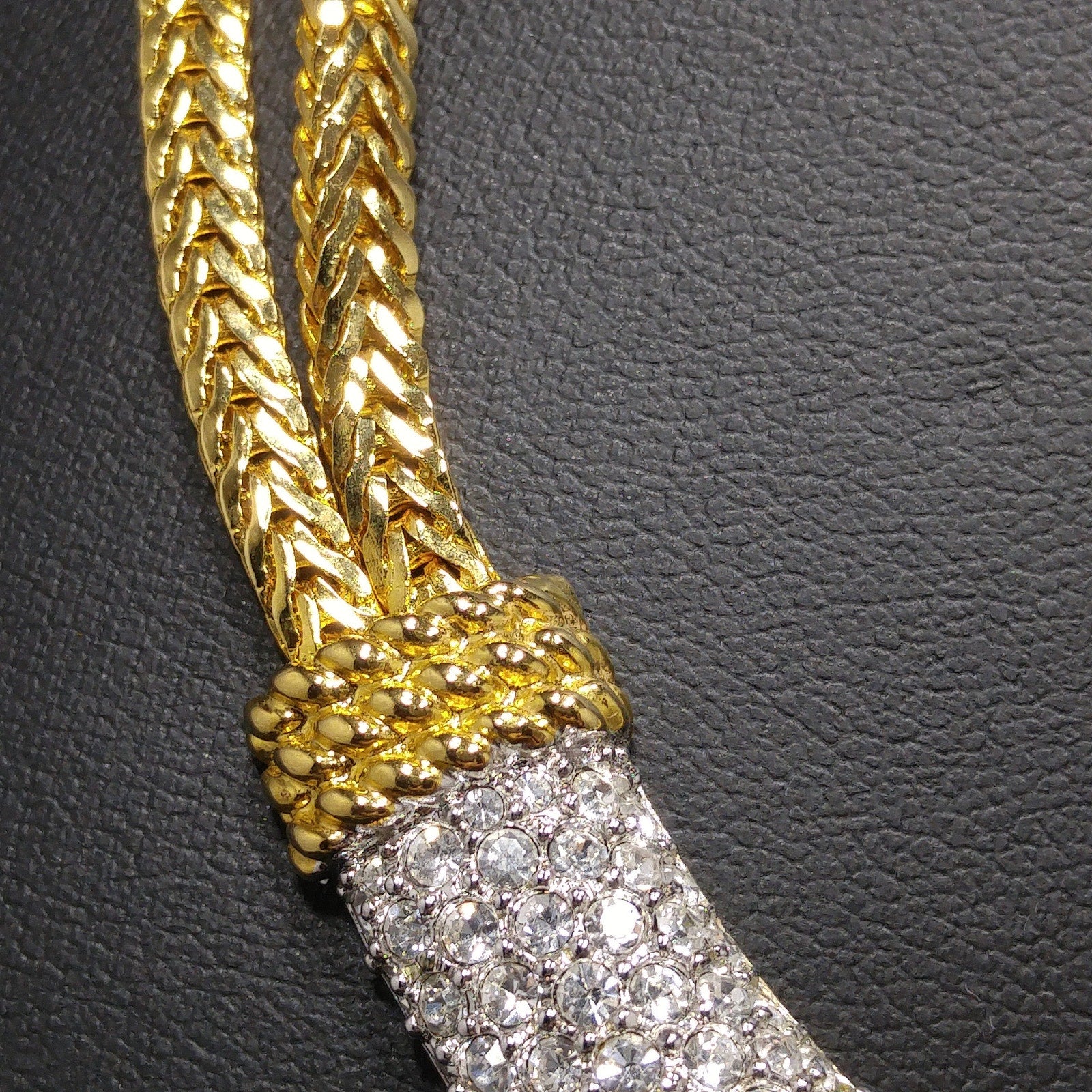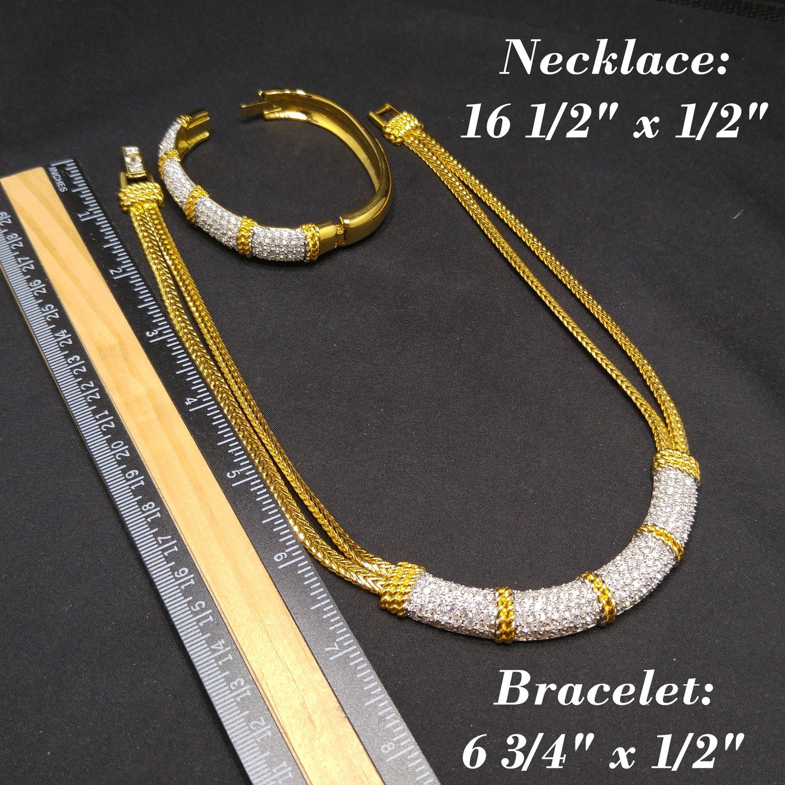 The necklace measures 16 1/2 inches with double wheat chains and a rhinestone-accented fold-over clasp. Its frontal design shimmers with Swarovski crystals, and the pendant reverse is stamped with the Swan logo. The matching hinged bracelet mirrors the necklace with a crystal top and solid gold-plated reverse. Inside measurement is 6 3/4 inches when closed.