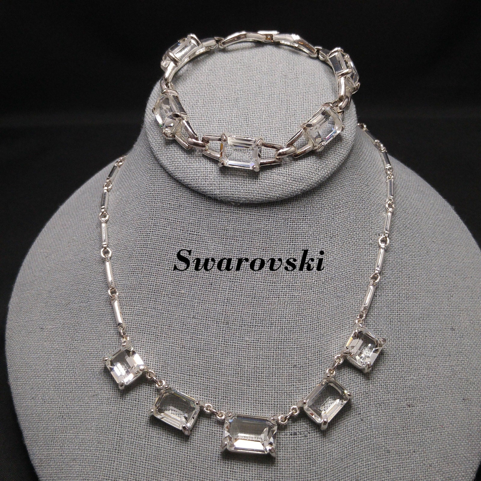 The necklace features an adjustable extension chain with a lobster clasp and Swarovski’s signature Swan Logo hang tag. The matching bracelet has a secure alligator clasp and is stamped SWAROVSKI on the clasp. Together, the set makes an elegant statement perfect for evening wear, bridal occasions, or as a collectible addition to any Swarovski jewelry collection.