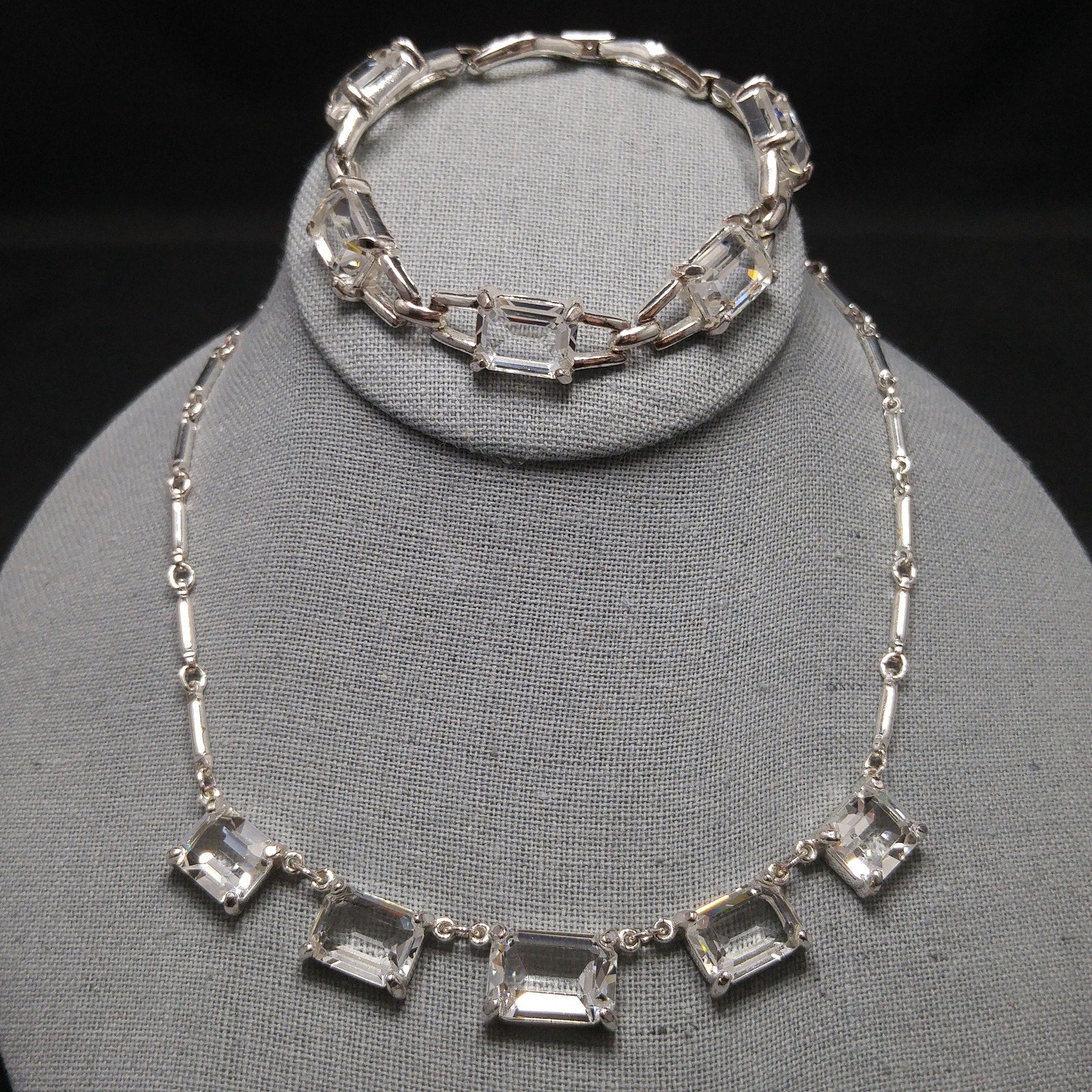 This vintage Swarovski necklace and bracelet set from the 1990s showcases bold emerald-cut crystals in a sleek and timeless design. Each large clear rhinestone is faceted and prong-set for maximum sparkle, with a rhodium plated backing for a brilliant silver-tone finish.