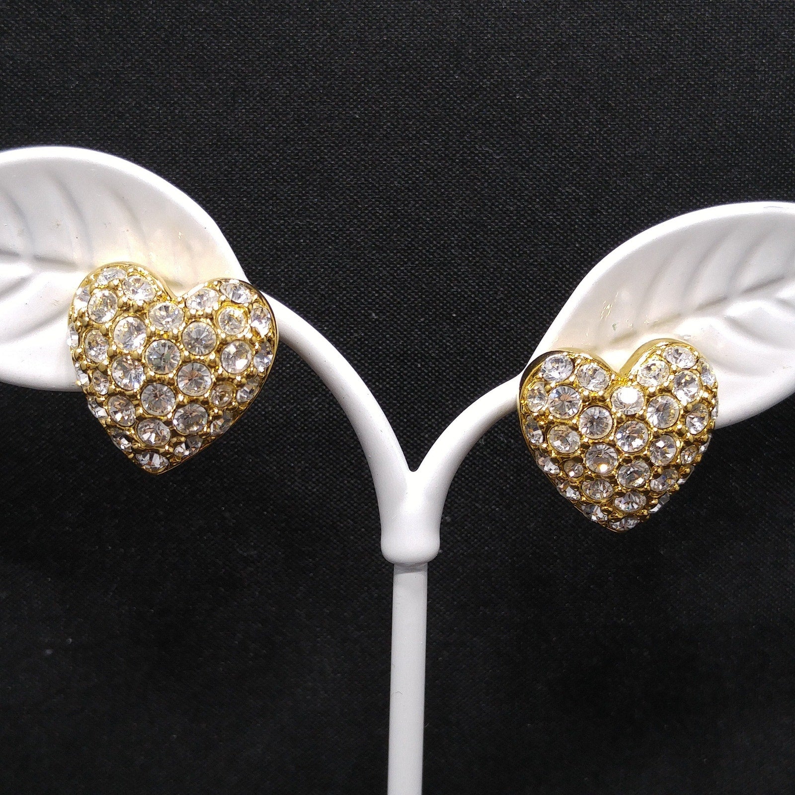 Vintage Swarovski Swan Logo Heart Earrings Clear Pave Rhinestones Gold 1980s