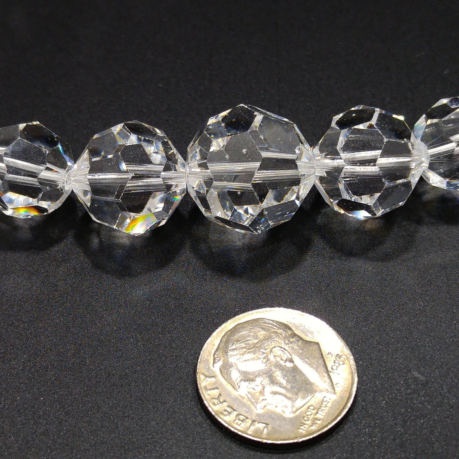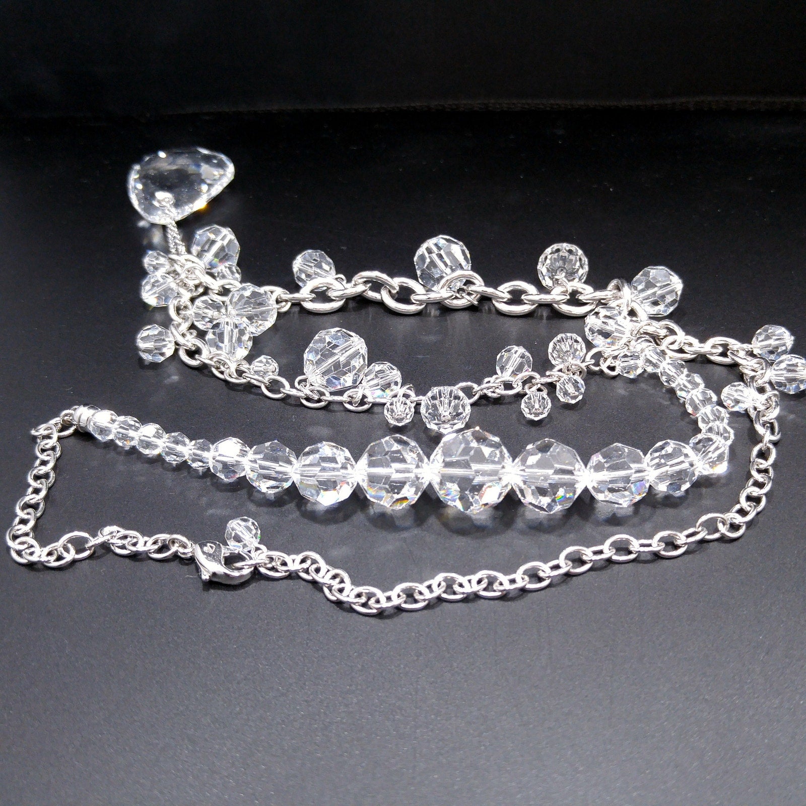 This vintage Swarovski necklace from the 1990s is a rare and striking design. The long 30-inch silver-tone chain is accented with dangling faceted crystals along both sides, with larger graduated crystal beads on one side for a unique asymmetrical look.