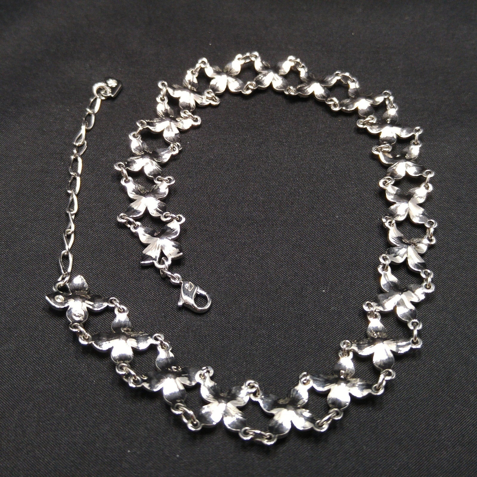 This vintage Swarovski floral choker necklace from the 1990s is a timeless and elegant design. Each link is shaped like a flower with sparkling clear Swarovski rhinestones forming the petals and a luminous faux pearl at the center.