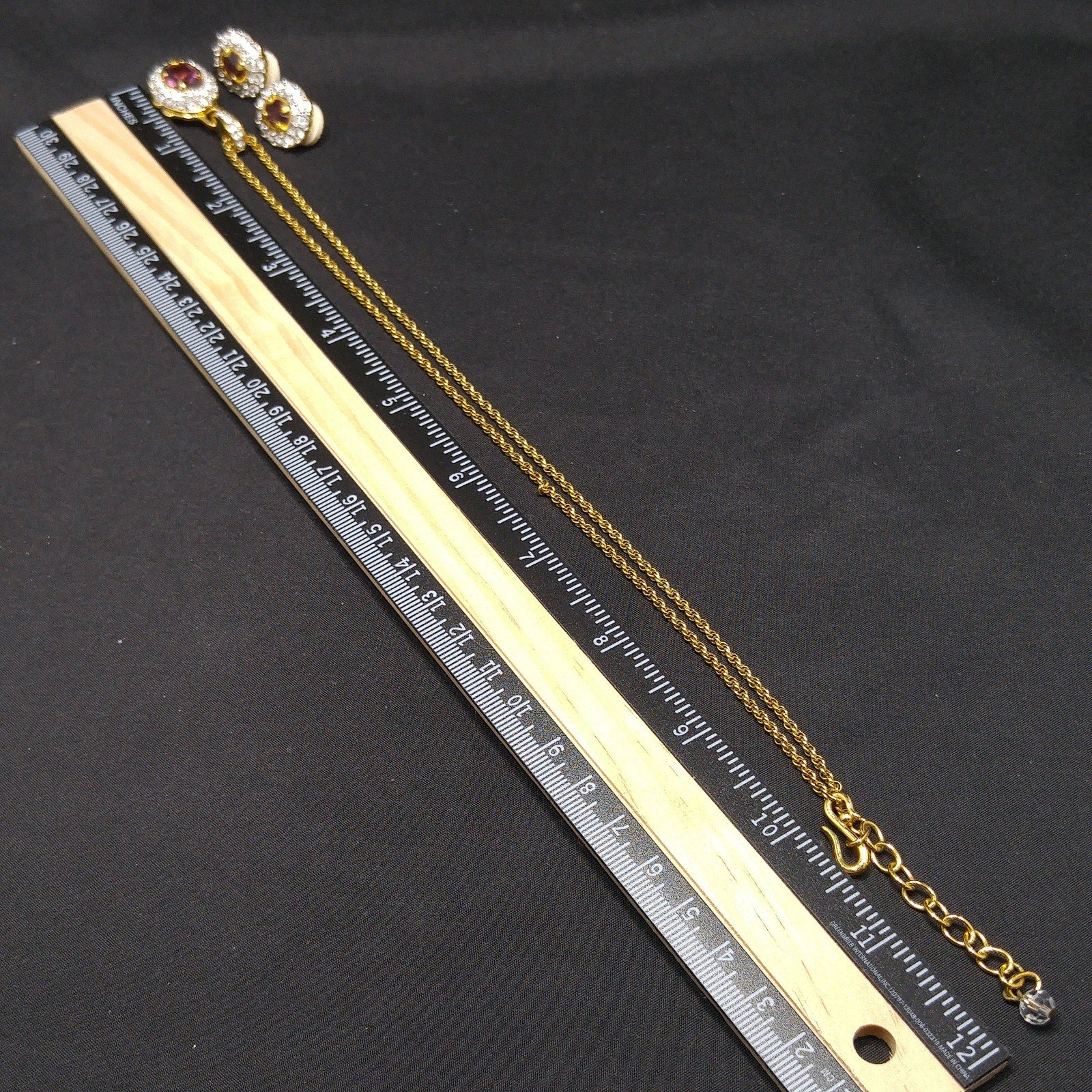The pendant hangs from a gold plated rope chain with an S-shaped clasp and extension chain for adjustable length. The matching clip-on earrings echo the pendant’s design, with oval purple crystals framed by clear rhinestones in a halo setting.