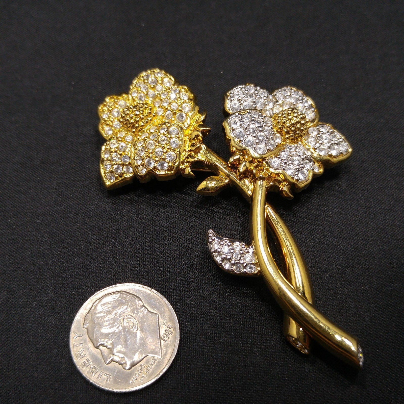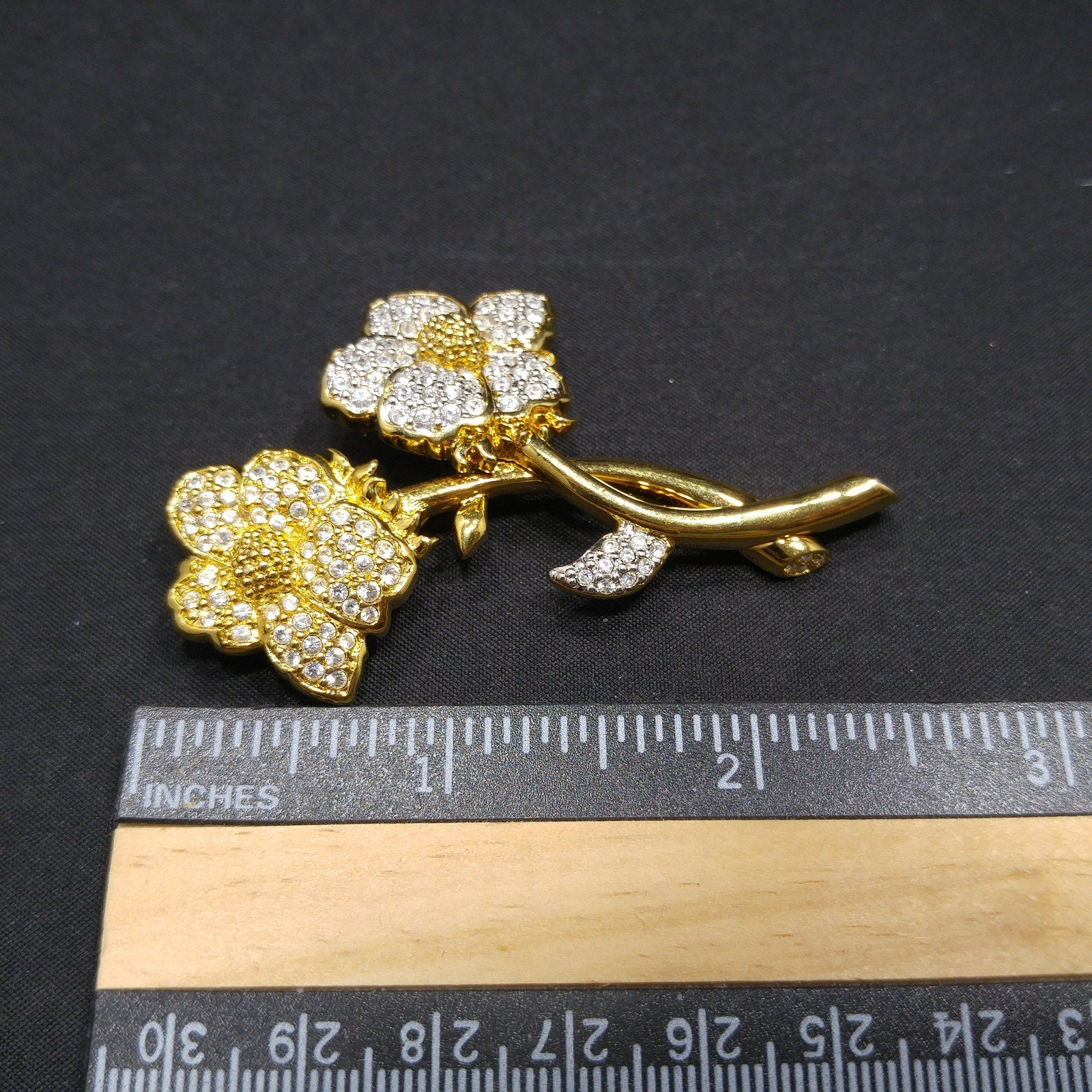 Vintage Swarovski Year 2000 Two Flower Brooch – Gold Plated with Clear Rhinestones