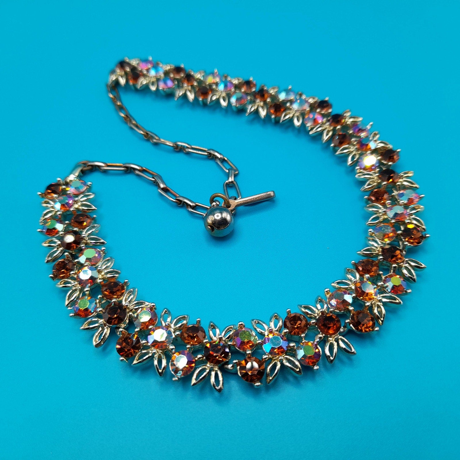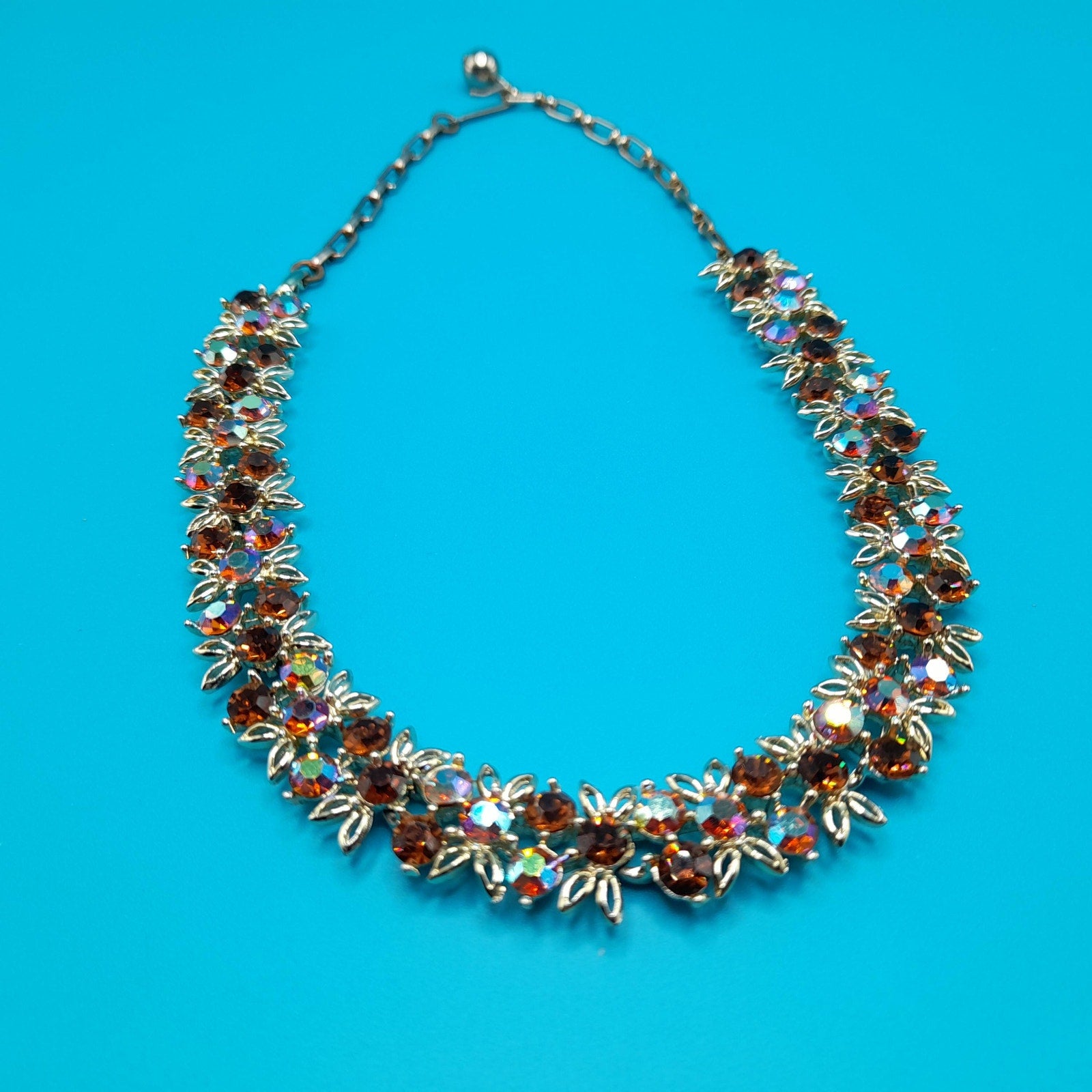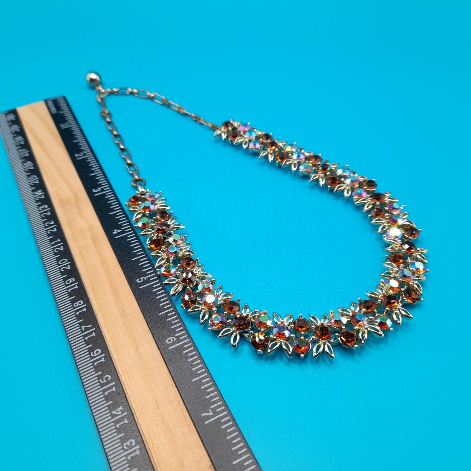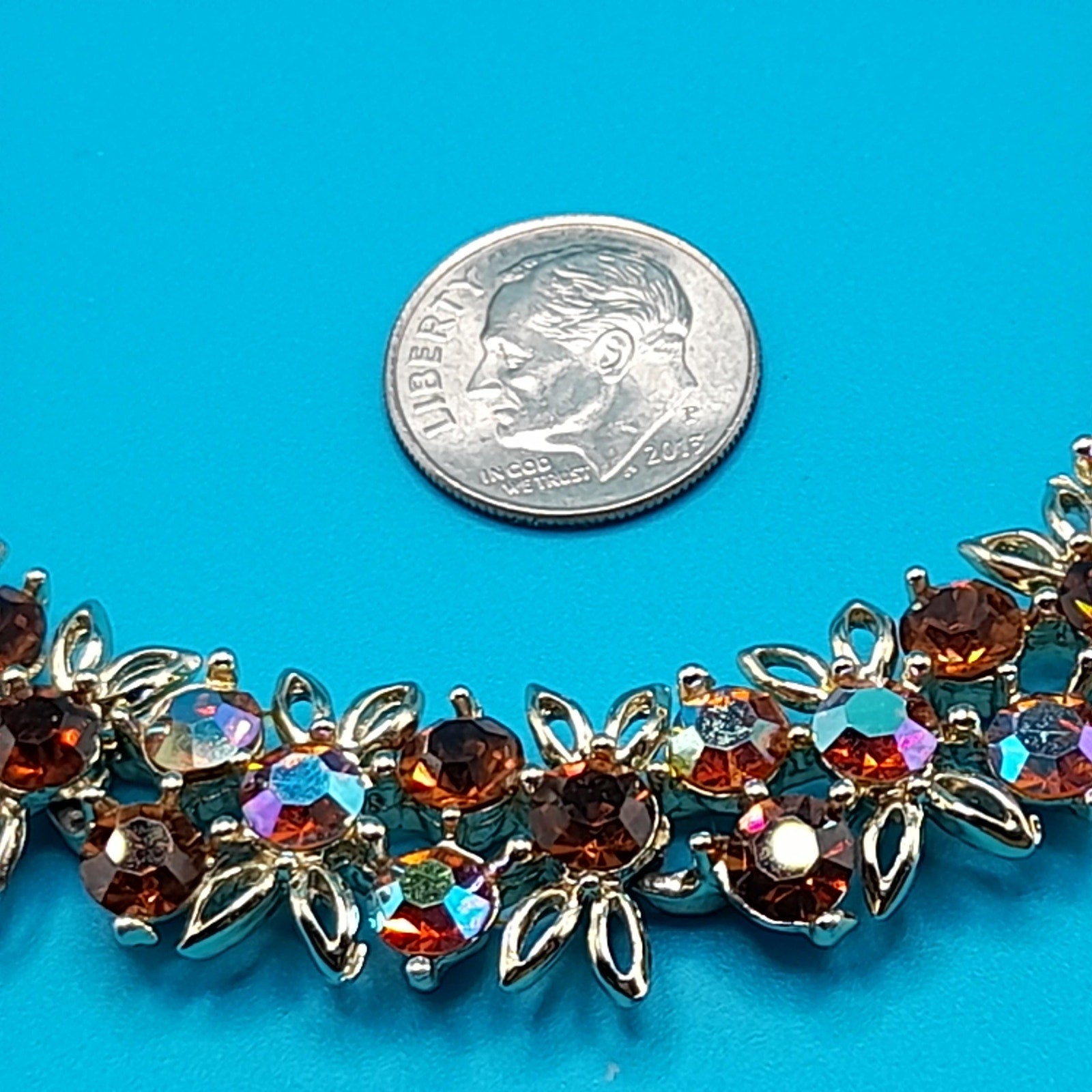 *Description: This is a beautiful mid-century vintage rhinestone choker necklace with aurora borealis topaz rhinestones and topaz rhinestones in a little darker color on a gold tone necklace from the 1960s.  Each link has six rhinestones and they are set in flower petals which makes this choker necklace elegant and full of sparkle. It would look gorgeous at any formal event.  The hook was signs but the wording was not readable after printing so the designer is unknown. This would be a great addition to your vintage jewelry collection or make a great vintage gift!