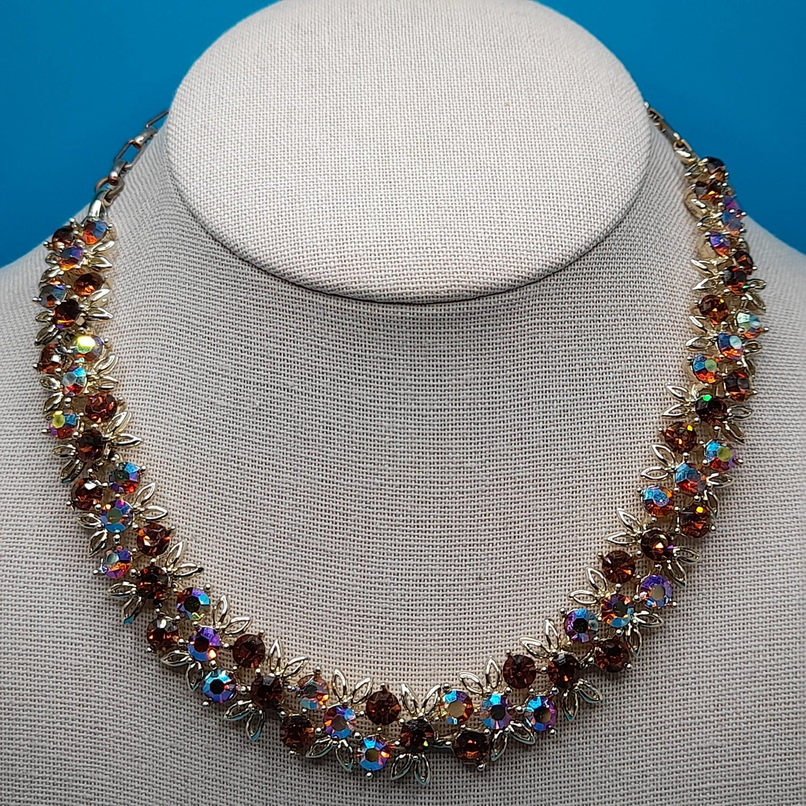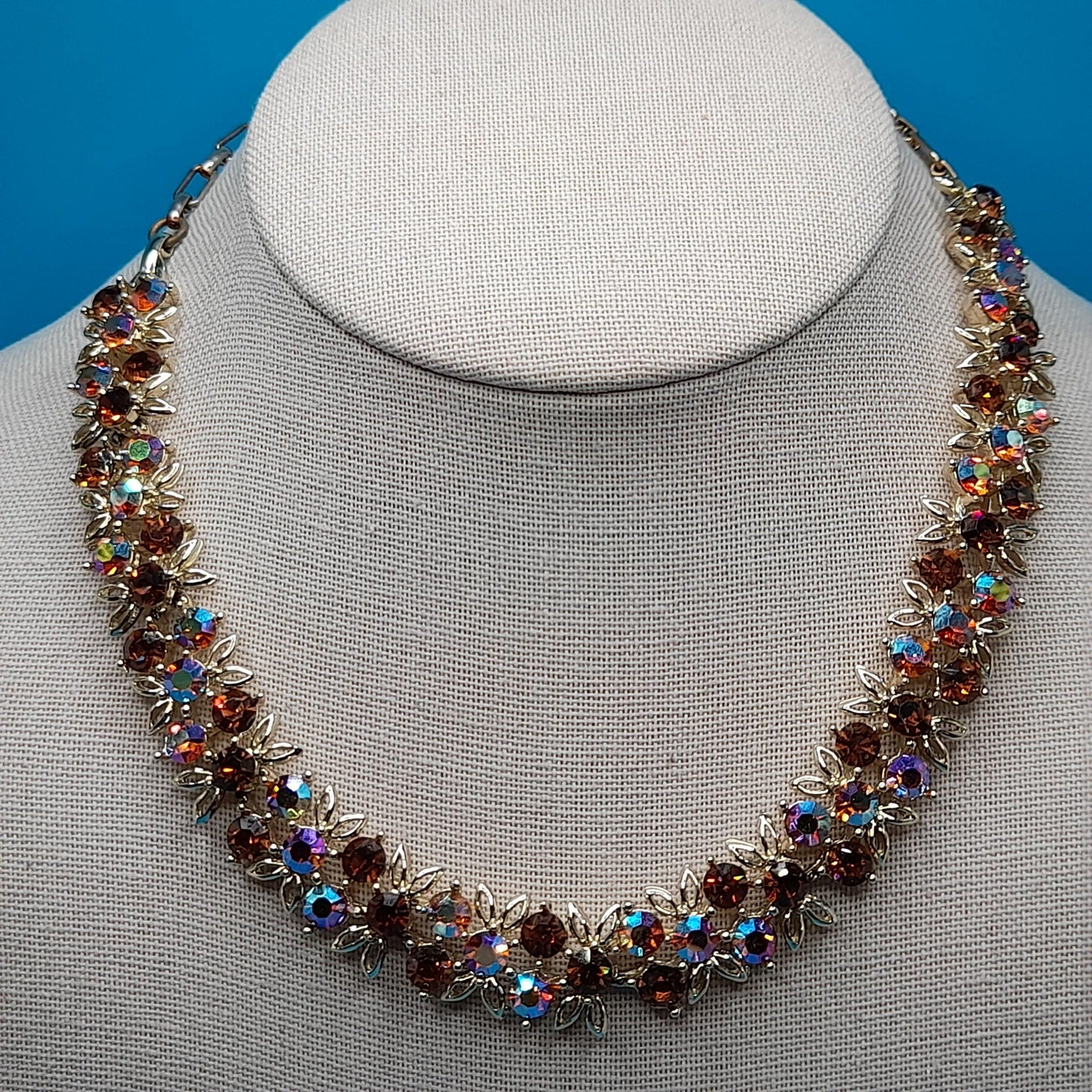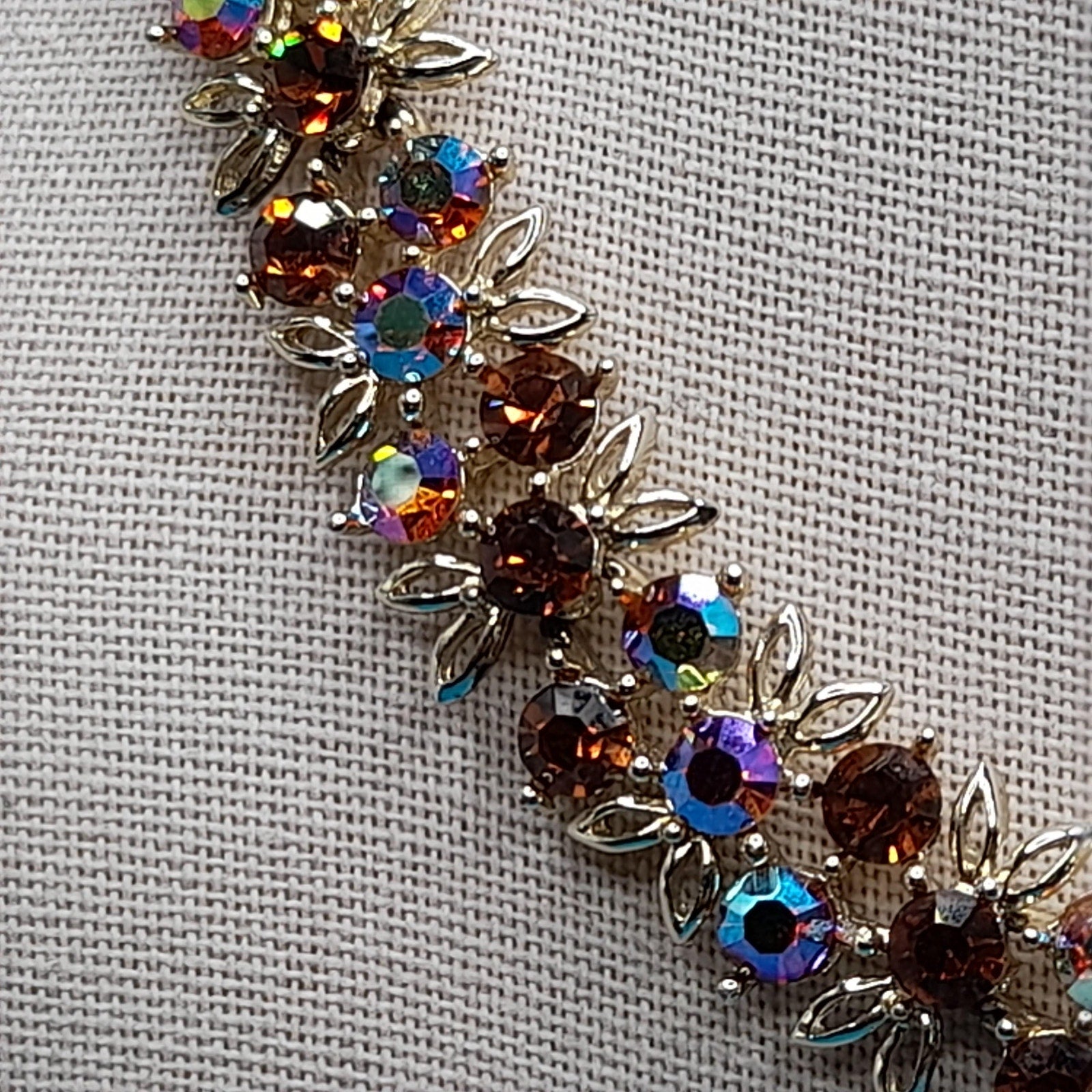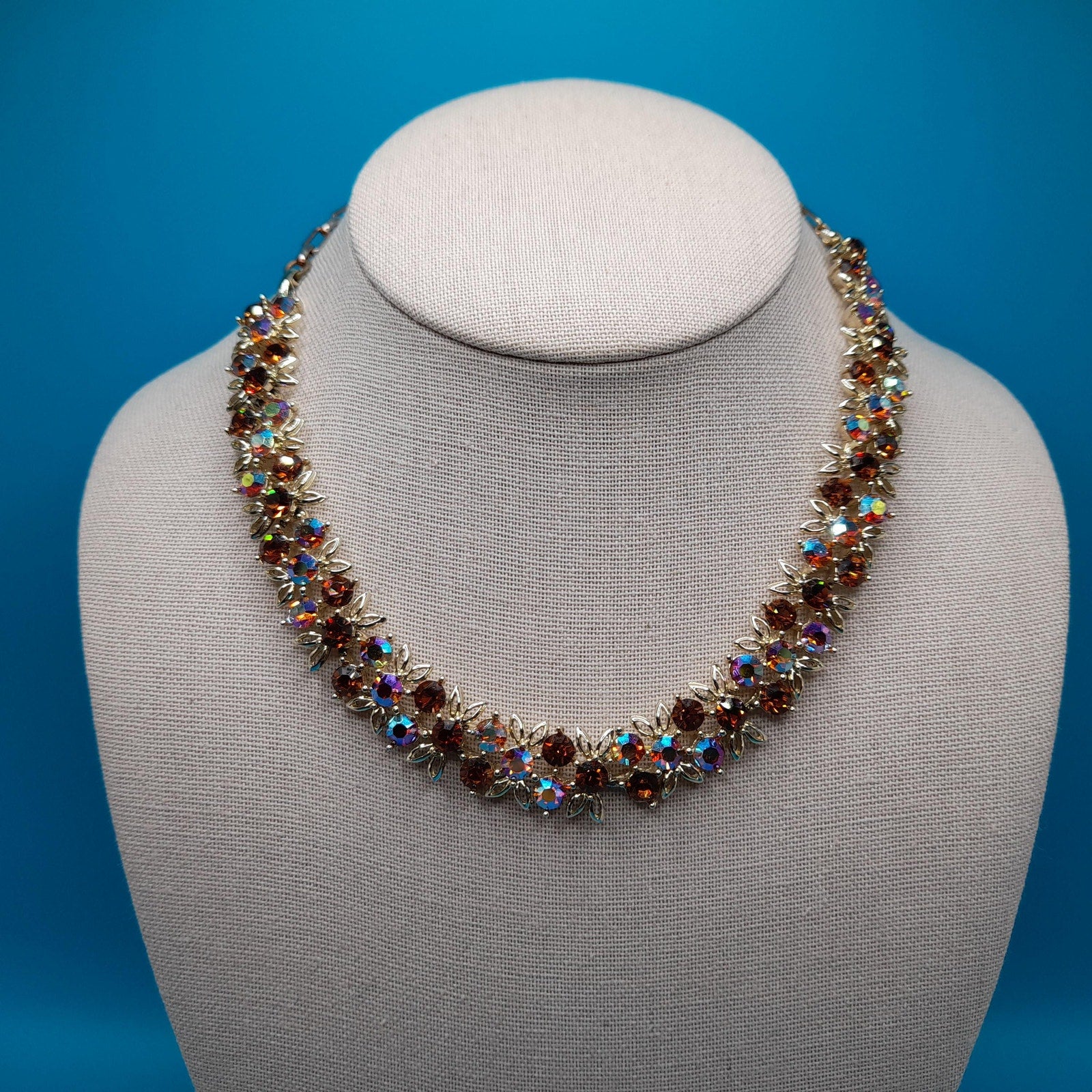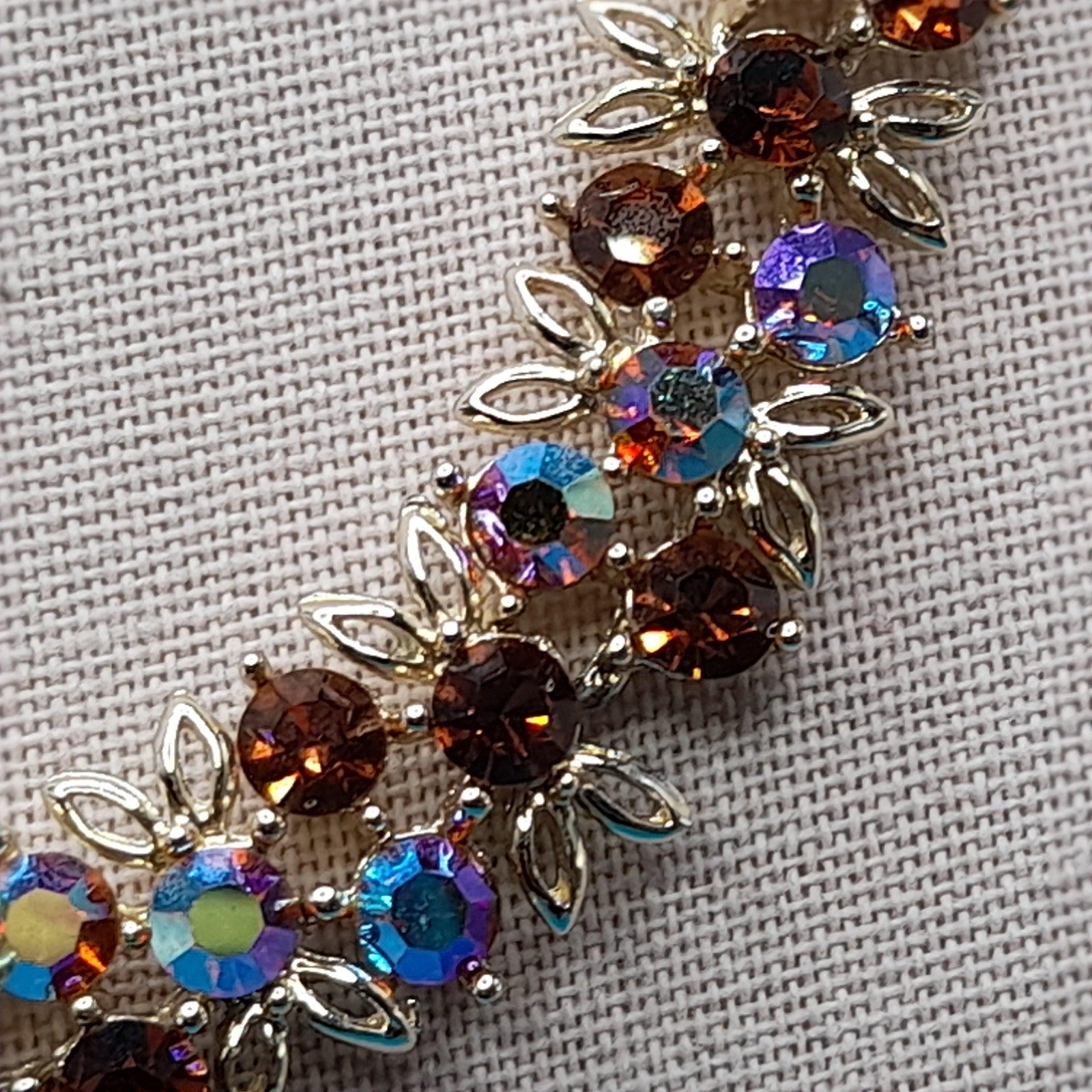 *Description: This is a beautiful mid-century vintage rhinestone choker necklace with aurora borealis topaz rhinestones and topaz rhinestones in a little darker color on a gold tone necklace from the 1960s.  Each link has six rhinestones and they are set in flower petals which makes this choker necklace elegant and full of sparkle. It would look gorgeous at any formal event.  The hook was signs but the wording was not readable after printing so the designer is unknown. This would be a great addition to your vintage jewelry collection or make a great vintage gift!