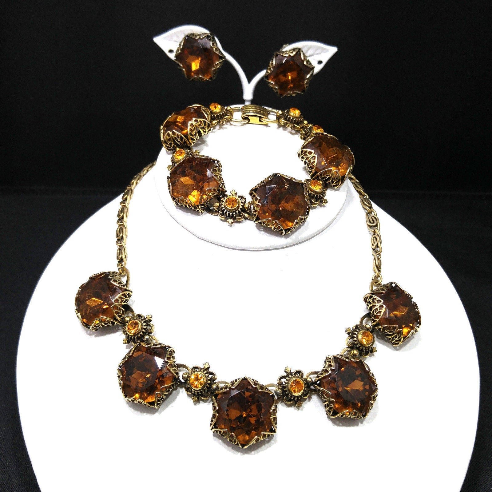 *Description: This is a very unique and beautiful vintage parure topaz glass necklace, bracelet, and clip on earrings from the 1950s. Each of the 20mm topaz faceted crystals are featured in all three pieces and have accent pieces in lighter topaz crystal 6mm rhinestones. This vintage jewelry set has filigree petals around each flower and a very unique backing. The necklace has a paperclip style chain with a hook and extension chain. The bracelet has a fold over clasp and the earrings are clips. This is a gorgeous set and would make a great addition to your vintage jewelry collection or make a great vintage gift!
