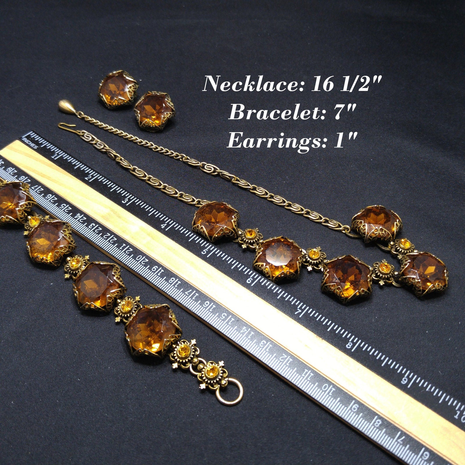 Vintage Topaz Glass Necklace Bracelet Earrings Set, Filigree Golden Brass, 1950s Vintage Jewelry