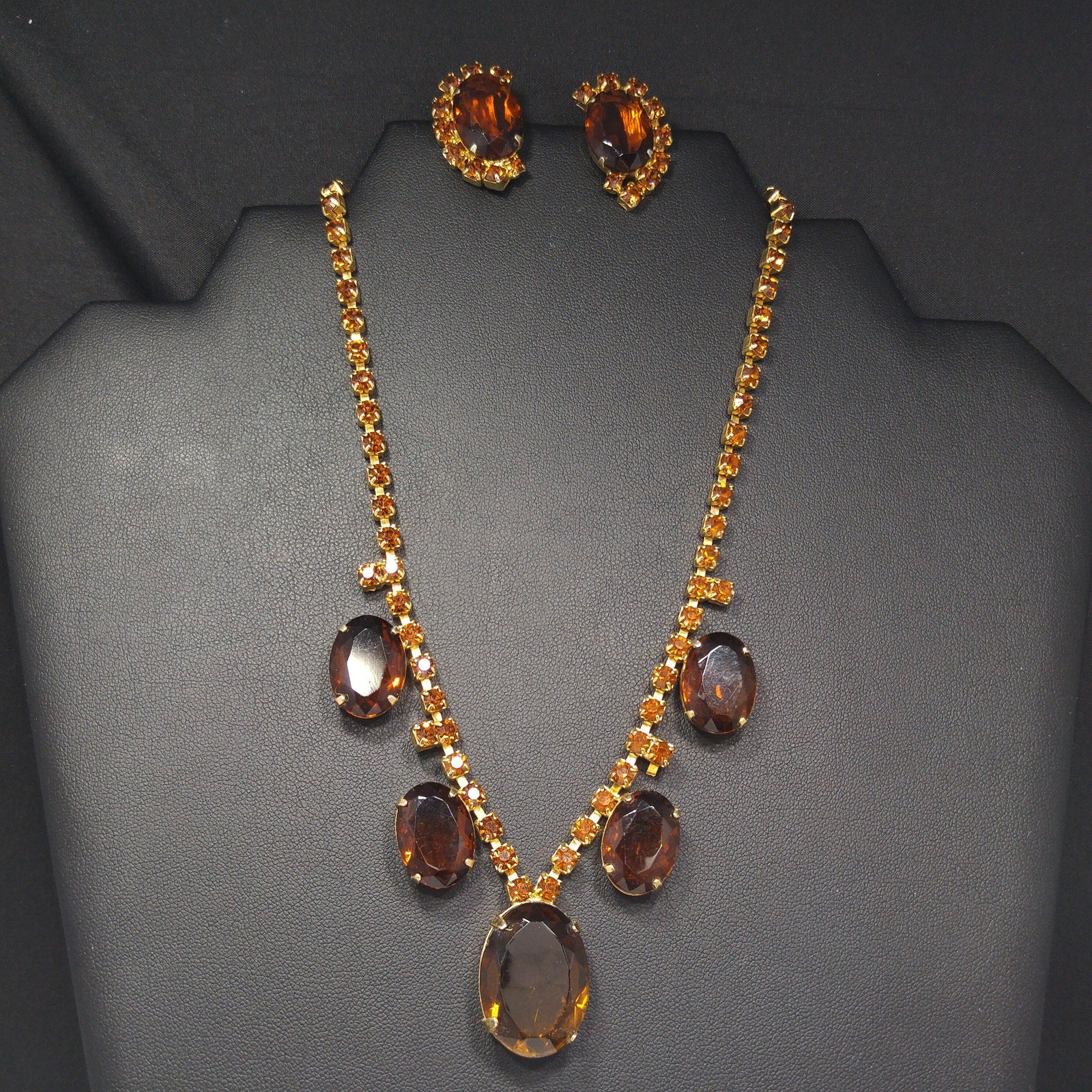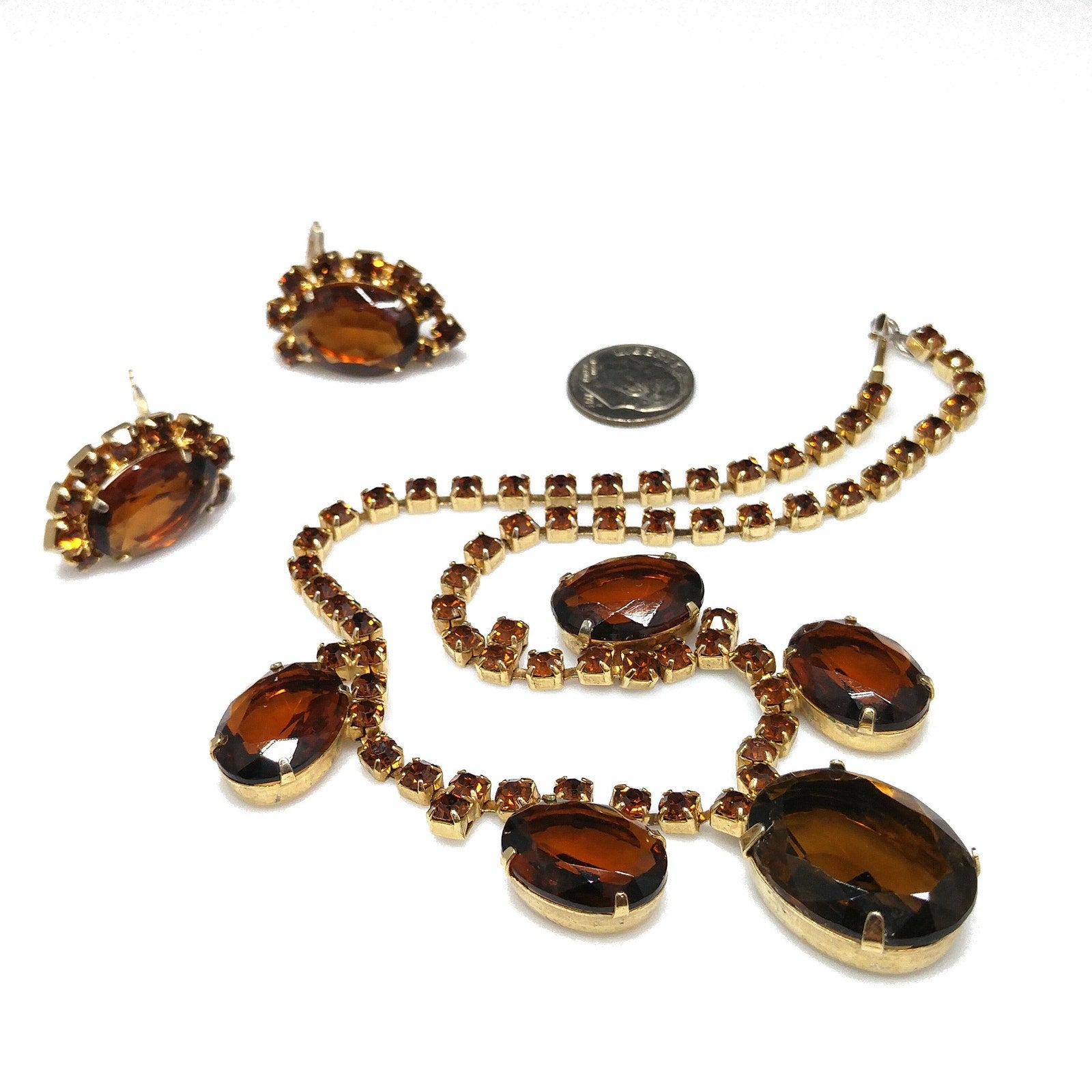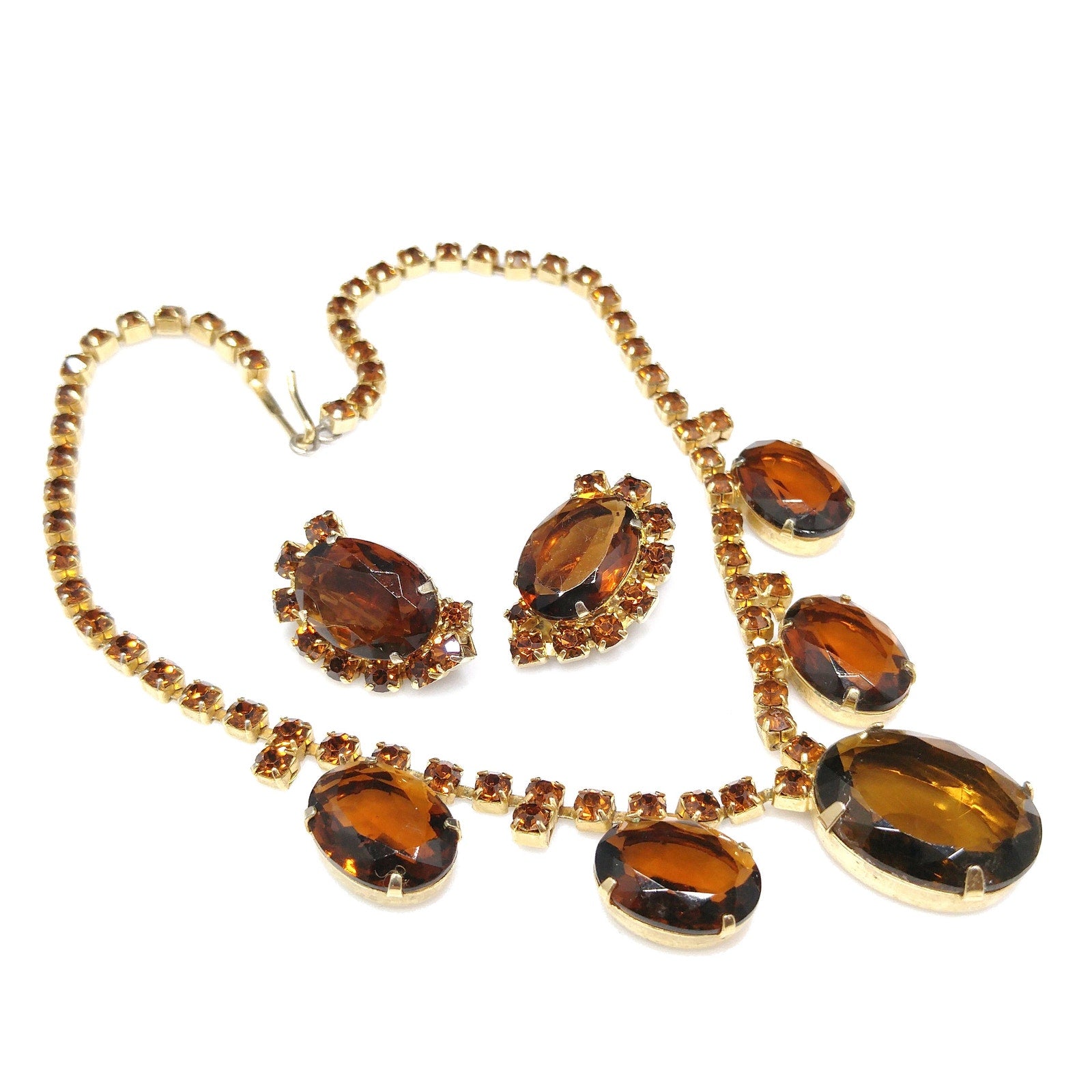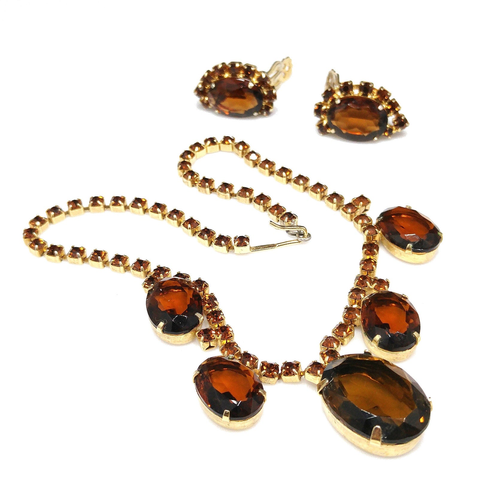 *Description: This is a beautiful topaz rhinestone necklace and matching clip on earrings from the late 1950s to 1960s. There are 4 large faceted rhinestones, two on each side of the necklace at 3/4 Inch in length. In the middle of the choker length necklace is a larger faceted topaz rhinestone at 1 Inch in length. The chain is continuous topaz rhinestones with a hook and loop closure. The earrings have the matching faceted topaz large rhinestone with small chaton cut rhinestones framing the larger stone. The metal backing has a layer of gold plating and all of the larger rhinestones are open back which will allow the light to pass through. This would be a great addition to your vintage jewelry collection or make a great vintage gift!