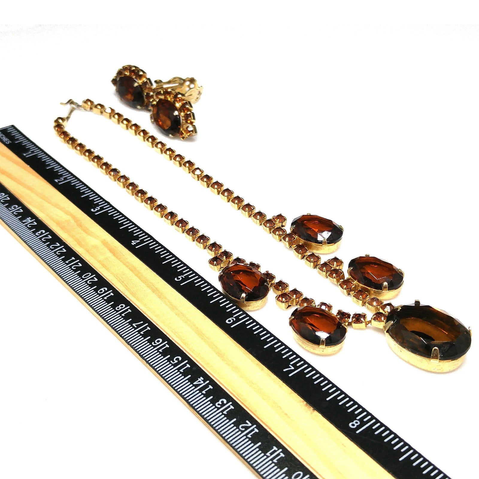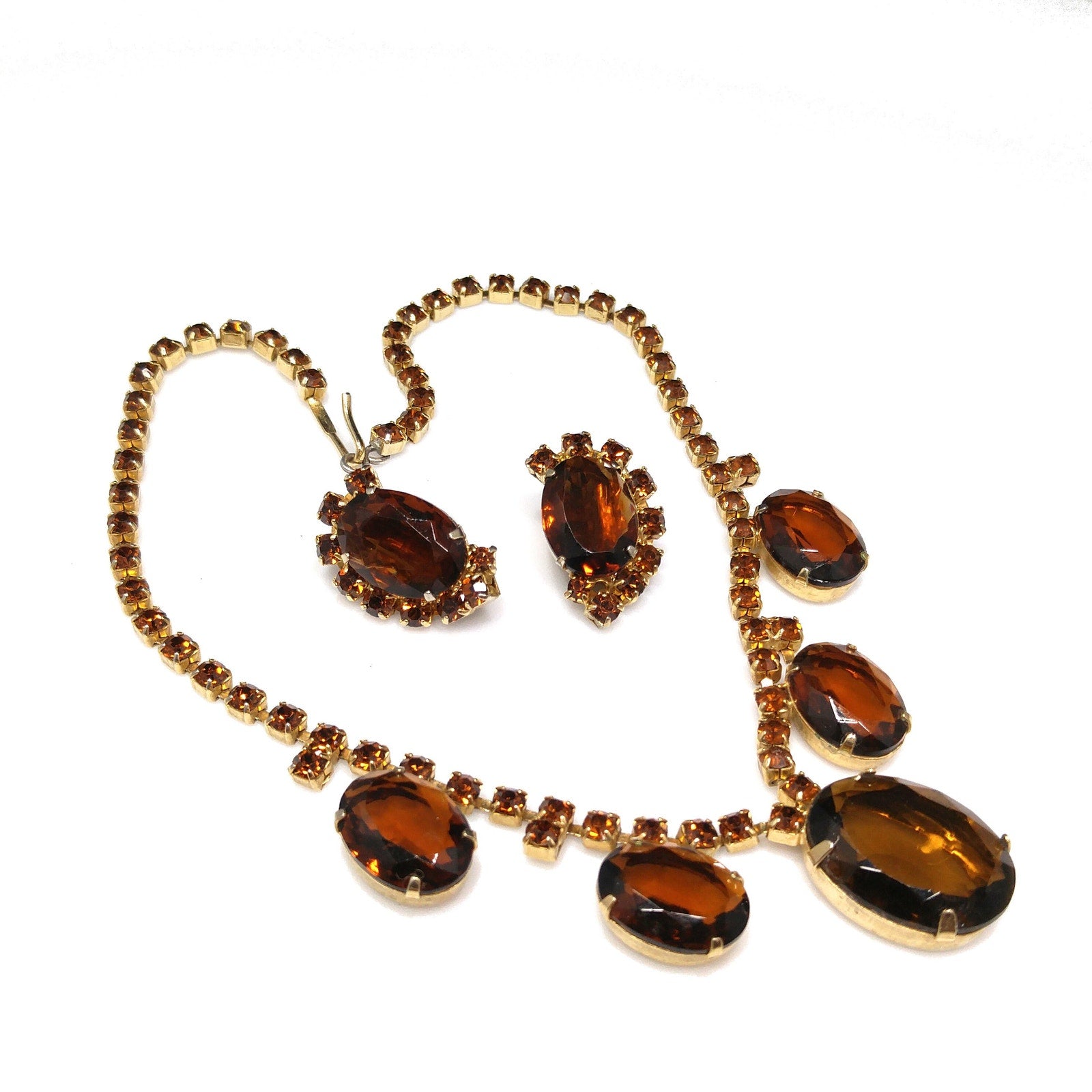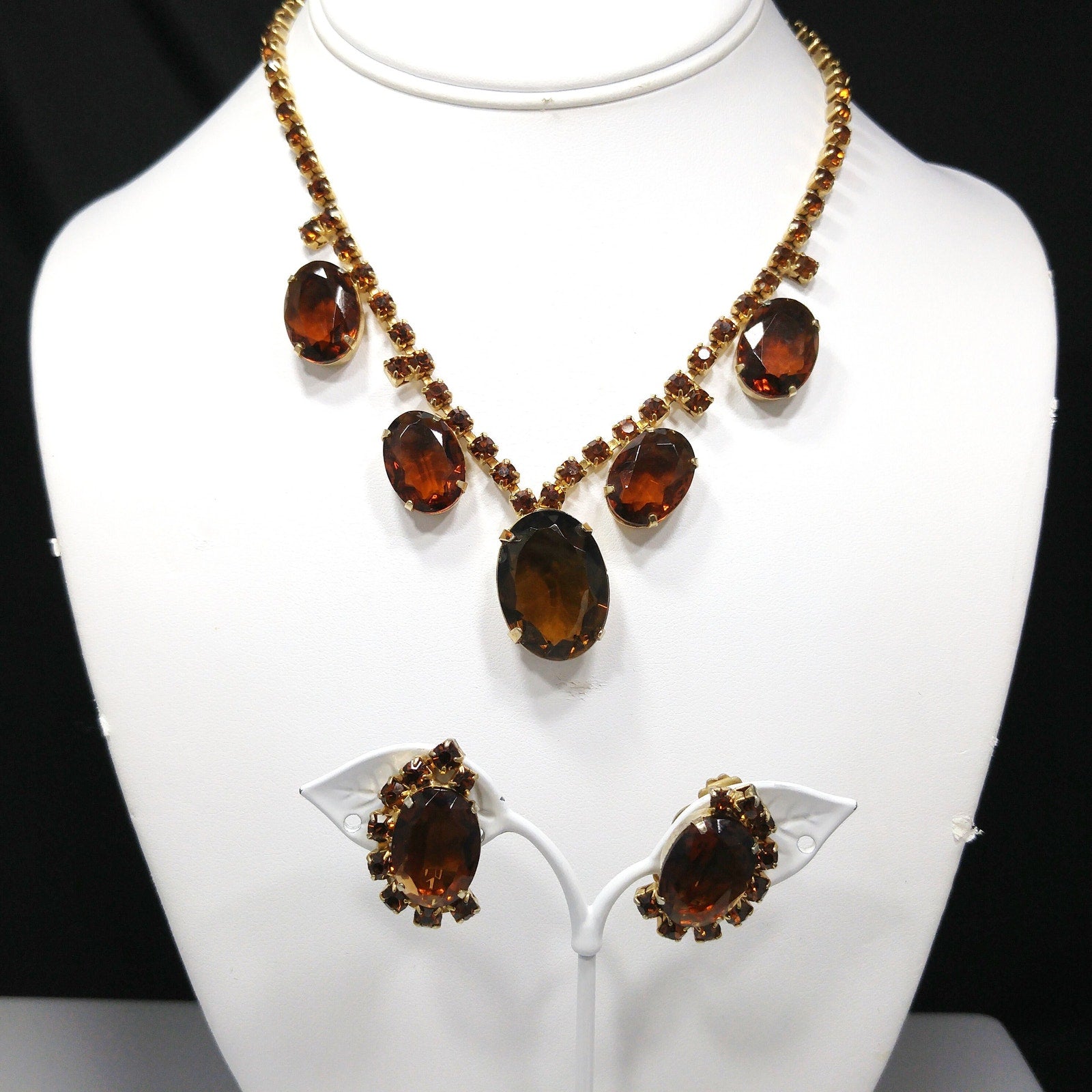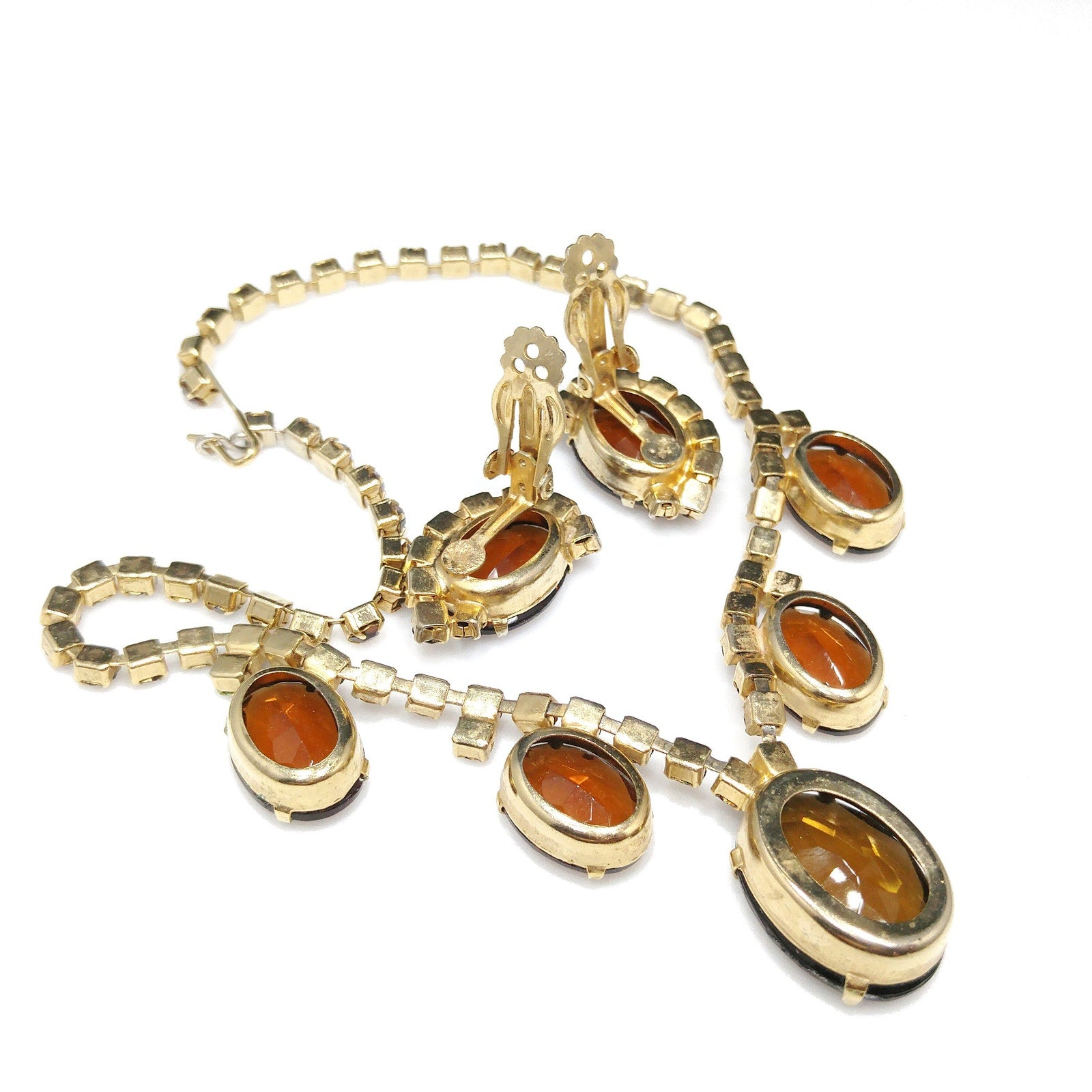 *Description: This is a beautiful topaz rhinestone necklace and matching clip on earrings from the late 1950s to 1960s. There are 4 large faceted rhinestones, two on each side of the necklace at 3/4 Inch in length. In the middle of the choker length necklace is a larger faceted topaz rhinestone at 1 Inch in length. The chain is continuous topaz rhinestones with a hook and loop closure. The earrings have the matching faceted topaz large rhinestone with small chaton cut rhinestones framing the larger stone. The metal backing has a layer of gold plating and all of the larger rhinestones are open back which will allow the light to pass through. This would be a great addition to your vintage jewelry collection or make a great vintage gift!