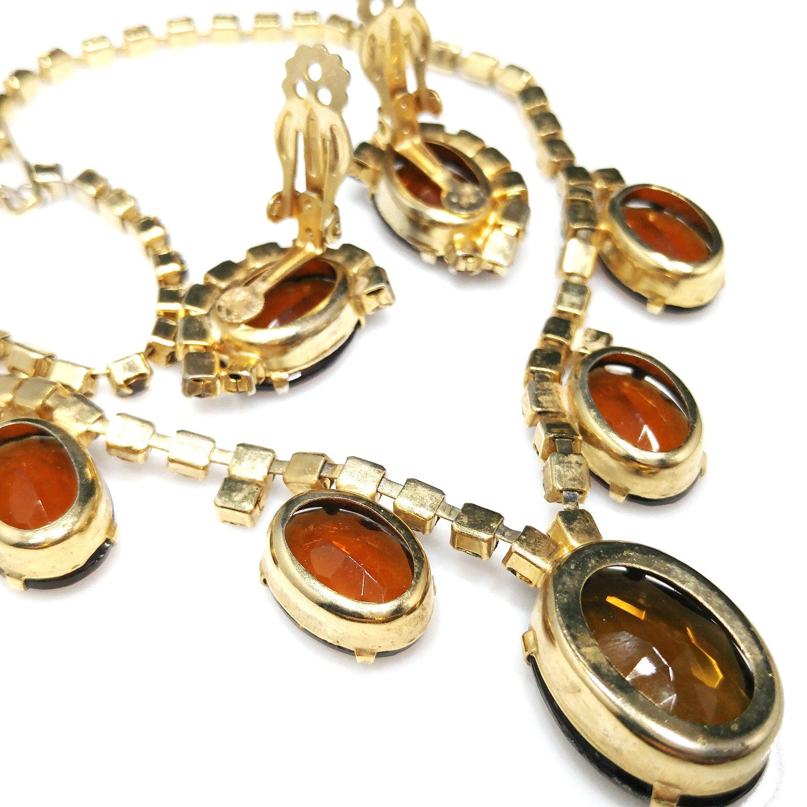 Vintage Topaz Rhinestone Necklace & Earrings, Large Faceted Rhinestones, 1960s Vintage Jewelry
