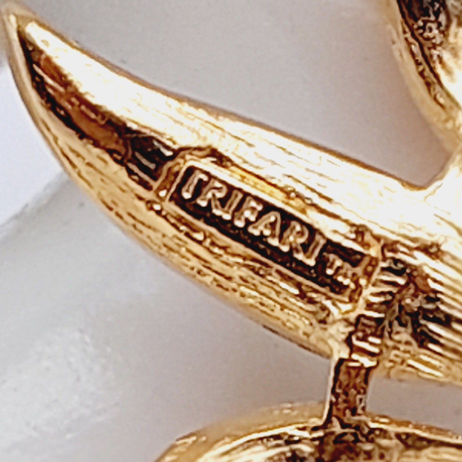 The soft pink rhinestone catches the light beautifully, offering just the right amount of shimmer. This piece is signed Trifari™, indicating it was made after 1955—part of the era when the brand became known for its elegant and feminine costume jewelry.