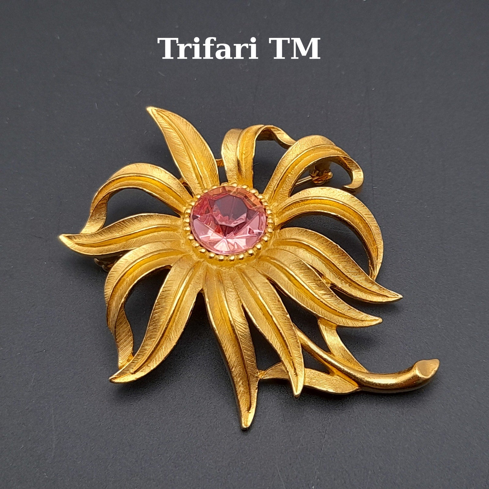 Add a touch of vintage charm with this lovely Trifari™ flower brooch, featuring a delicate bloom design and a sparkling pink rhinestone center. Crafted with Trifari’s signature attention to detail, the petals are gracefully layered and textured, creating a dimensional floral silhouette that’s both timeless and eye-catching.